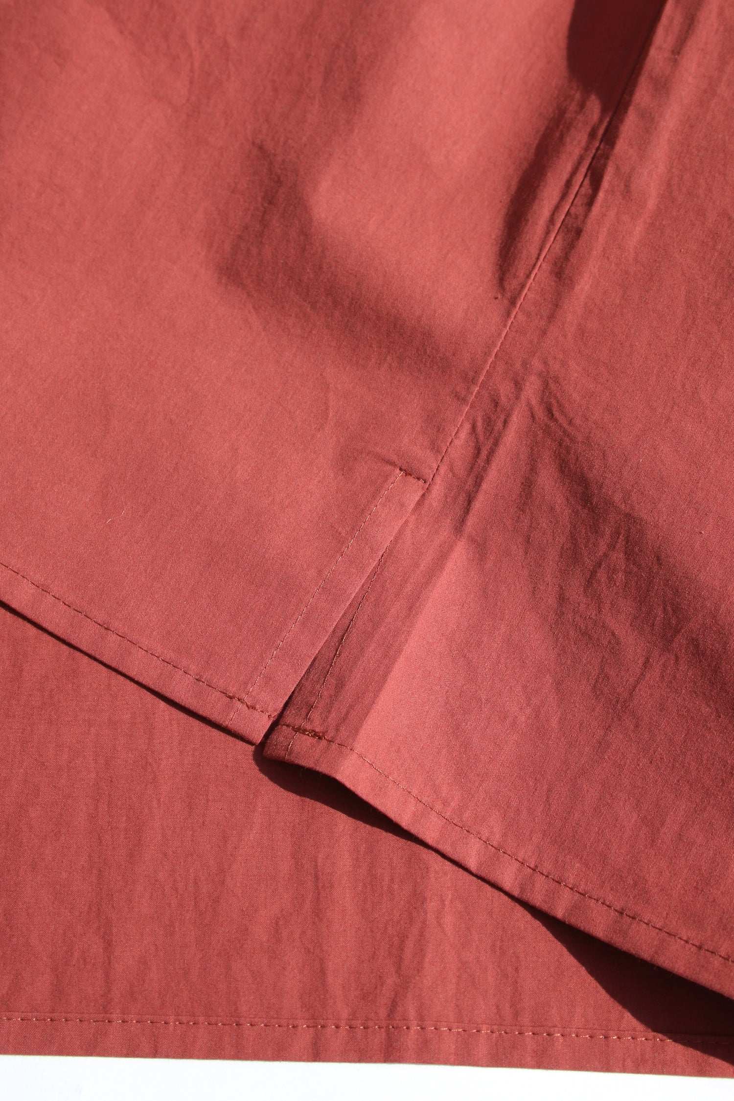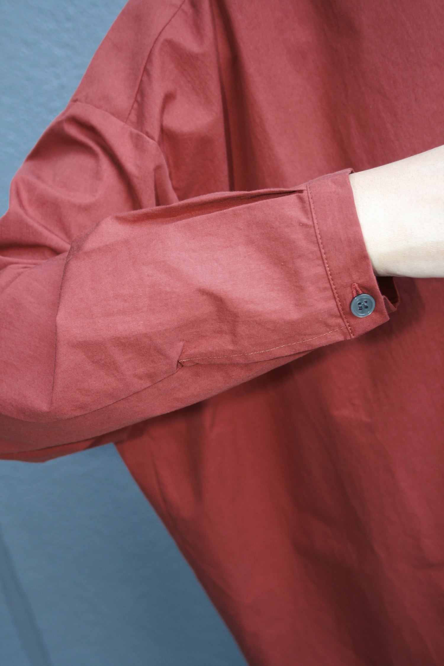 Basisbroek aesthetic short collar shirt in two colors - HARISSA (red brown), TITAN (grey brown), crafted from super soft and supple high density cotton. Constructed with an oversized shape, narrow buttoned cuffs and minimal designs without chest pockets. Neat and unisex shirt for all the seasons.