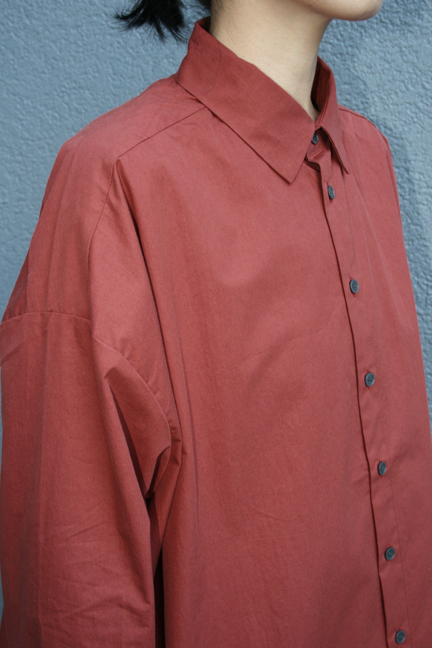 高密度のコットンを使用したBASISBROEK定番オーバーサイズROYシャツの新色:HARISSA (レッドブラウン)、TITAN (グレーブラウン)。細めのカフス / 小さめの襟 / 脇のスリット開きが特徴。胸ポケットは無し。 身幅をワイドに設定することでドレープを生み、程良いミニマル感を表現。スッキリとしたシルエットに見えますが身幅はたっぷり動きやすく快適なサイズ感です。ベーシックなフォルムをオーバーサイズに設計し、ユニセックスに仕上げました。