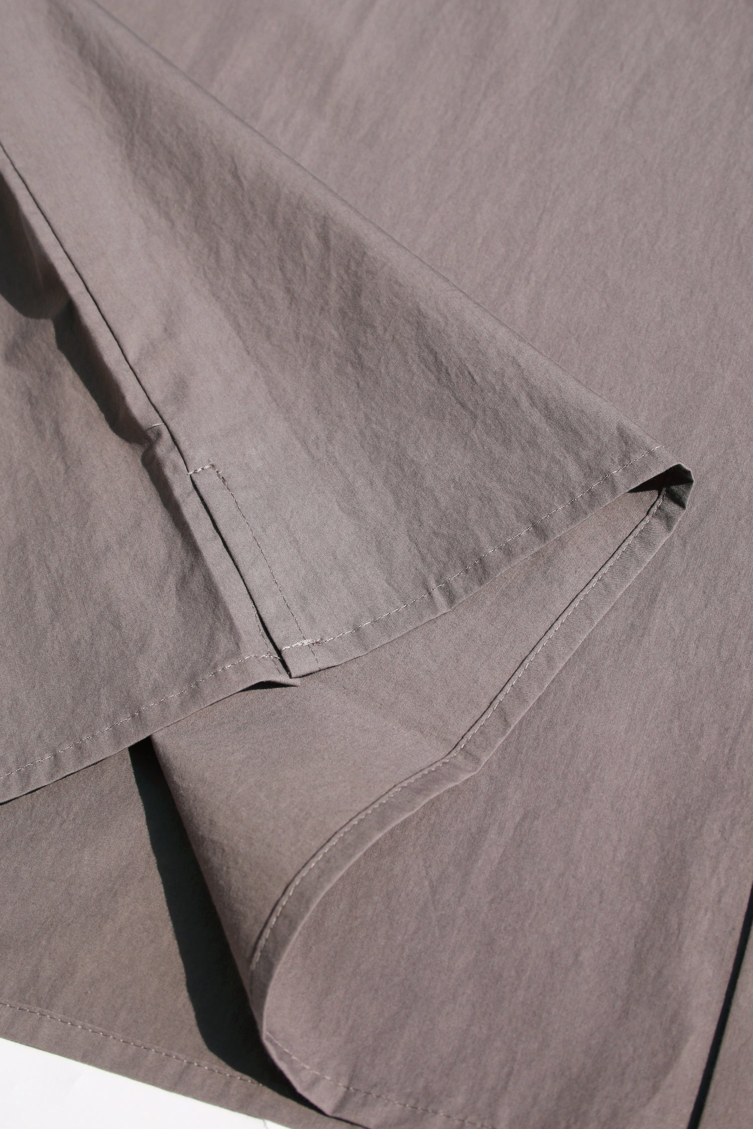 Basisbroek aesthetic short collar shirt in two colors - HARISSA (red brown), TITAN (grey brown), crafted from super soft and supple high density cotton. Constructed with an oversized shape, narrow buttoned cuffs and minimal designs without chest pockets. Neat and unisex shirt for all the seasons.