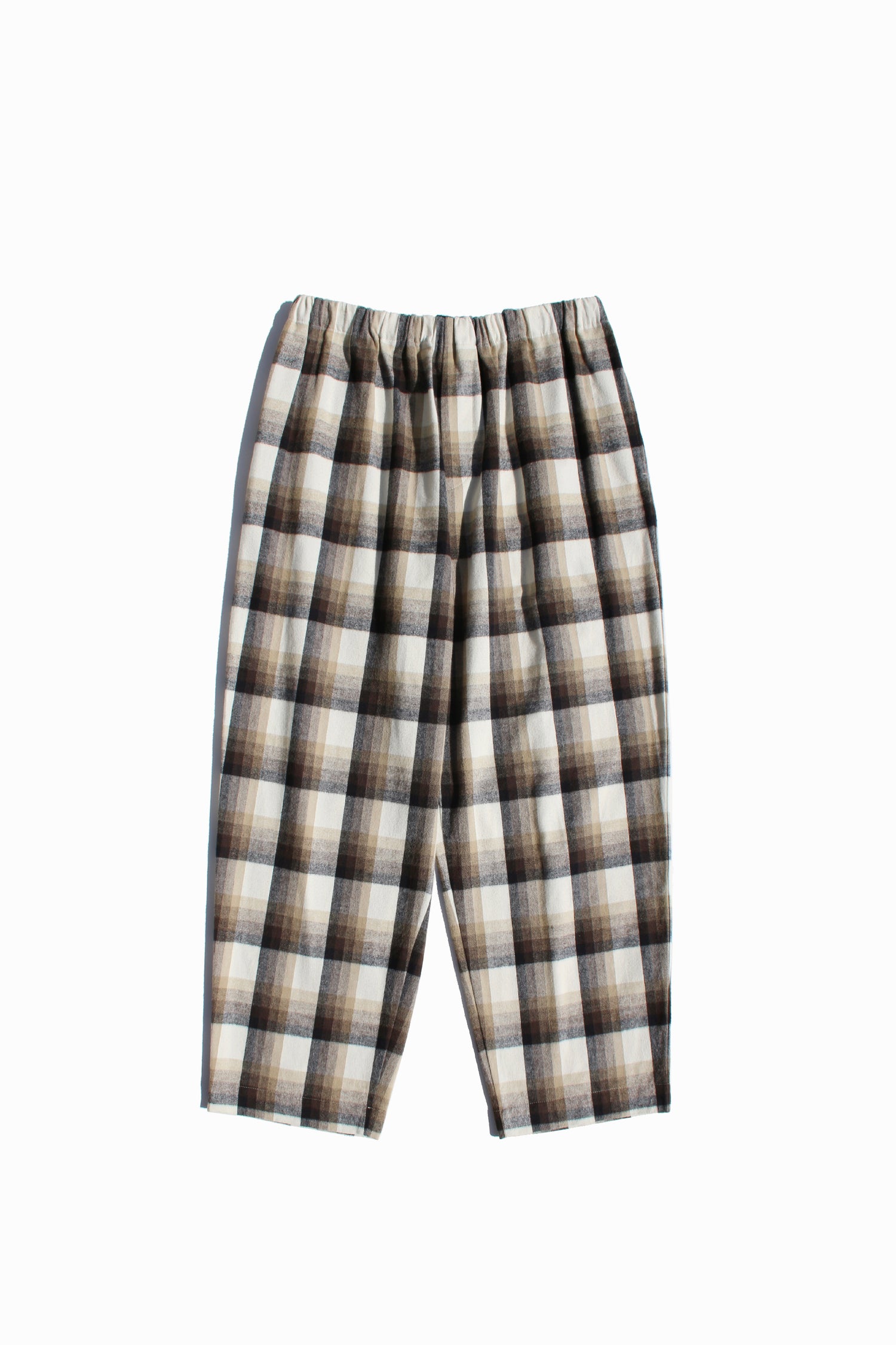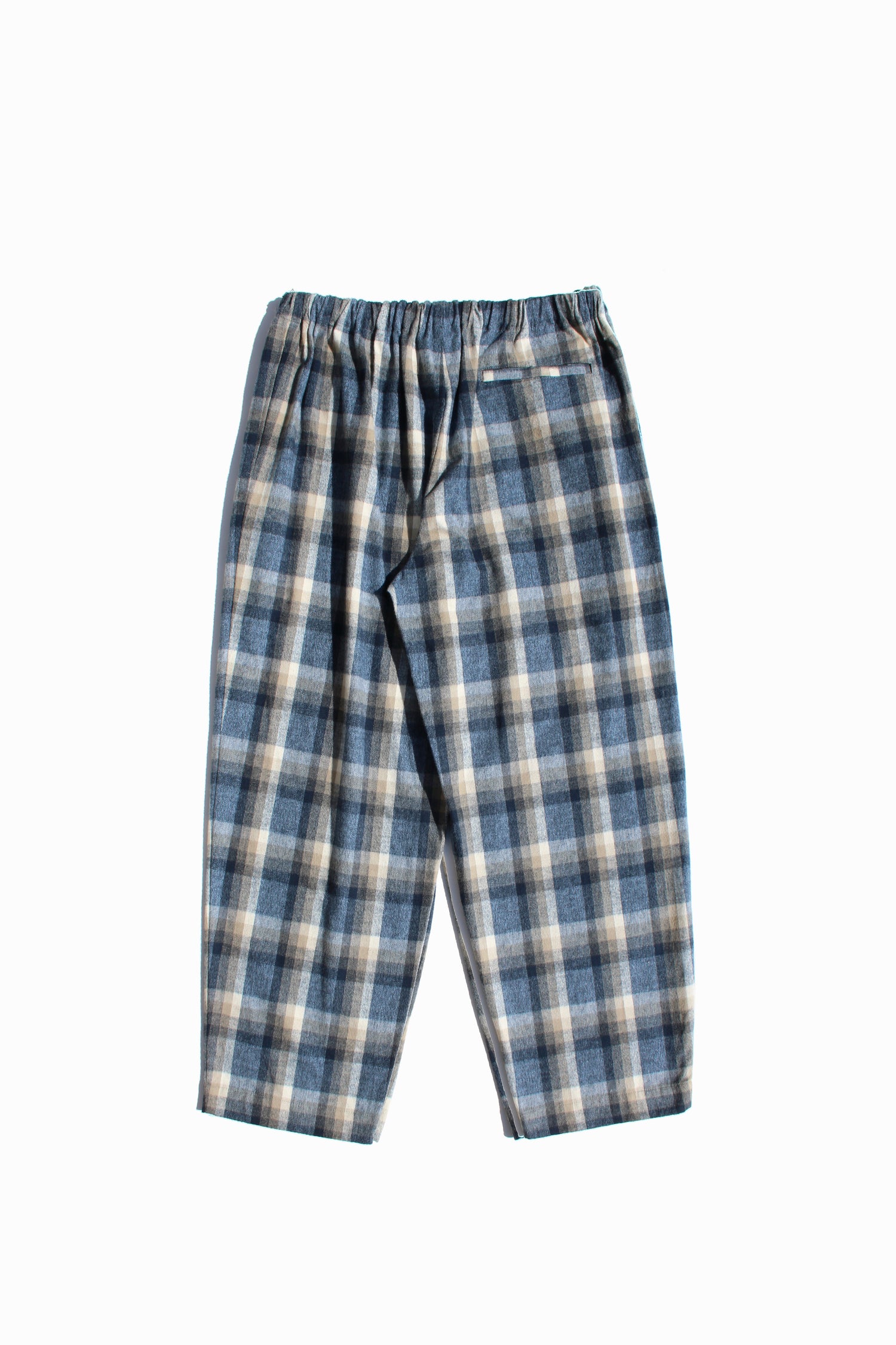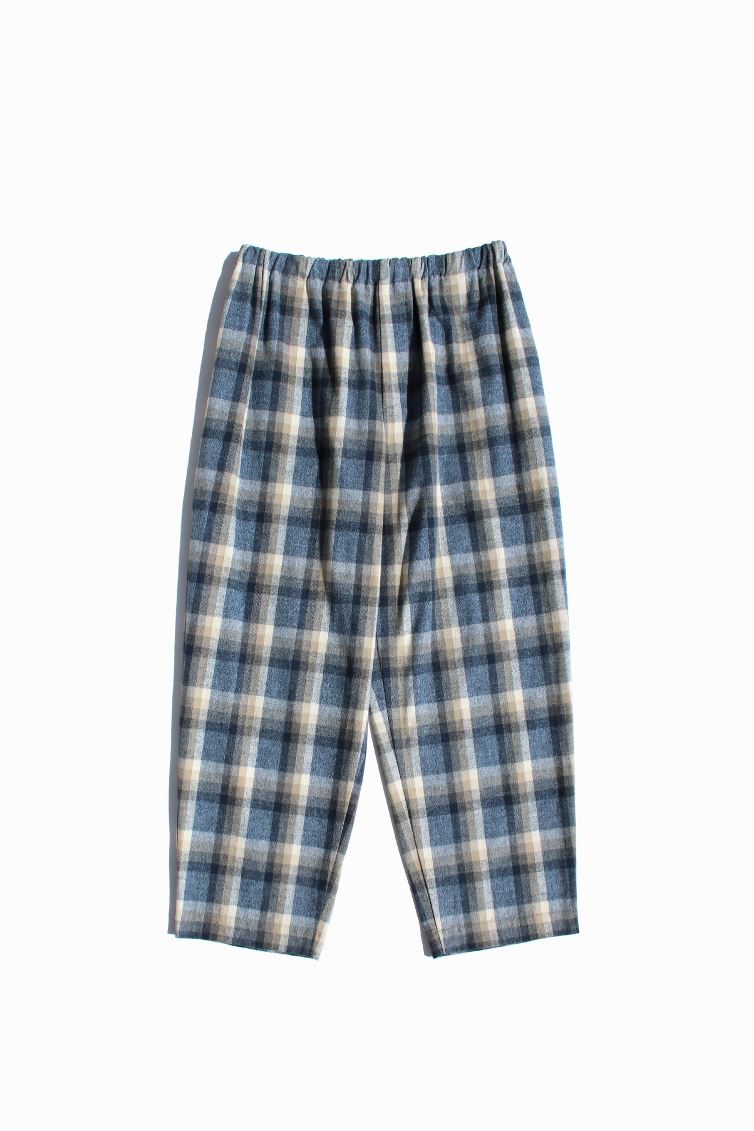 チェック柄の100%コットンを使用した快適なシャギーメランジイージーパンツです。軽い履き心地と肌触りの良さも魅力です。軽くテーパードを効かせスッキリした印象に。ウエストはゴムとドローコード付きのイージータイプ。両サイドにはポケットを配備しています。オールシーズン着用可能。同シリーズのチェックESSEN JACKET (BEIGE CHECK, BLUE CHECK)とセットアップでの着用がオススメです。