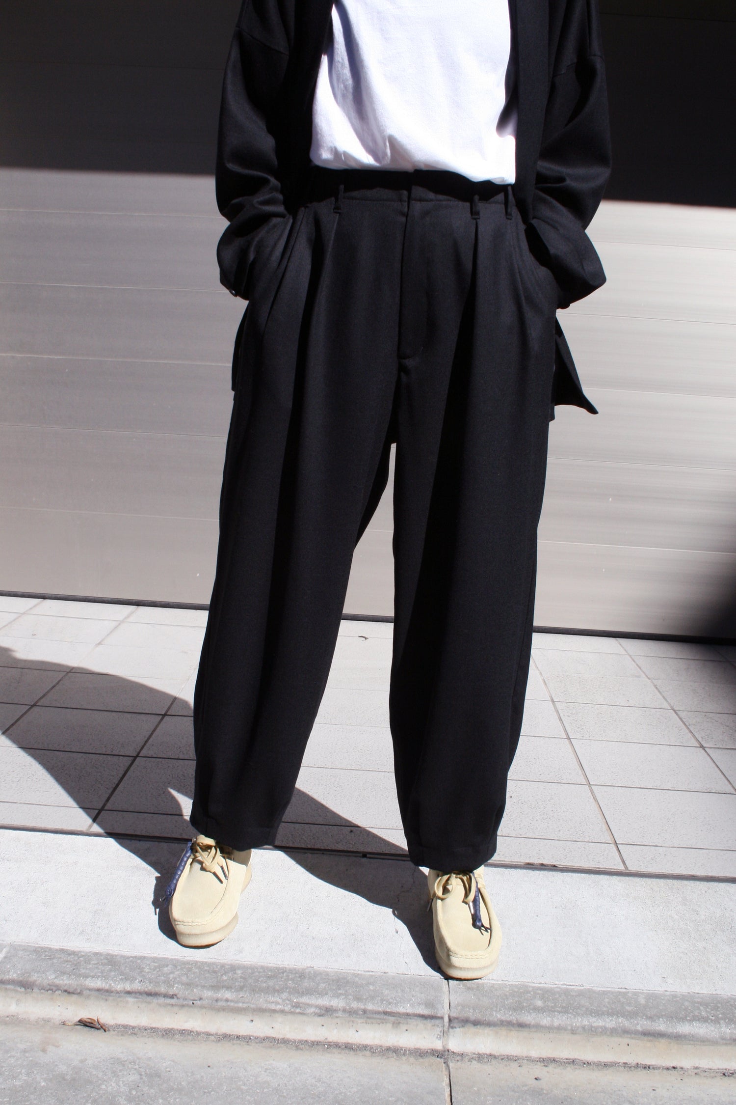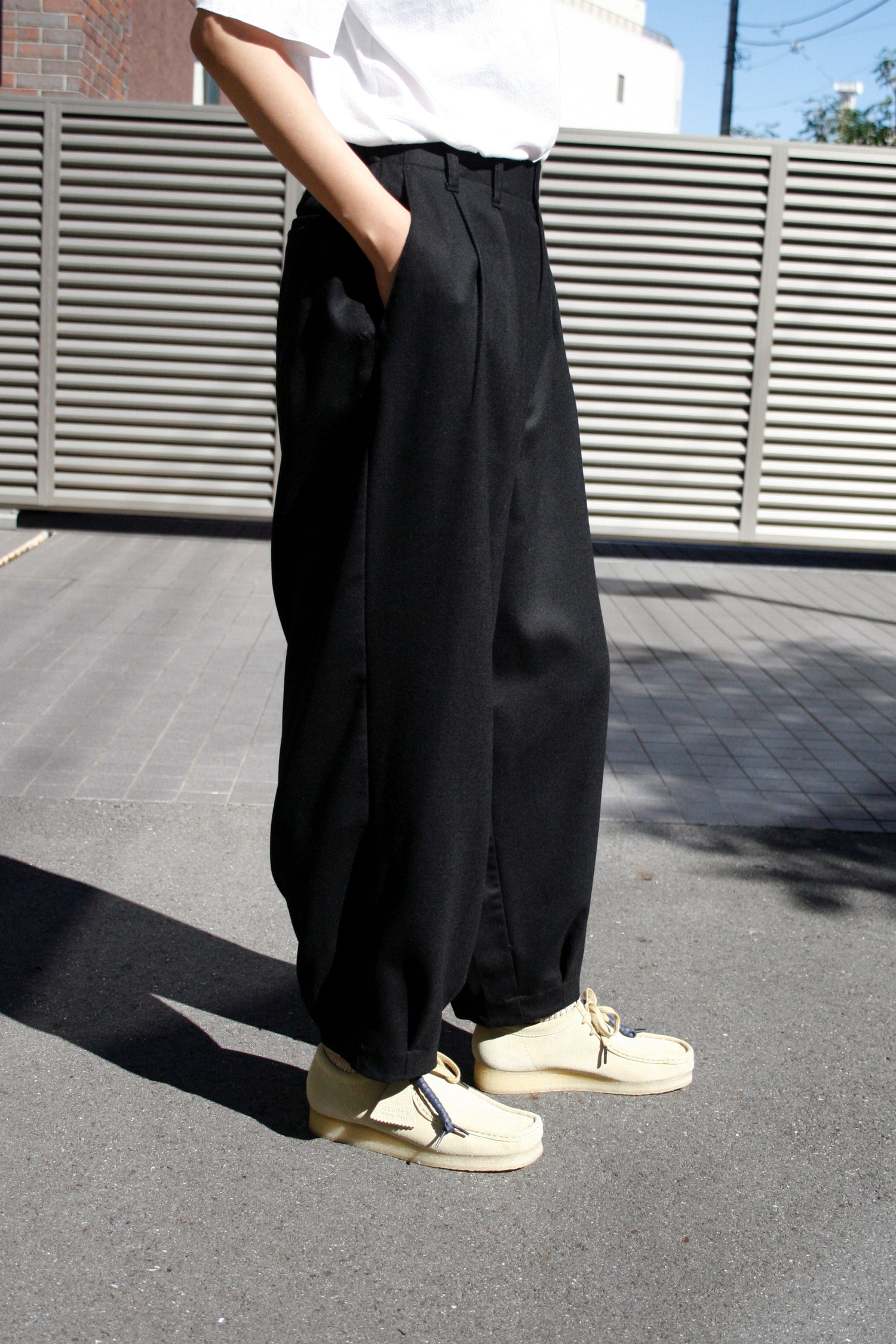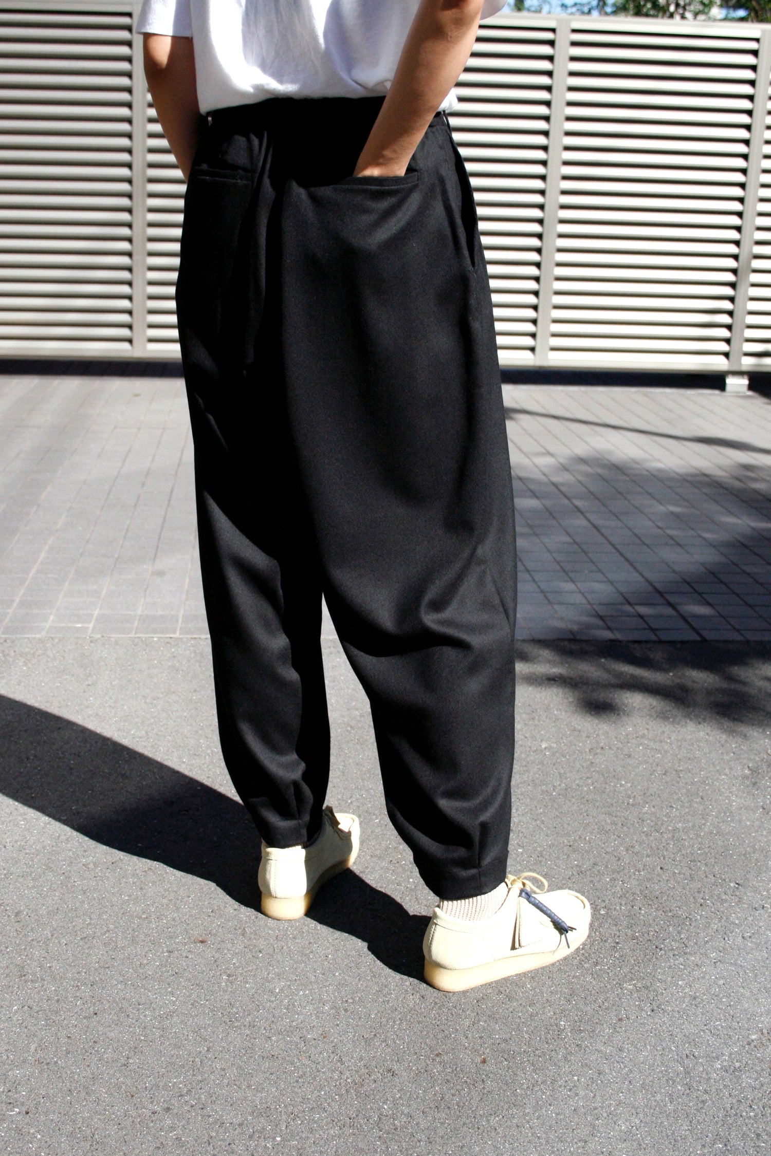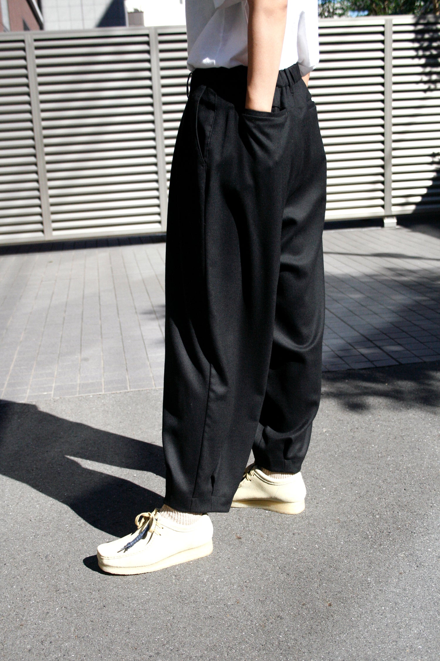 BASISBROEKよりトラッドな雰囲気のウールゴファンパンツ。ウールの奥行きのある表情と適度に中肉厚のしっかりした生地なので履き心地にも安心感があります。シルエットは上品なワイドシルエット。裾元にシェイプをかけ、股上を深めに取った丸みのあるシルエットライン。ワイドな形と適度なストレッチは一度穿いたら虜になってしまう、リラックスフィットイージーパンツ。両サイドポケット、バックポケット付き。スニーカーからビジネスシューズまでこなせるマルチなパンツです。黒いパンツは何本も持っている人にオススメです。同素材のLUCHIブルゾン(ブラック、ブラウンチェック)とのセットアップもおすすめです。