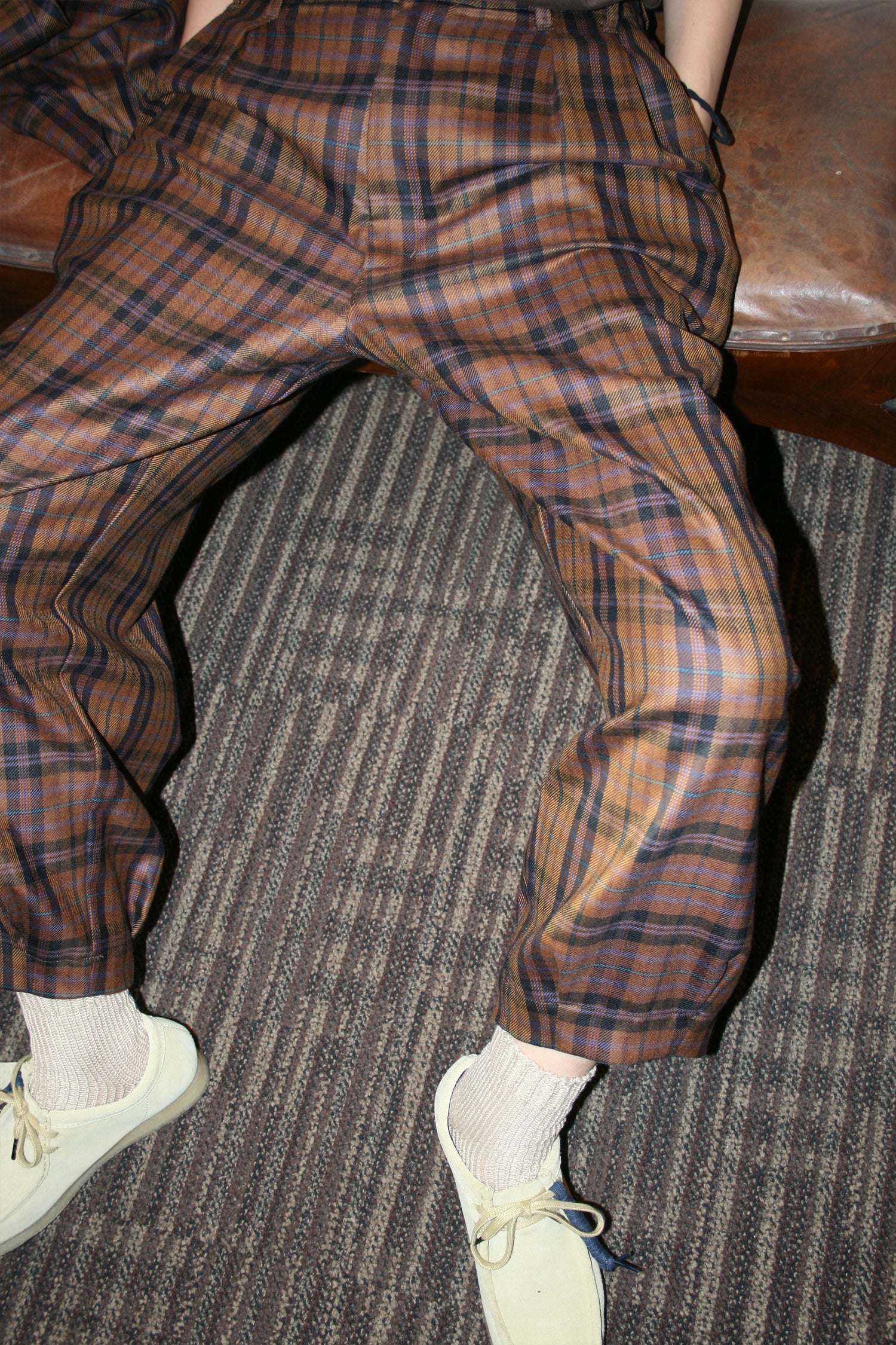 Unisex two-tuck easy pants in lightweight pure wool. Seen here in tartan plaid toned in brown and navy with a very soft surface. Finished with a relaxed and loose leg silhouette. Detailing with a generous rise, two side and back pockets. Wide, comfortable, utility pants for all ages.