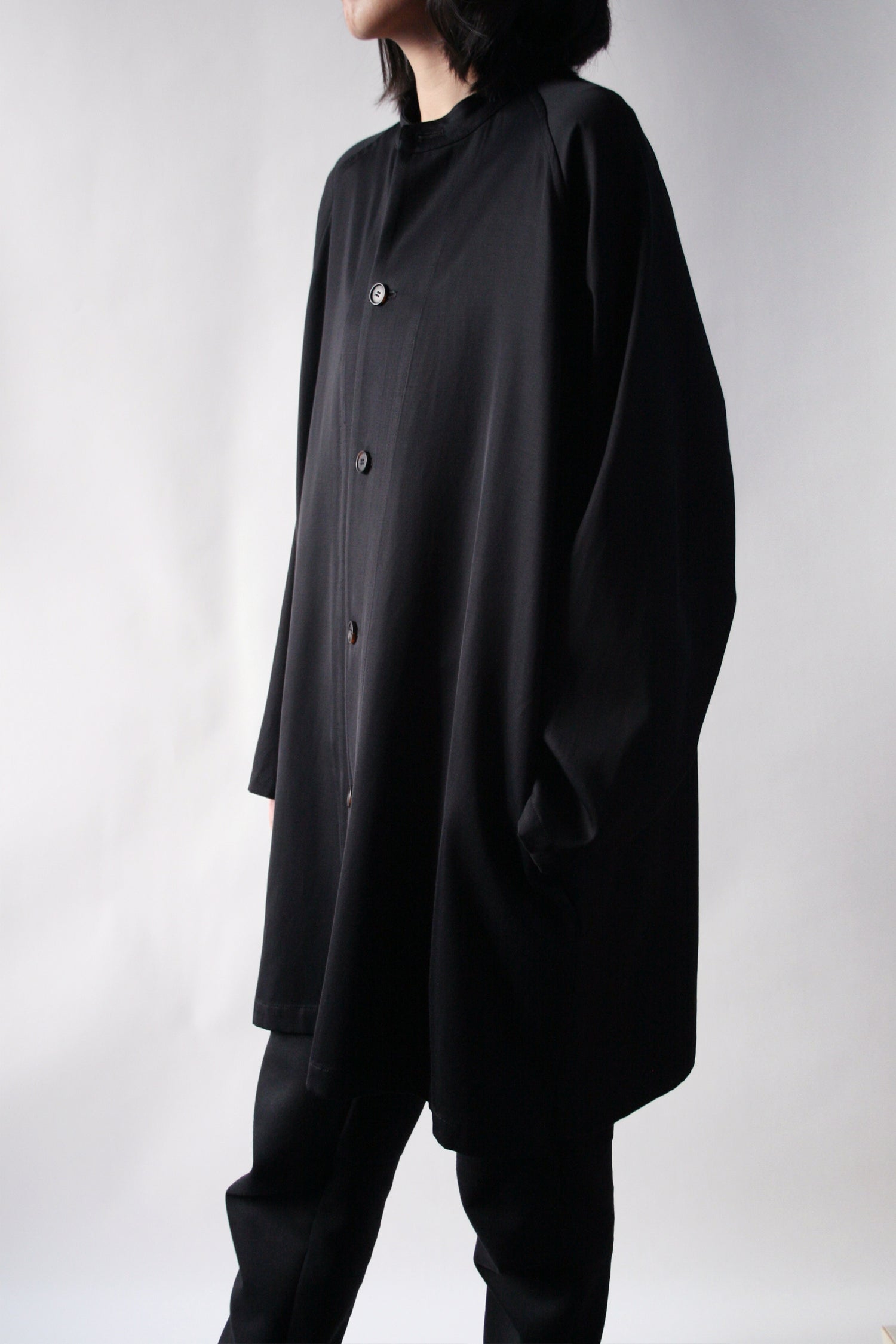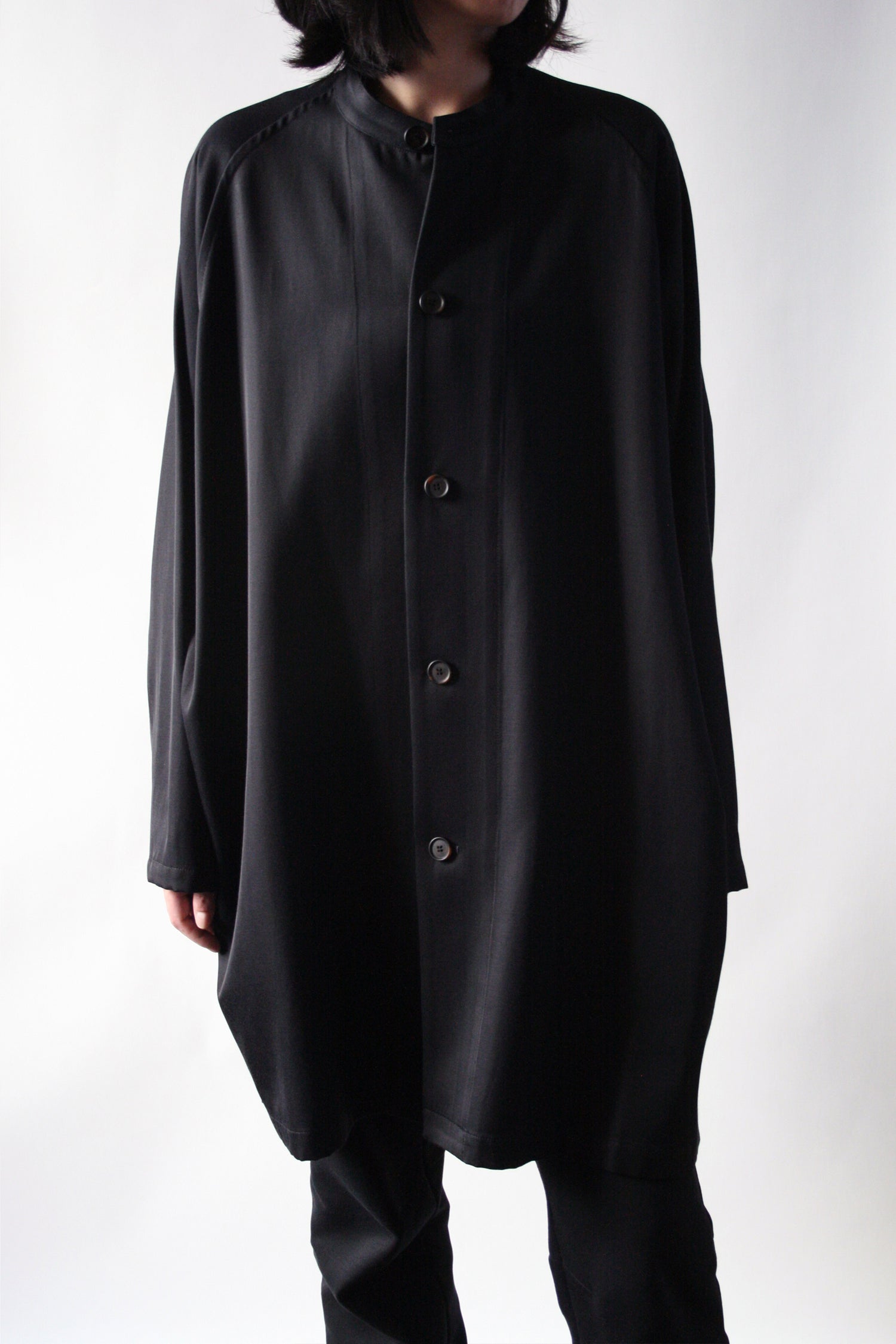 シンプルでミニマルな絶妙サイズ感の2サイズによるスタンドカラージャケットコート。レーヨンコットン独特の風合い、落ち感、柔らかさを感じていただけます。ゆったりとしたオーバーシルエット。衿が立てられる仕様で、春先から晩秋着用できるオススメの1着です。ぜひ、着てみてくださいね。