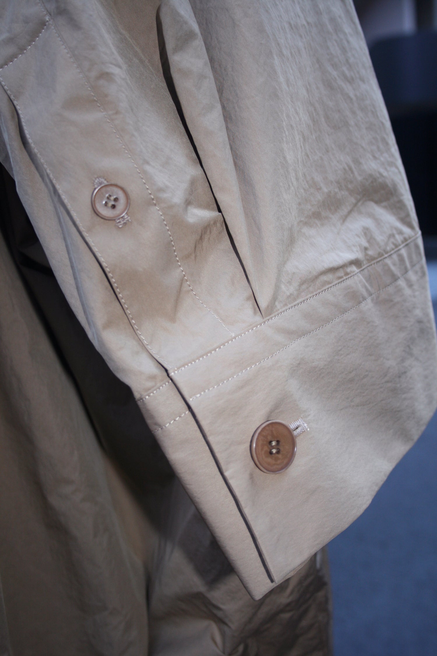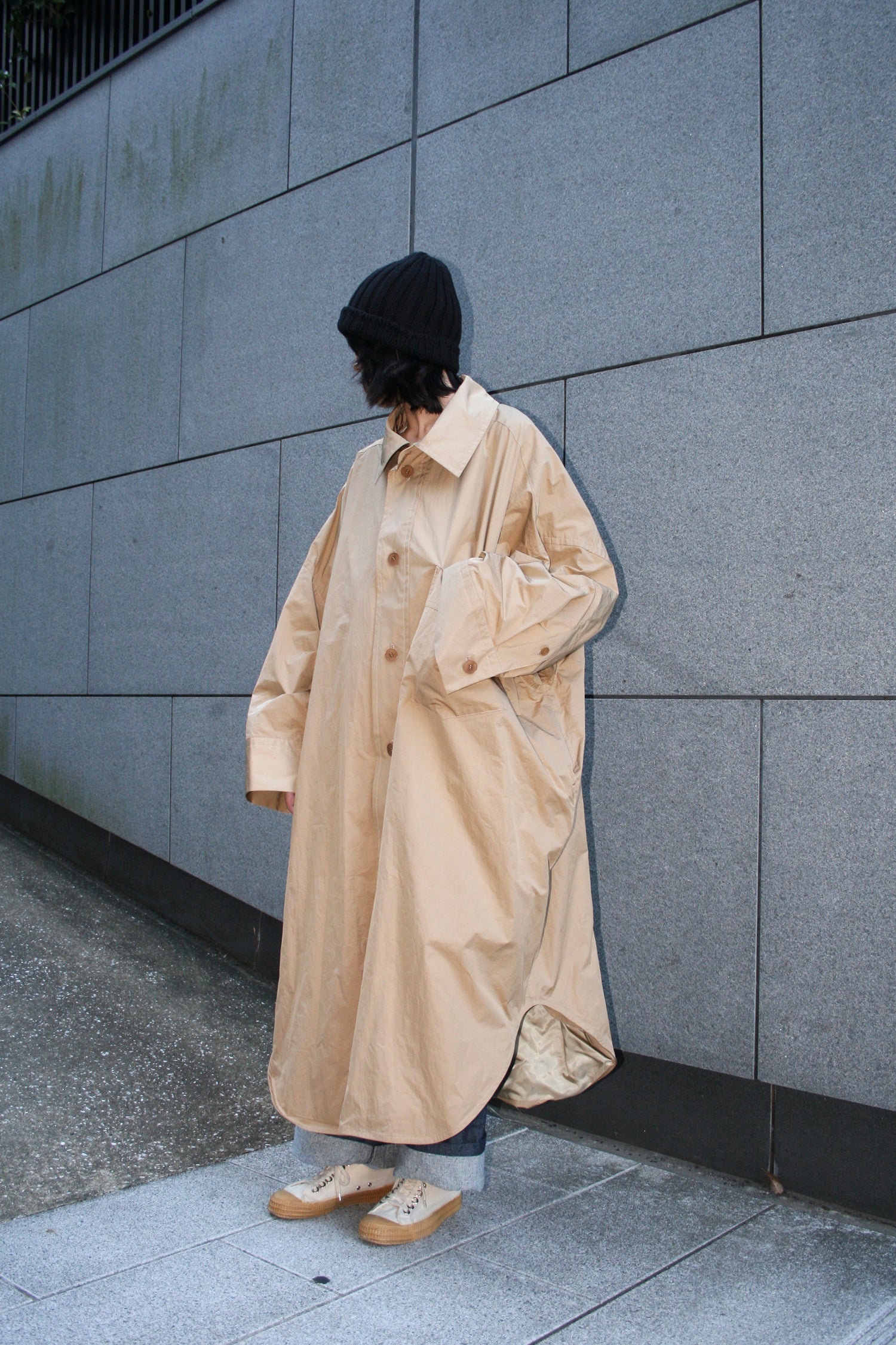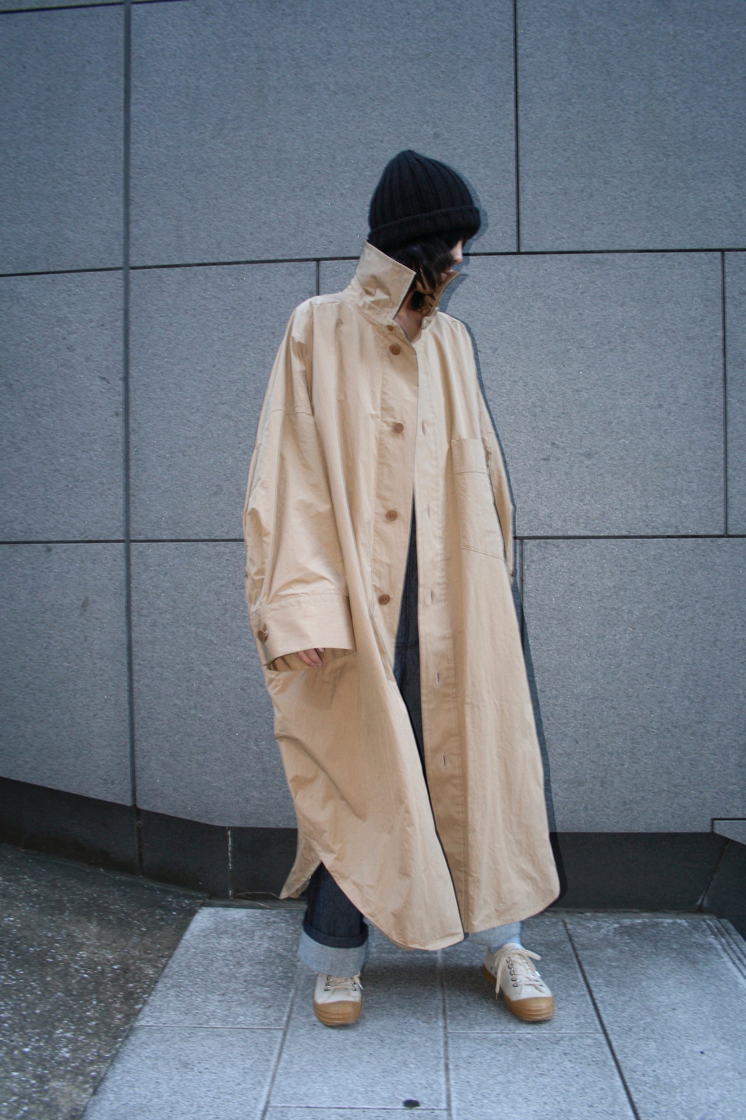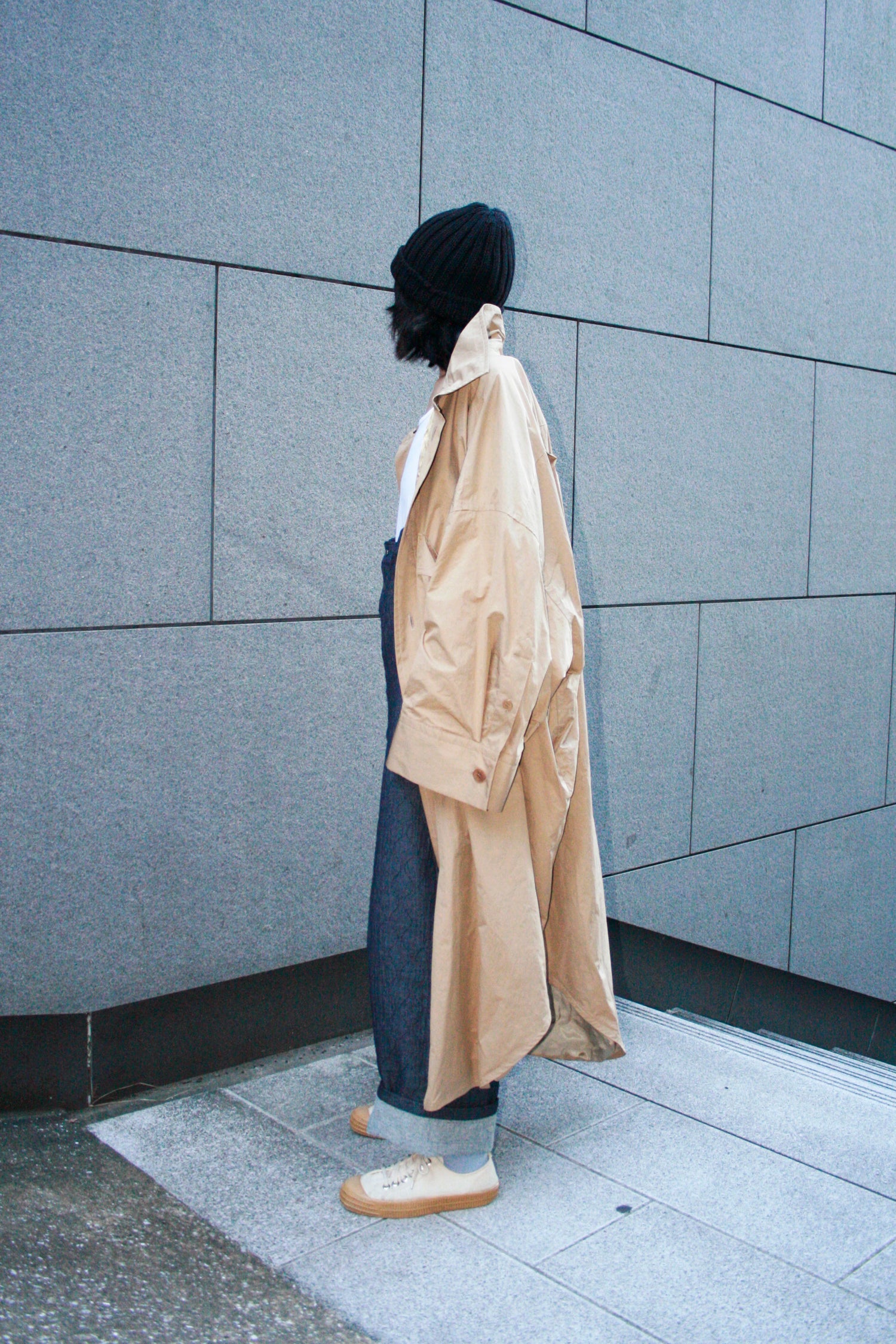 上質なナイロンとポリエステルを用いたユニセックスコート。シャツシルエットで、たっぷりとしたボリュームのあるビッグシルエット、ゆったりとした袖が特徴のデザインコート。生地によって、春、秋は羽織として、冬は中に何でも着込めるサイズ感なので、長い時期着用可能。大きな胸ポケットがあり、機能性も抜群です。 サイドポケット2ヶ配備。内側に滑らかなライニングがあり、秋冬日でも、着替えやすいウールセーターが楽しめるアイテムです。ボディラインを綺麗に見せるシルエットの美しさが魅力です。オーバーサイズなのでバランスを自在に楽しめます。同じシリーズチェックコートでの着用もオススメです。共地を使用したブラックコートHBB BASTARD COATとブラックパンツGUMMIZUGHOSE <GEBEULT>もございます。