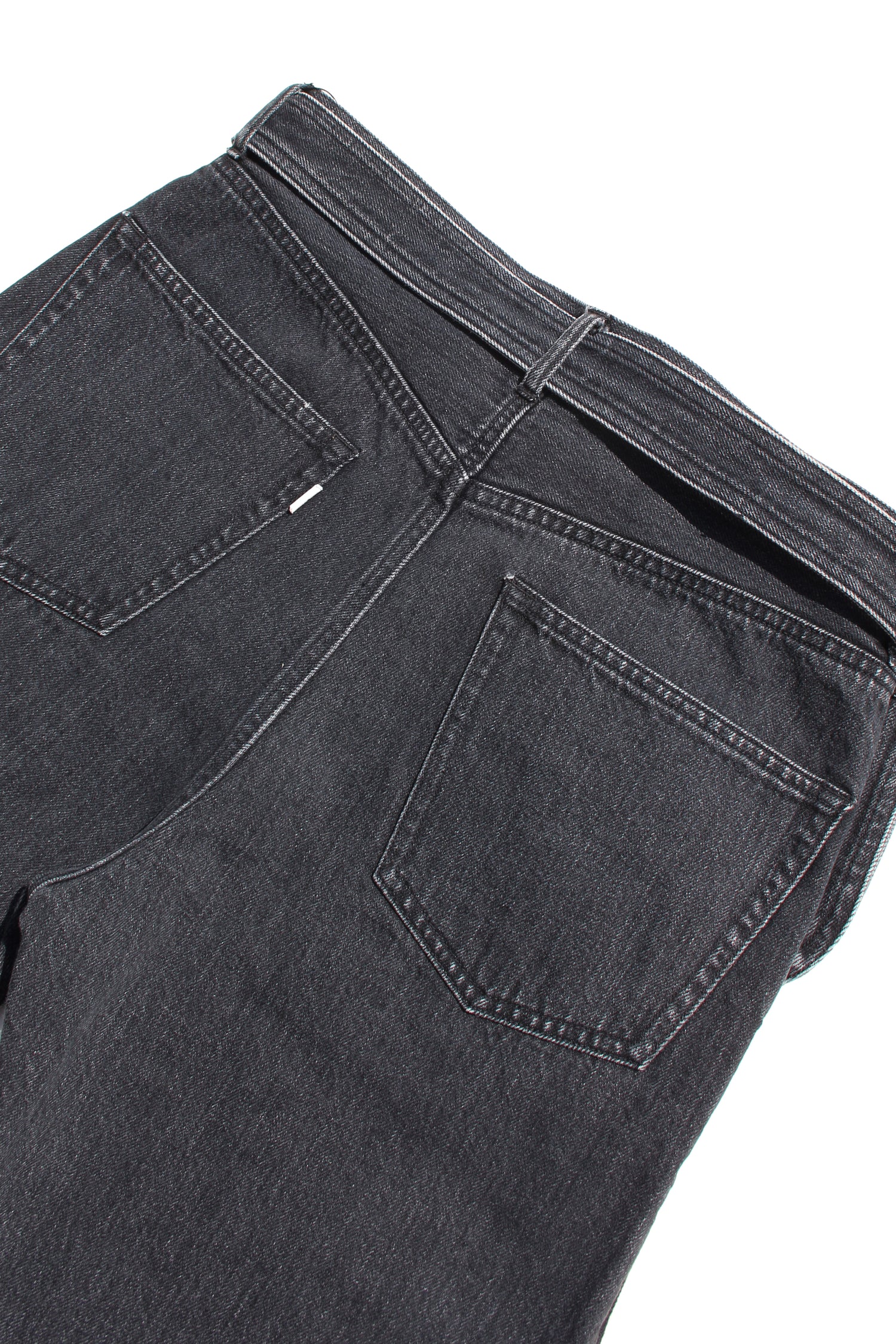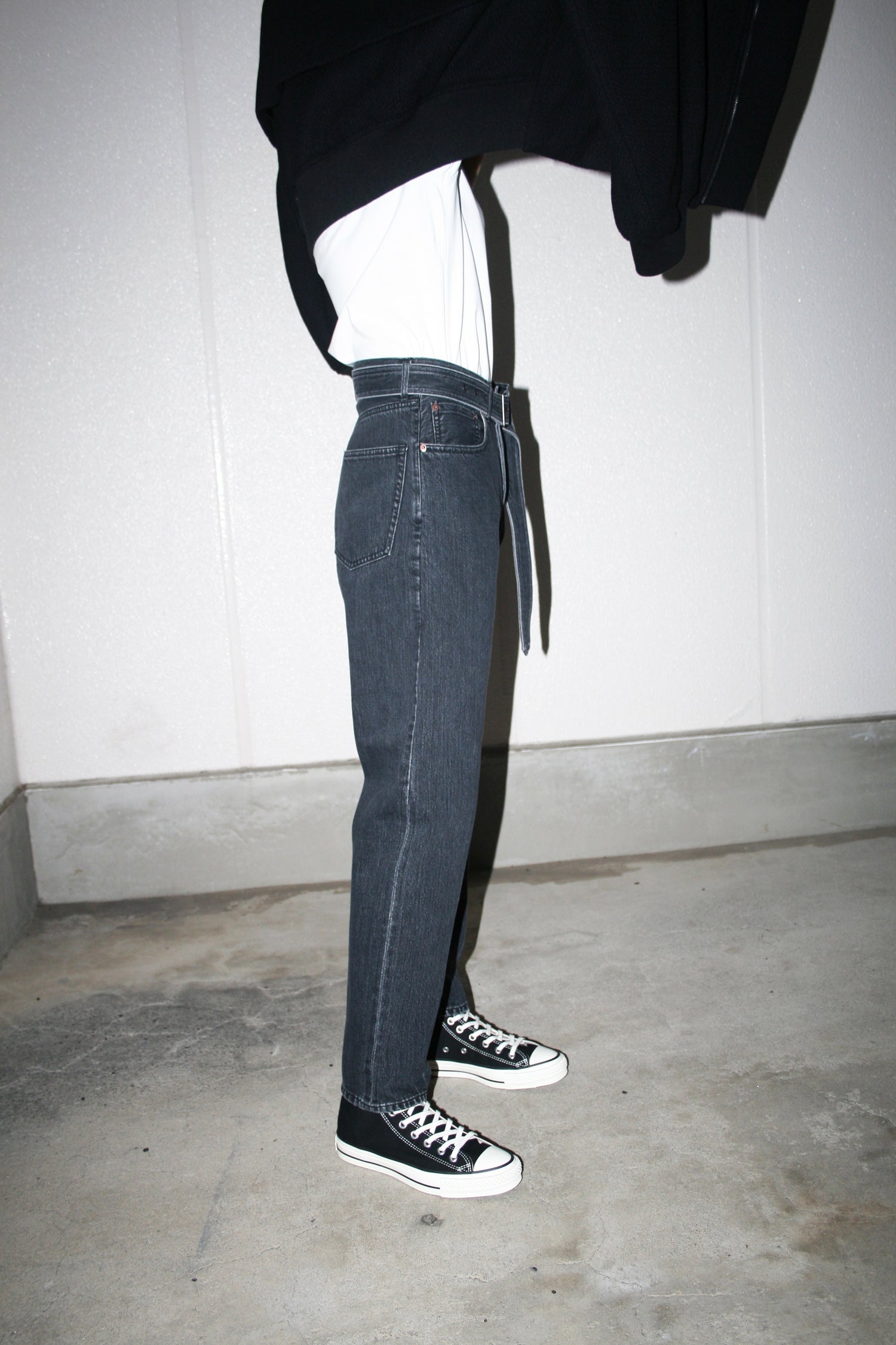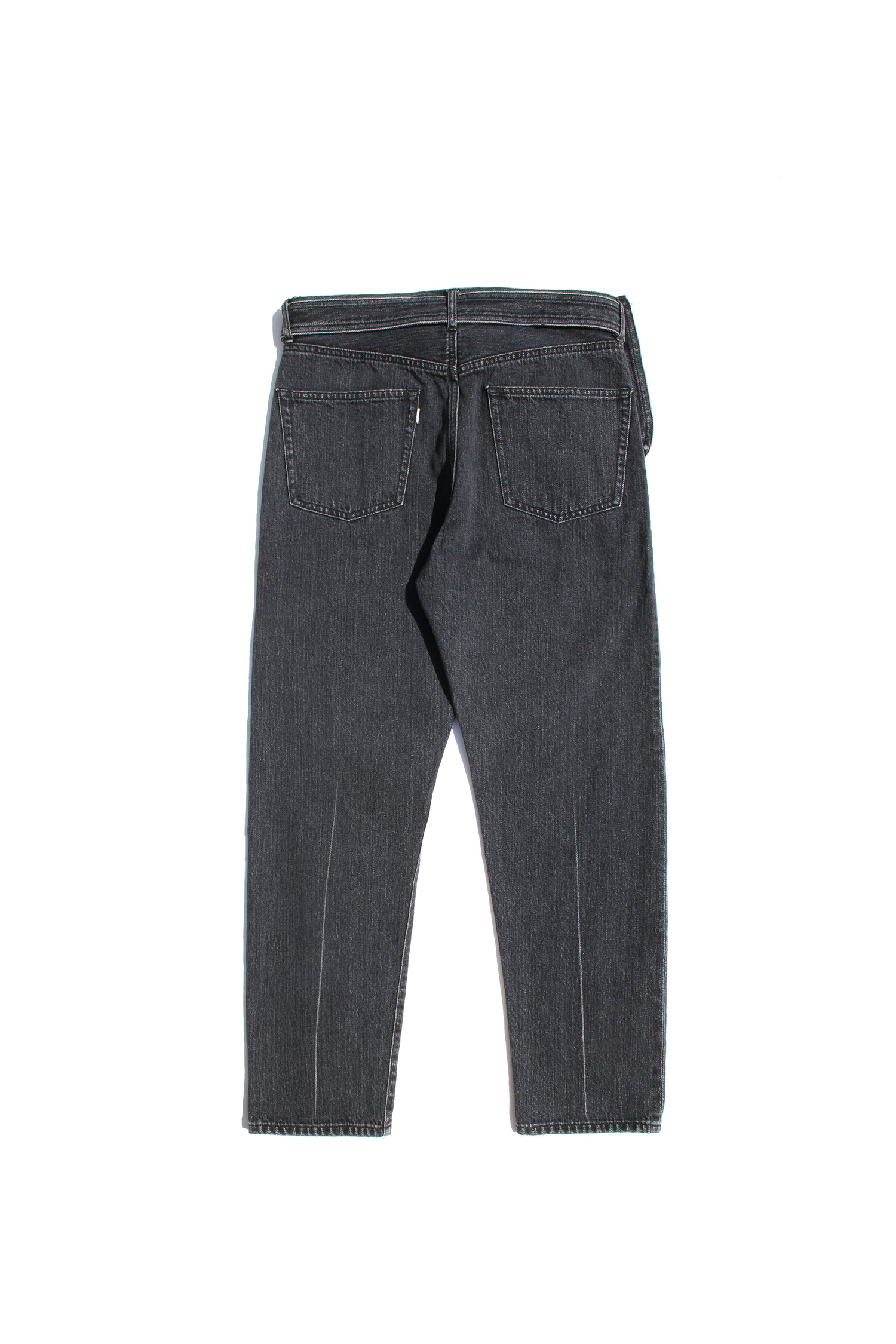 ESSAY’s tapered denim pants in black, a certain pattern of slim pants communicates something other than itself, than its form. The juxtaposition between Japanese studious trousers and European feel-cool-vibes vintages always works. The waist is encircled a belt with a bag that combines adventure and exchange. The attached pocket with belt is removable and it could be a versatile accessory on other pants or garments. This pants is made by soft 12oz selvedge denim (stone bio washed for a naturally fading feel).