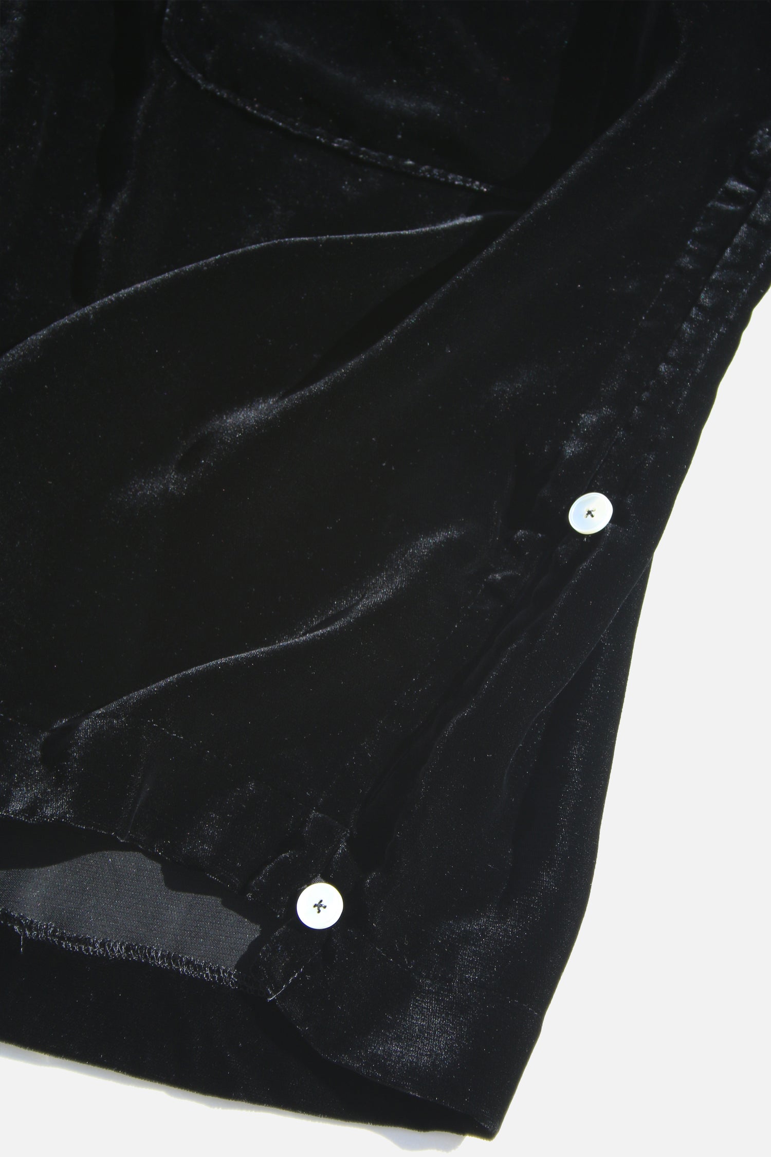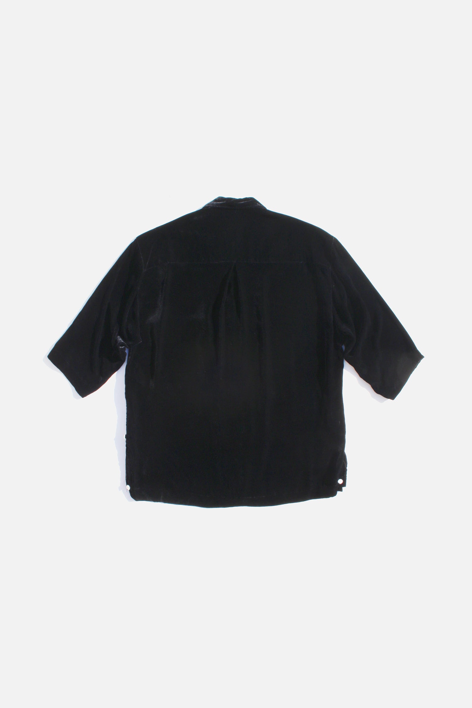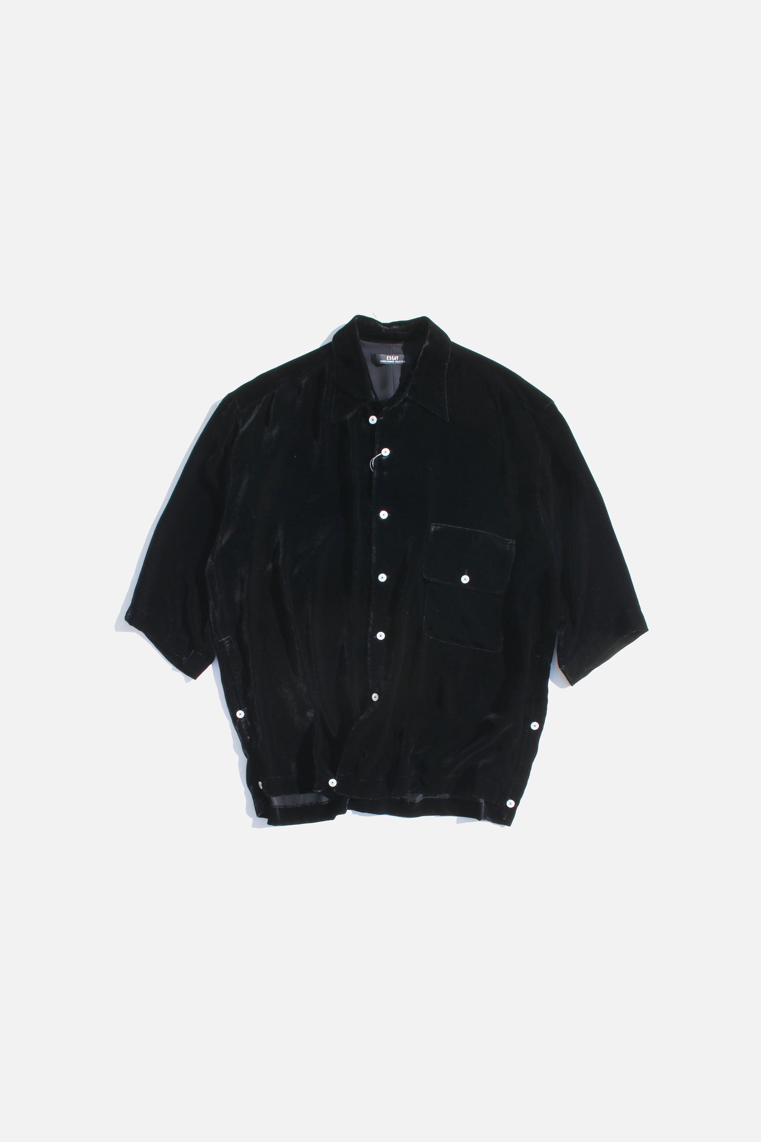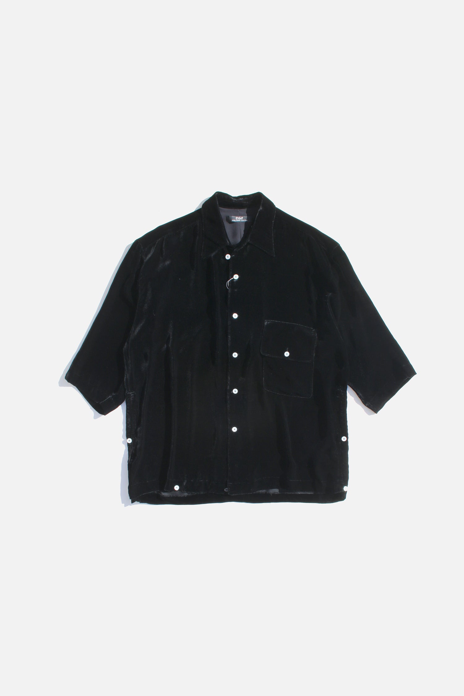Semi-oversized short-sleeve shirt made using lightweight velvet. Features single chest patch pocket, hem button, drop shoulders and bottom slits. Relaxed-fit. Unisex.