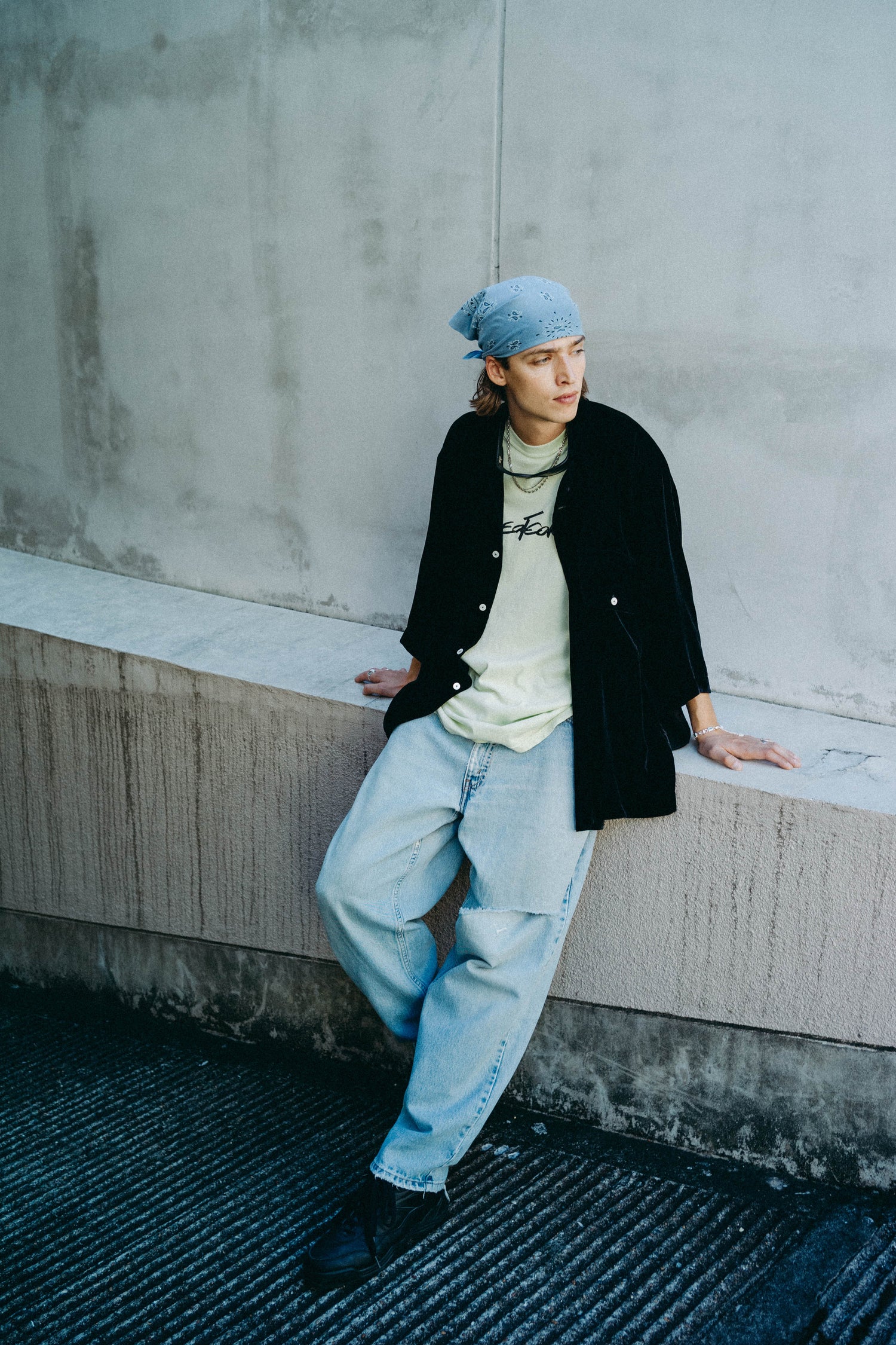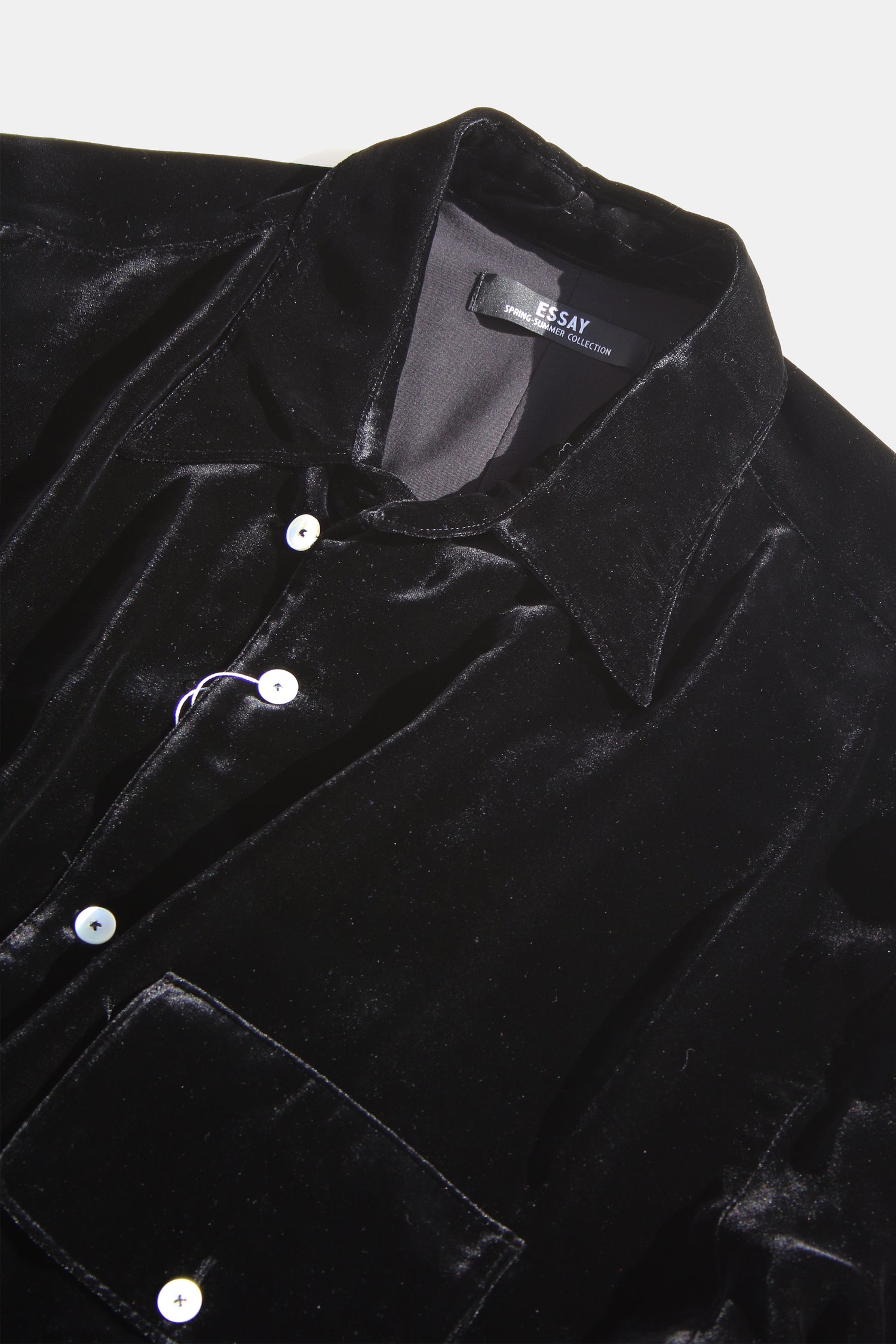 ESSAYのセミオーバーサイズカシクールS/Sシャツ。レーヨンベルベット / 地厚な印象強いベルベット、この素材は軽量かつドレープ性に富んでおり春夏へ向けた弱点を補填、さらりと羽織れる高級素材。ドロップショルダーなオーソドックス半袖シャツ。裾に配置された釦1つでシャツを留めカーディガンのような羽織として着用可能なデザイン。深いサイドスリットも風通し良く、かつパンツポケットへの手の出し入れも行いやすい機能的な設計となっている。