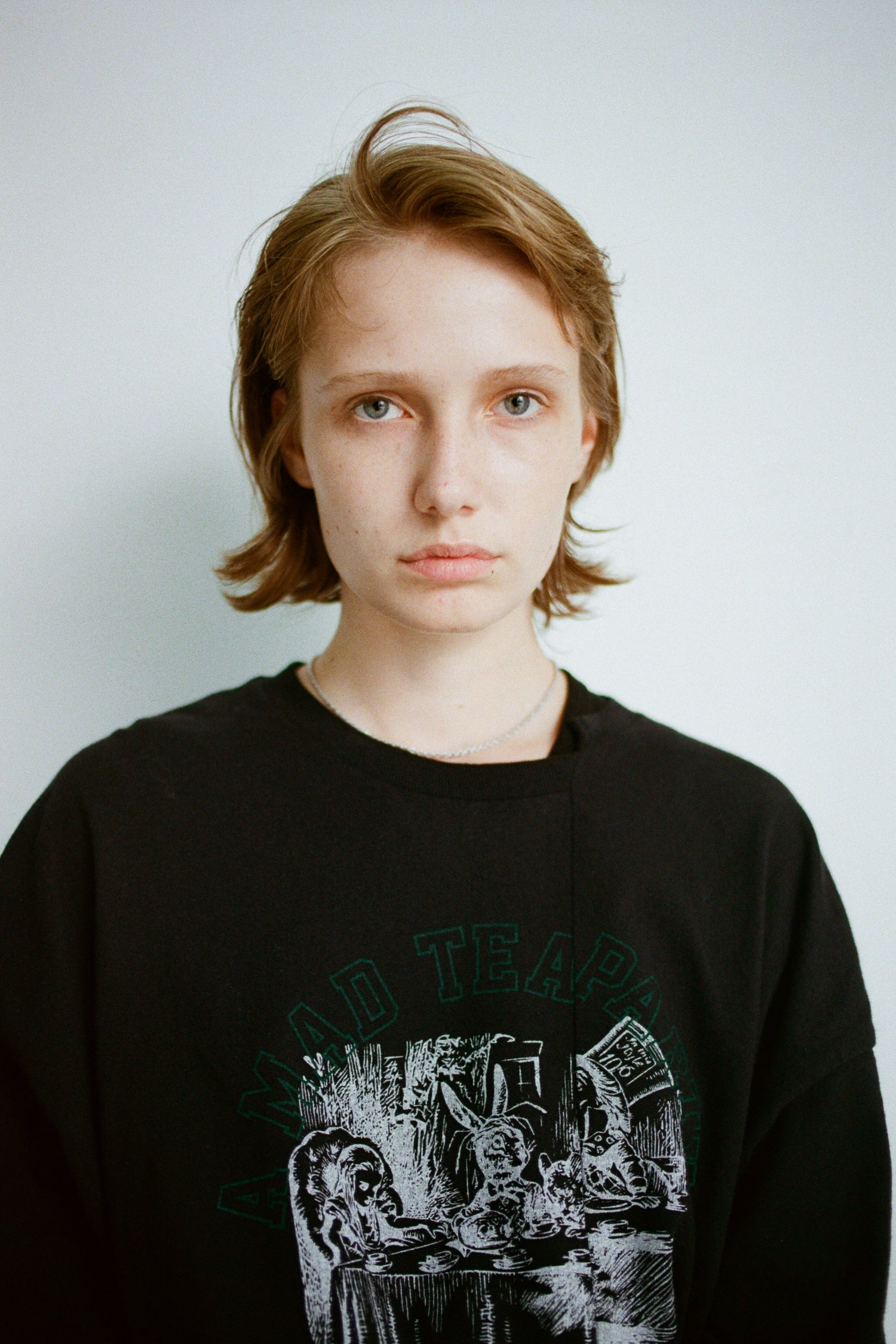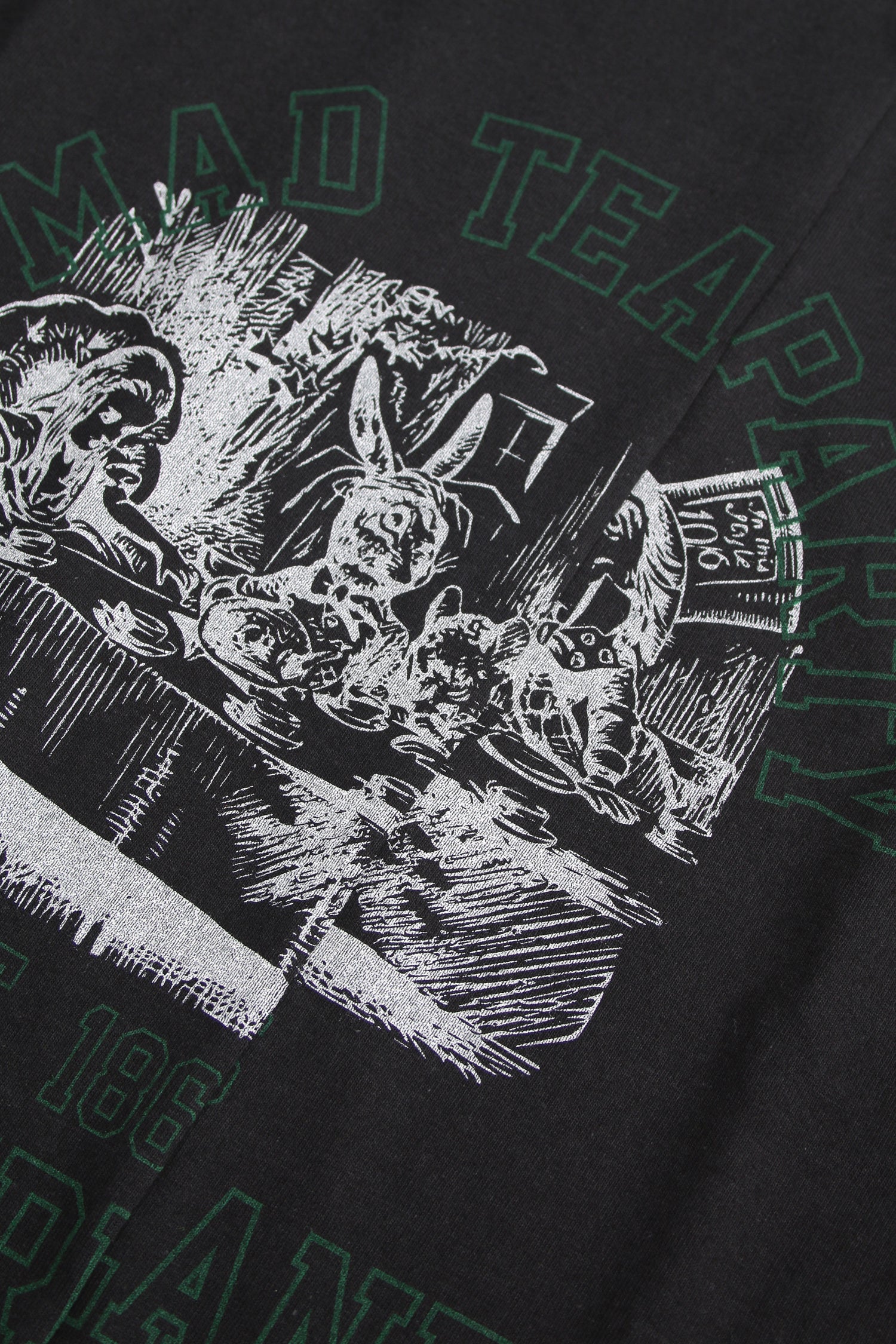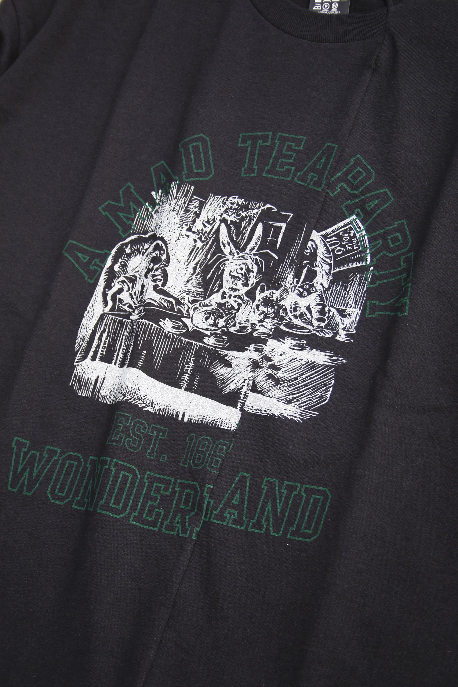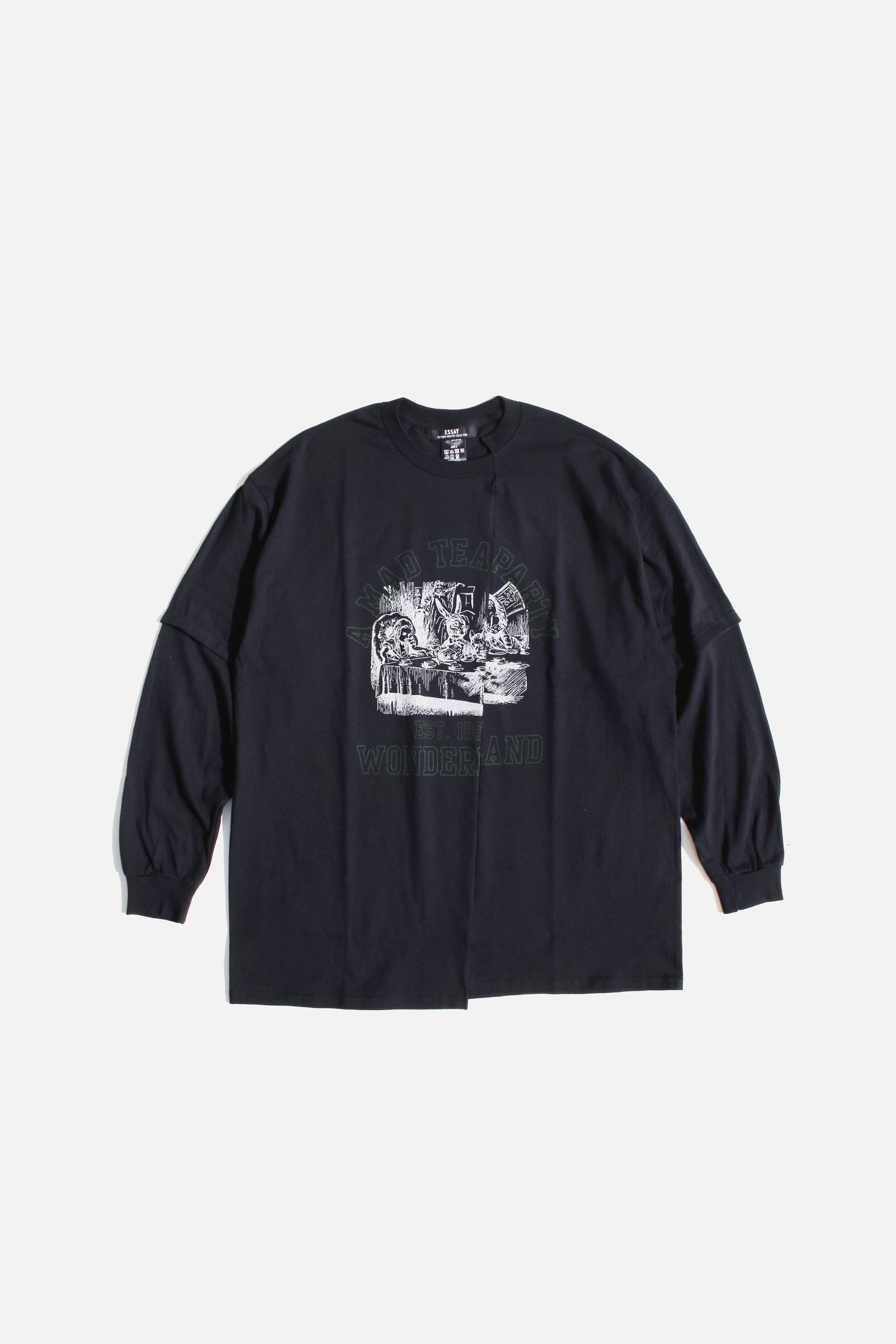 Oversized long sleeve t-shirt in dry-fit 6oz cotton with seasonal graphic: A MAD TEA PARTY, WONDERLAND. Inspired by Lewis Carroll’s Alice in Wonderland. Features super comfy cotton, a cut and reconstructed front and sewn sleeves which makes it look layered.