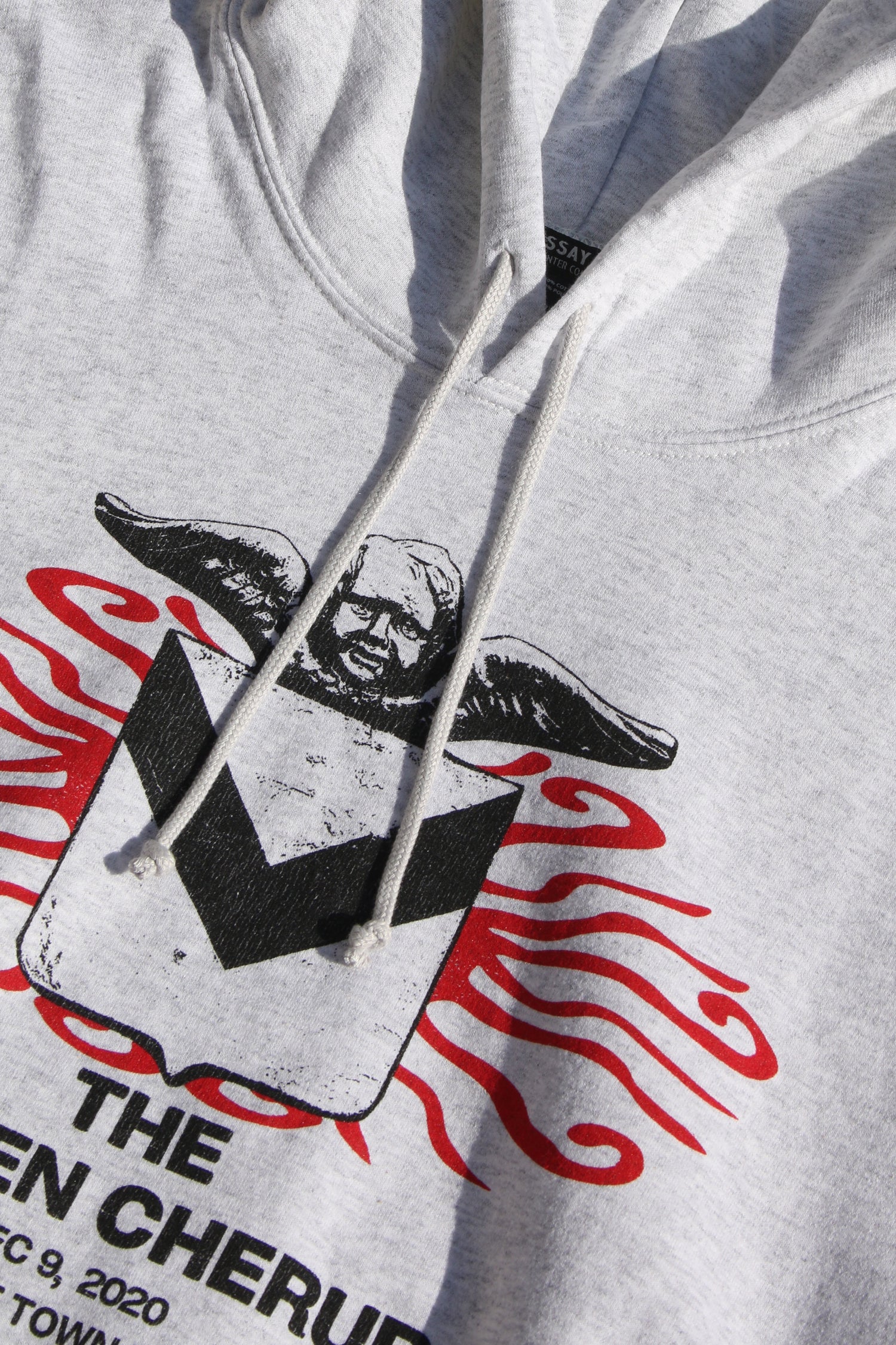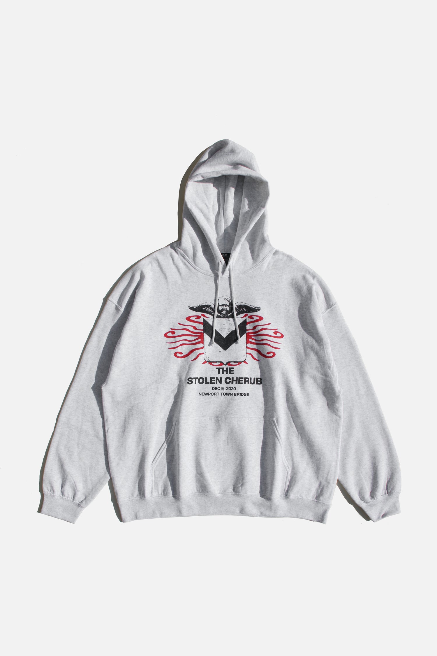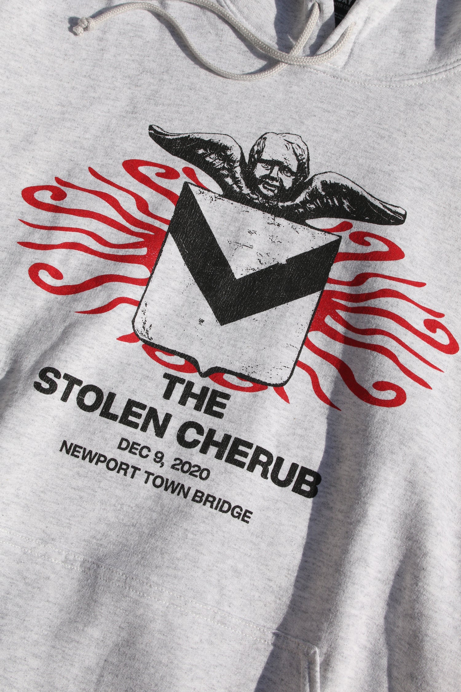 Screen printed drop shoulder hoodie. The STOLEN CHERUB design is based out of a sculpture theft incident on the Newport Bridge, and the cover of "Love Spreads”, a single from The Stone Roses. Each printing is a state in itself. Unisex.