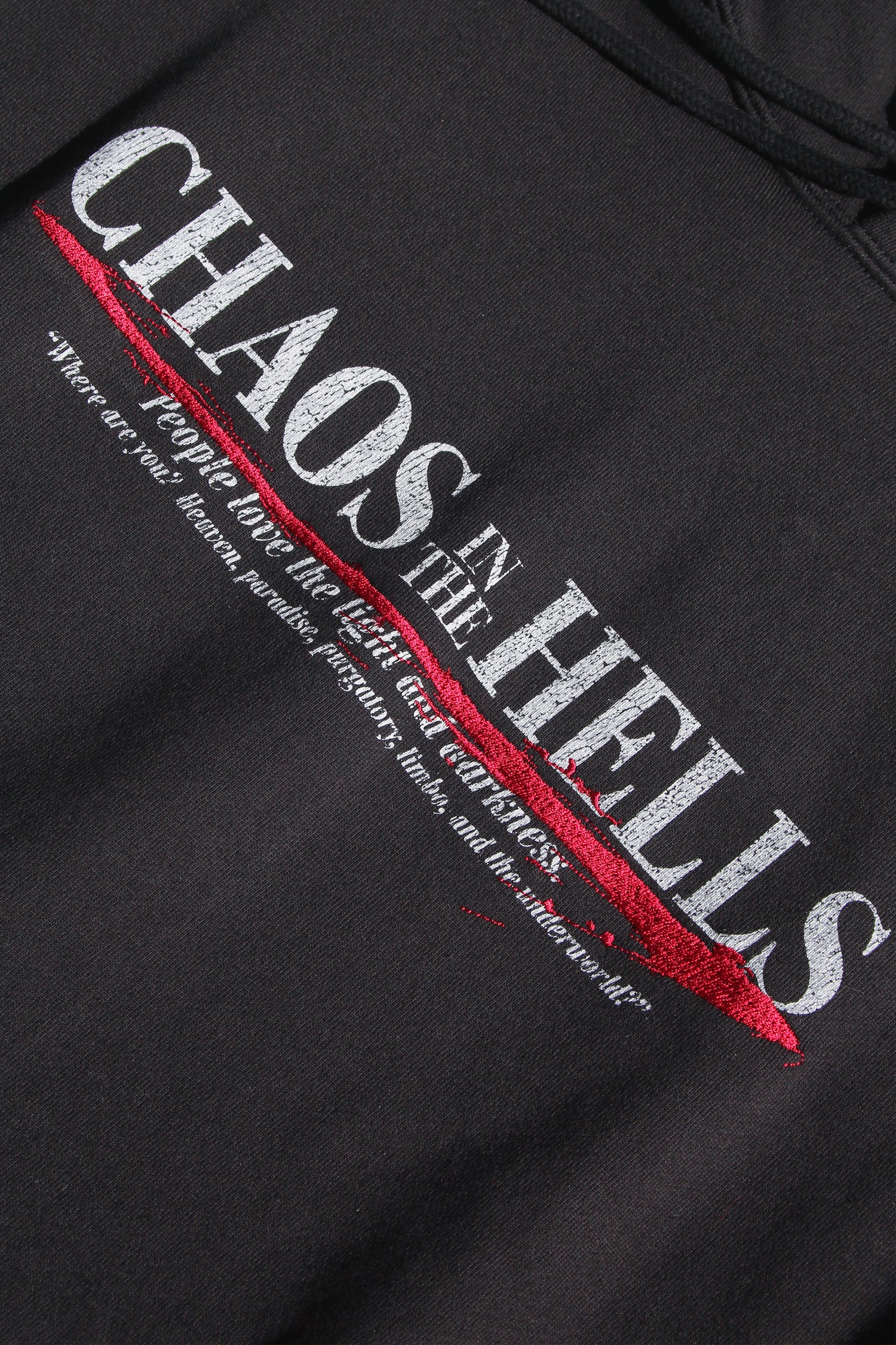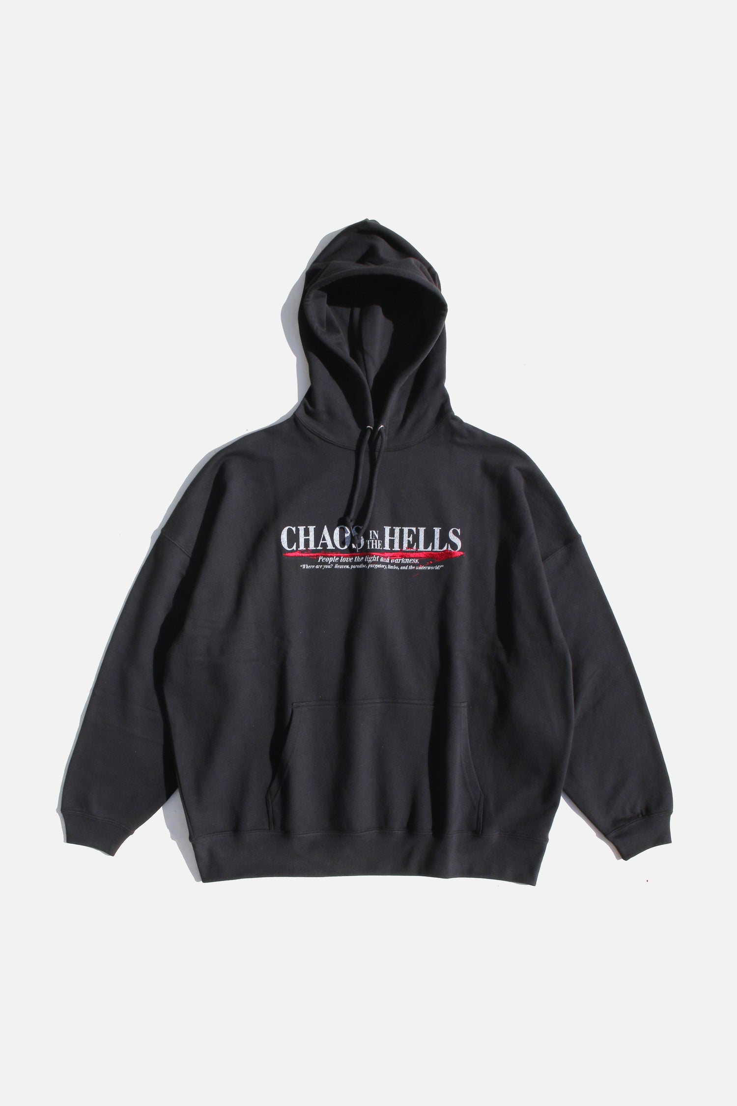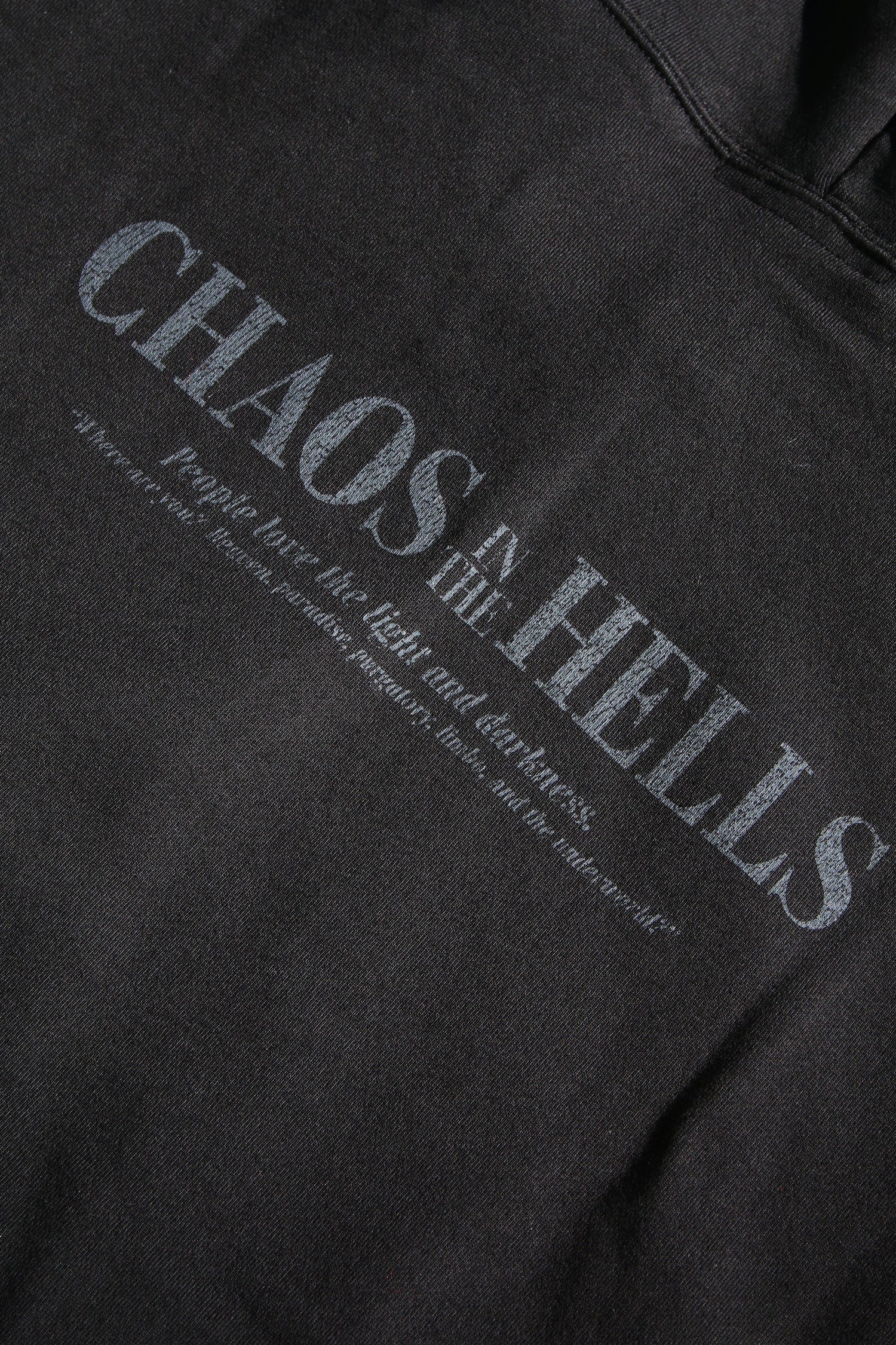コットン裏毛の着心地が良いXLサイジングのエンブロイダリーパーカー。前身頃に刺繍でグラフィック。柔らかさとヴィンテージ感を作るために独特のプリントUSED加工を施しています。CHAOS (カオス) 地獄がテーマ / CHAOS IN THE HELLS カオスインザヘルズ, 伝承において死後の世界には天国、楽園、煉獄、辺獄、冥界があると言われ、地獄は輪廻と転生の期間、別次元、永遠の目的 地と描かれる。あなたはどこにいますか?オーバーサイズ。スクリーンプリントの風合いは個体によって若干の変化があります。