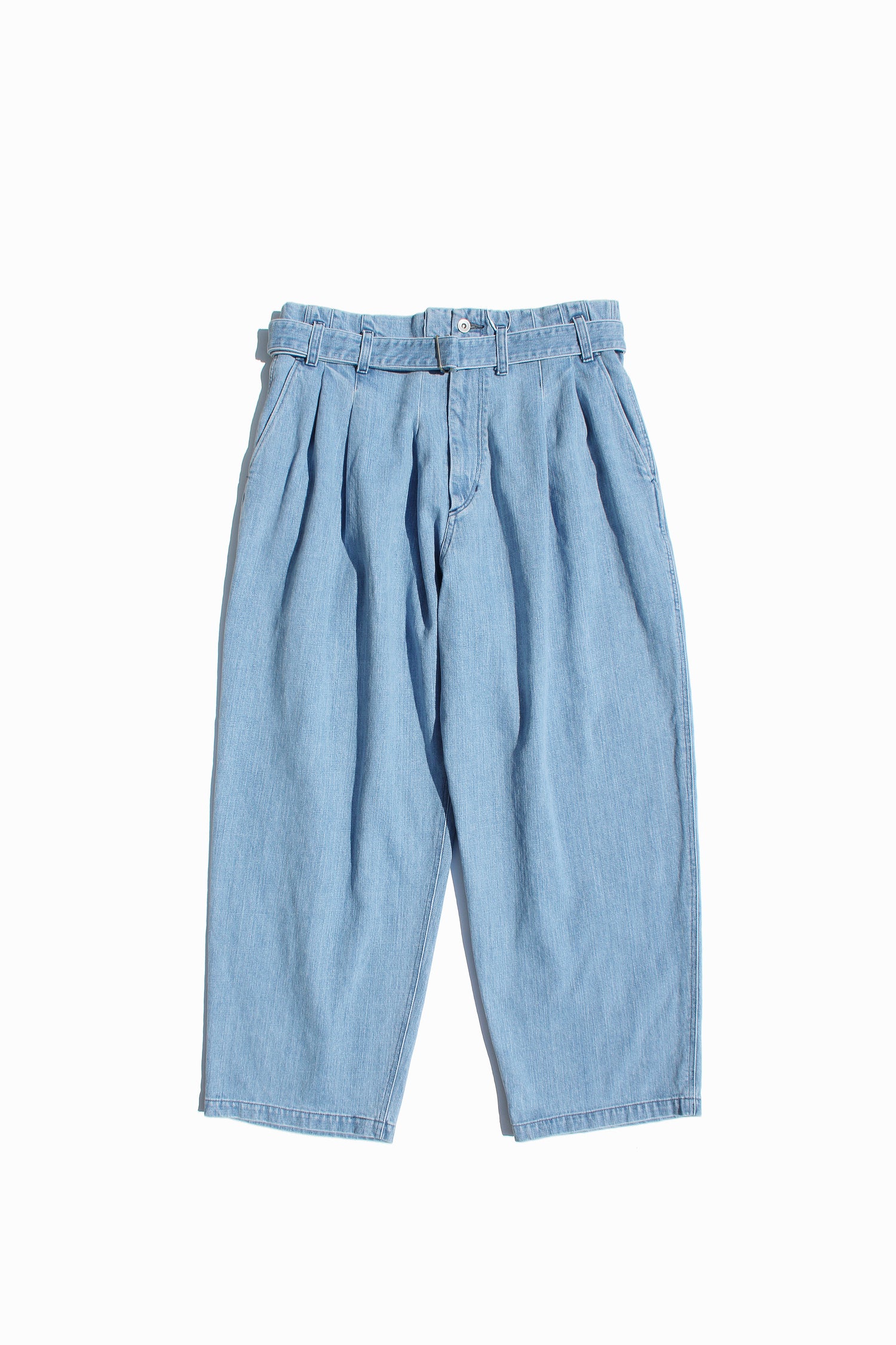 DETAILSHakama denim pants wondrously constructed in a 13oz highly bleached denim, pleated sharply at the right side that falls to a wider leg from a belted waist. A loose look inspired by traditional Japanese hakama. Hakama trousers possess a up-lifting quality unique to ESSAY and carries the indigenous underground into a new golden age.
