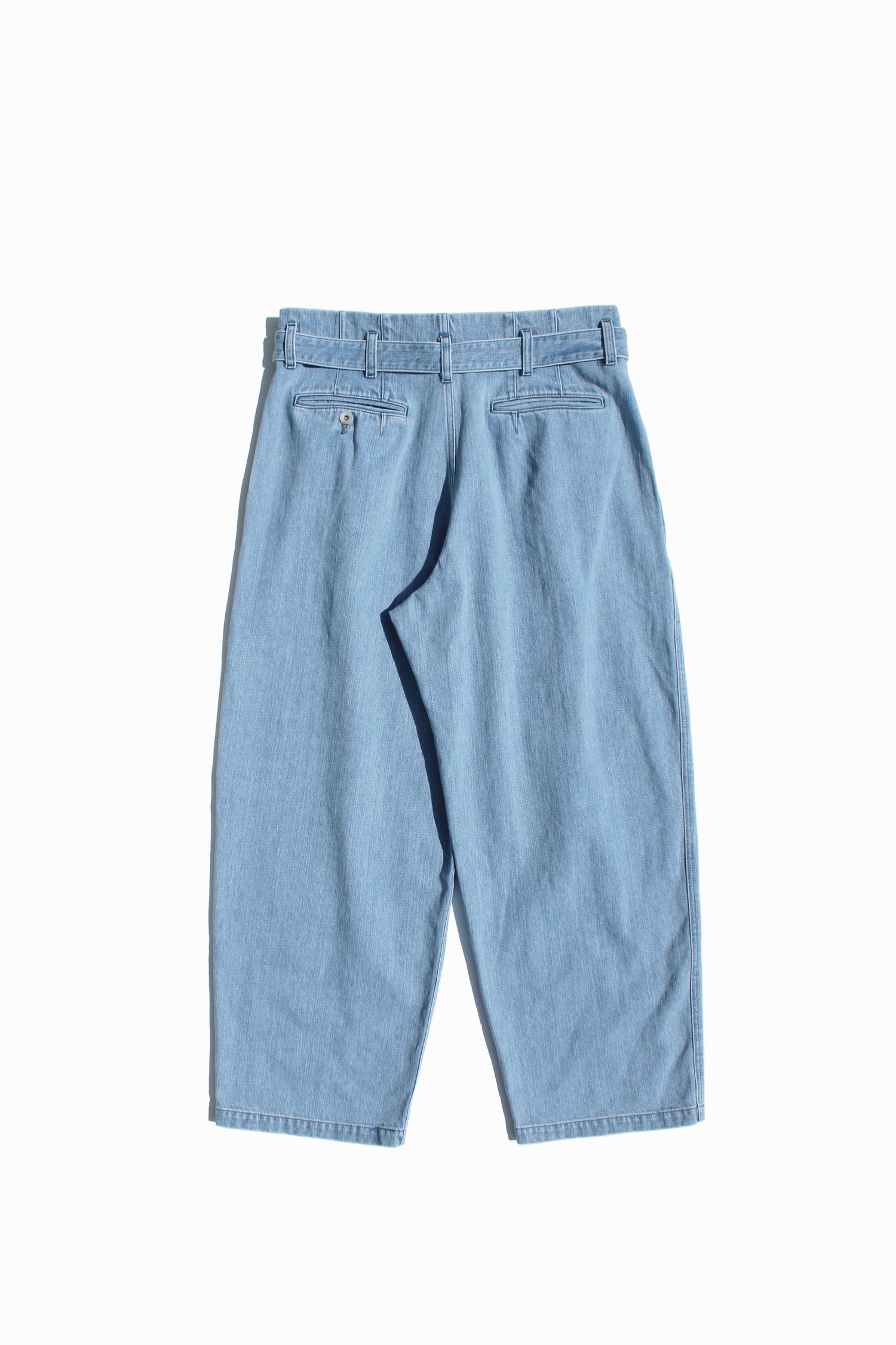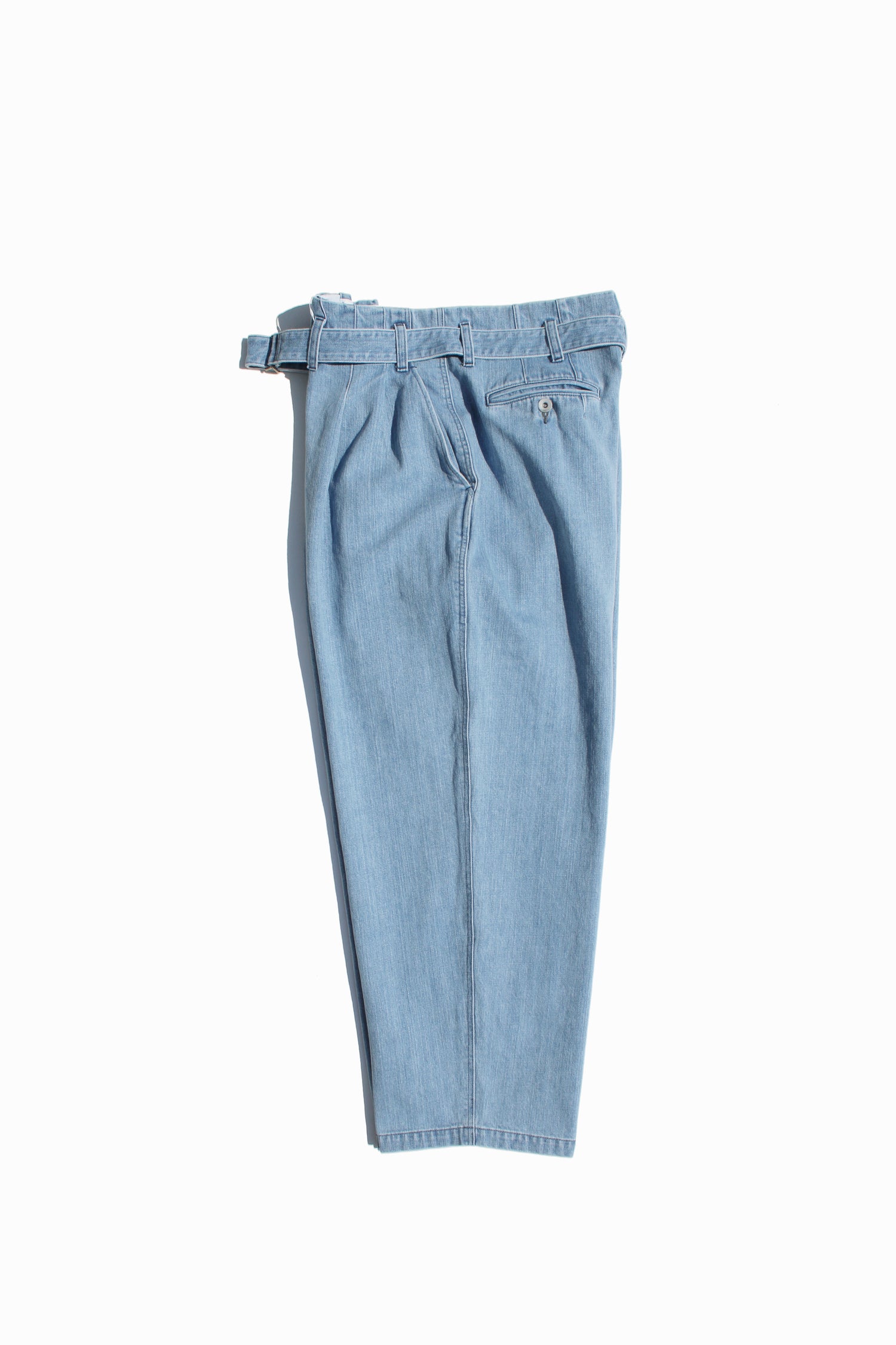 Hakama denim pants wondrously constructed in a 13oz highly bleached denim, pleated sharply at the right side that falls to a wider leg from a belted waist. A loose look inspired by traditional Japanese hakama. Hakama trousers possess a up-lifting quality unique to ESSAY and carries the indigenous underground into a new golden age.