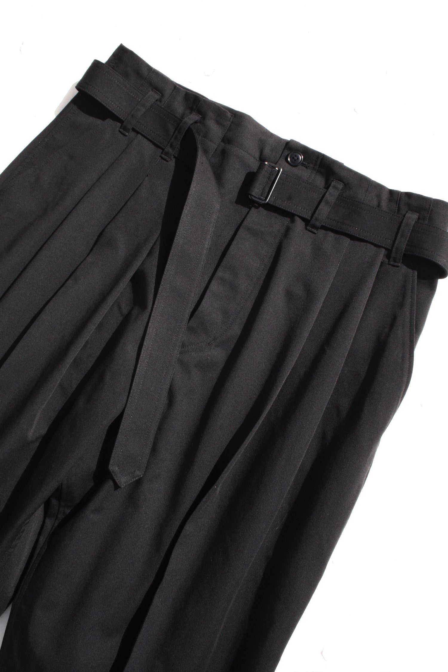 DETAILSEssay’s relaxed pants with a dropped crotch in a soft black washed twill and finished with sharp front pleats. A loose look inspired by traditional Japanese hakama. It falls to a wider leg from a belted waist. Hakama trousers possess a up-lifting quality unique to ESSAY and carries the indigenous underground into a golden age.