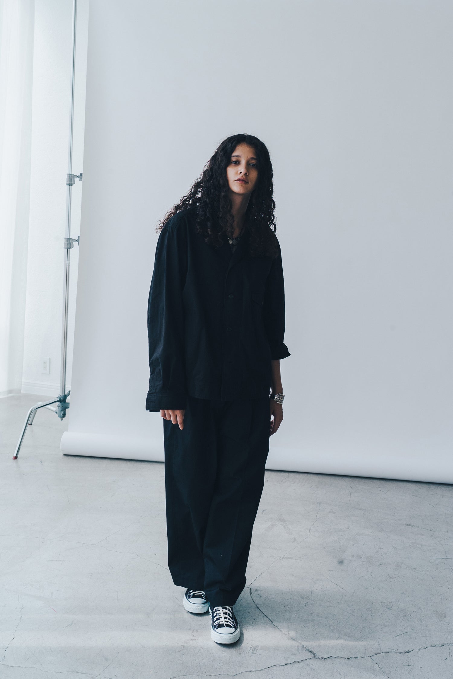 Essay’s relaxed pants with a dropped crotch in a soft black washed twill and finished with sharp front pleats. A loose look inspired by traditional Japanese hakama. It falls to a wider leg from a belted waist. Hakama trousers possess a up-lifting quality unique to ESSAY and carries the indigenous underground into a golden age.