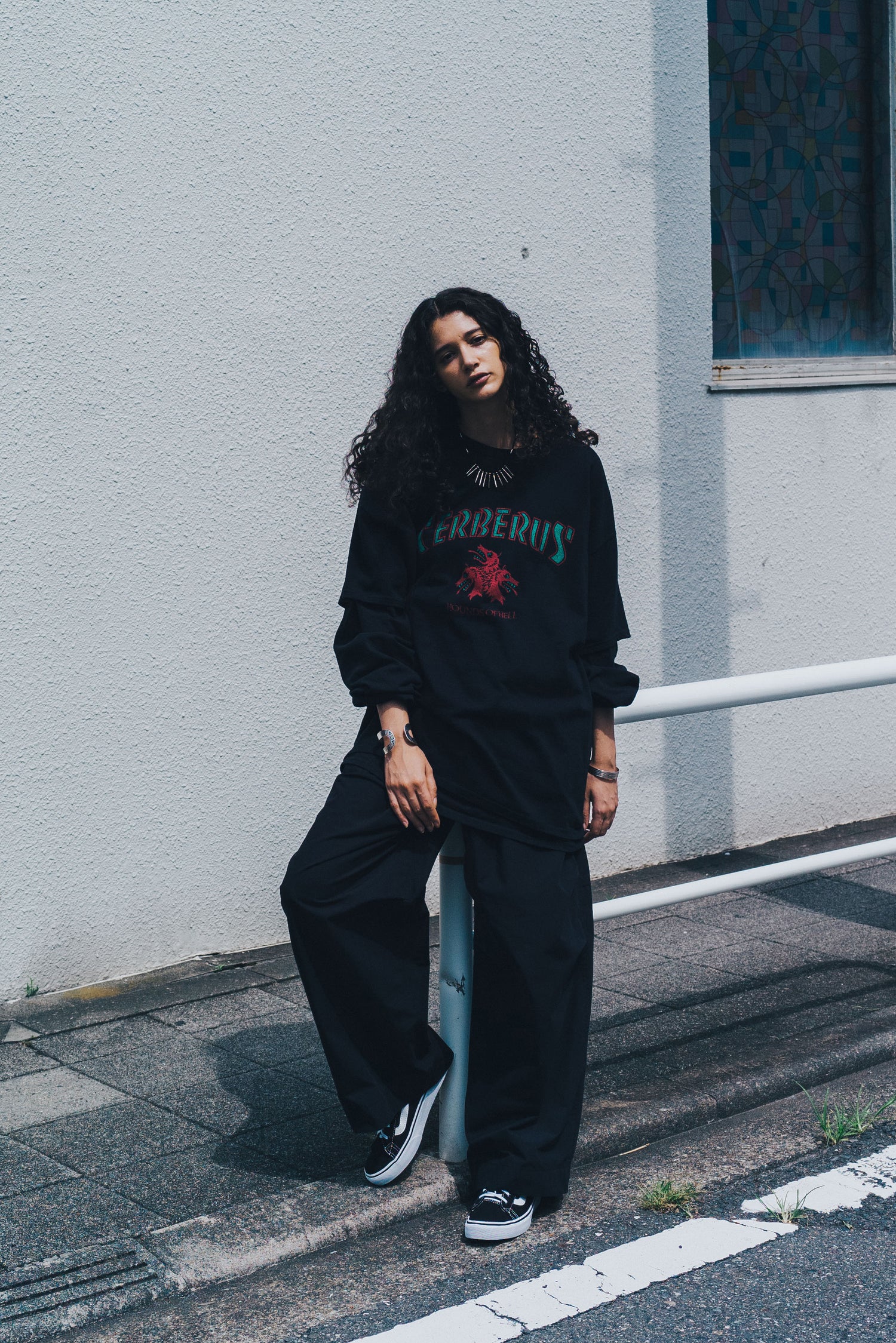 ESSAY 23SSコレクションのレイヤードオーバーサイズロングTシャツ。天竺 / ヘビーウェイトコットン天竺、6ozのオープンエンド糸を使用した肉厚のザックリとした素材感が特徴、シルクスクリーンプリントに最適。柔らかさとヴィンテージ感を作るために独特のプリントUSED加工 / ウォッシュ&タンブラーの加工を施しています。フロントに、CERBERUS - HOUNDS OF HELL (ケルベロス - ハウンズオブヘル・地獄の番犬) プリントが施されています。90sのスケートボードシーンからインスパイア。TシャツとロングTシャツ(無地)は縫い合わせていないため、個々で着ることが出来ます。シルクスクリーンプリントの風合いは個体によって若干の変化があります。