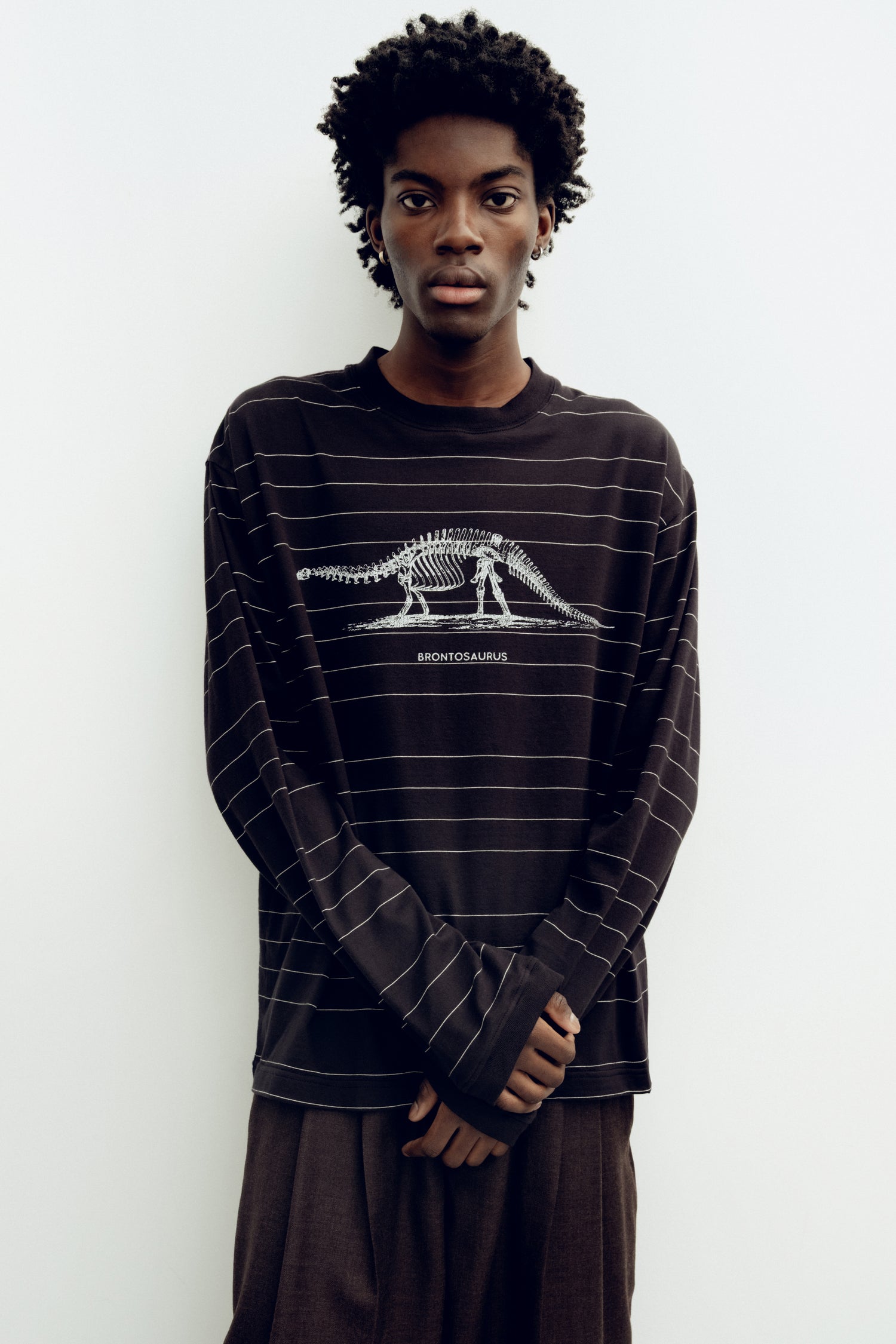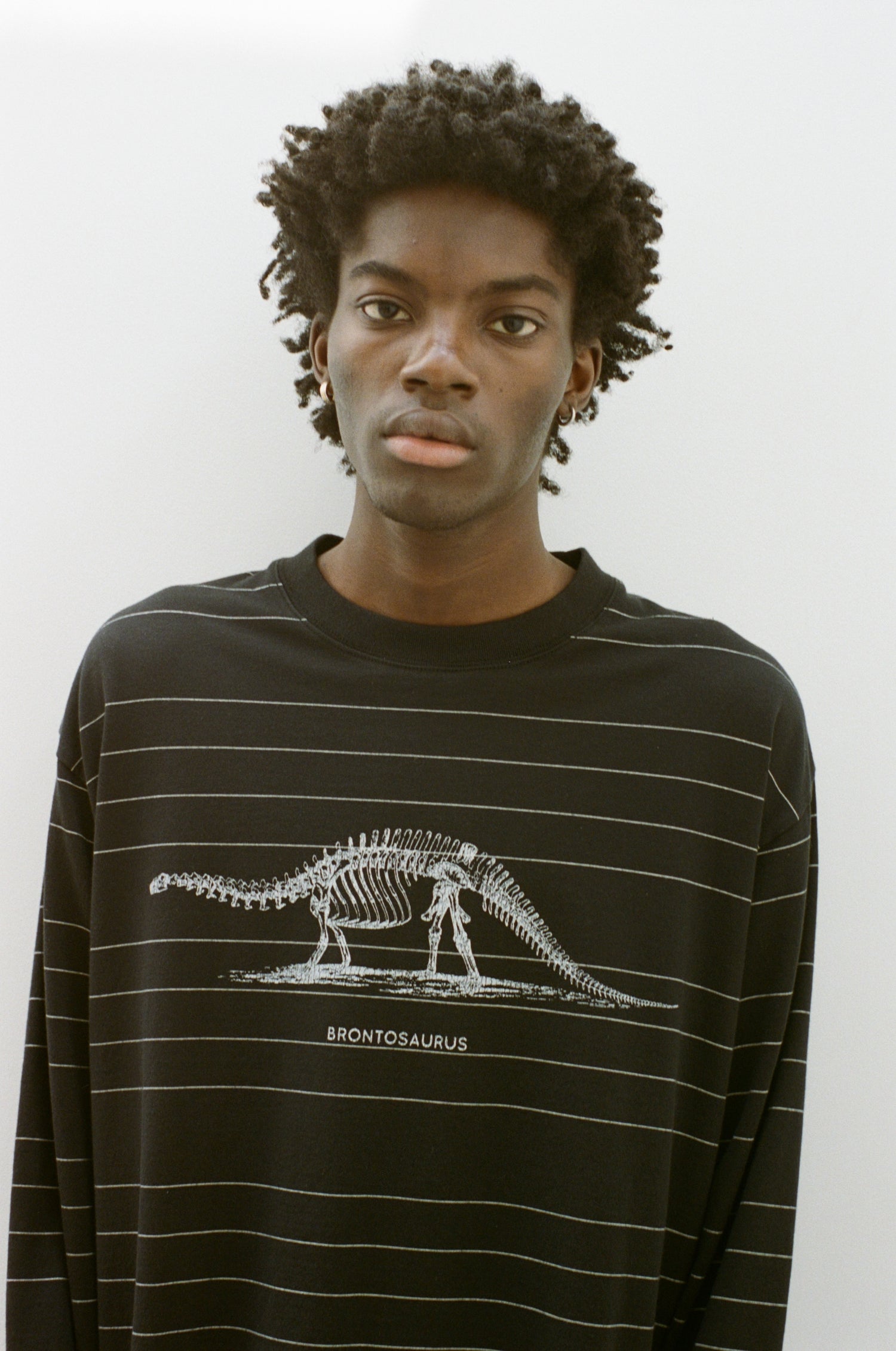 A striped long sleeve t-shirt of quiet strength, made from organic cotton, staying soft and smooth after every wash. Inspired by souvenirs collected at dinosaur museums.