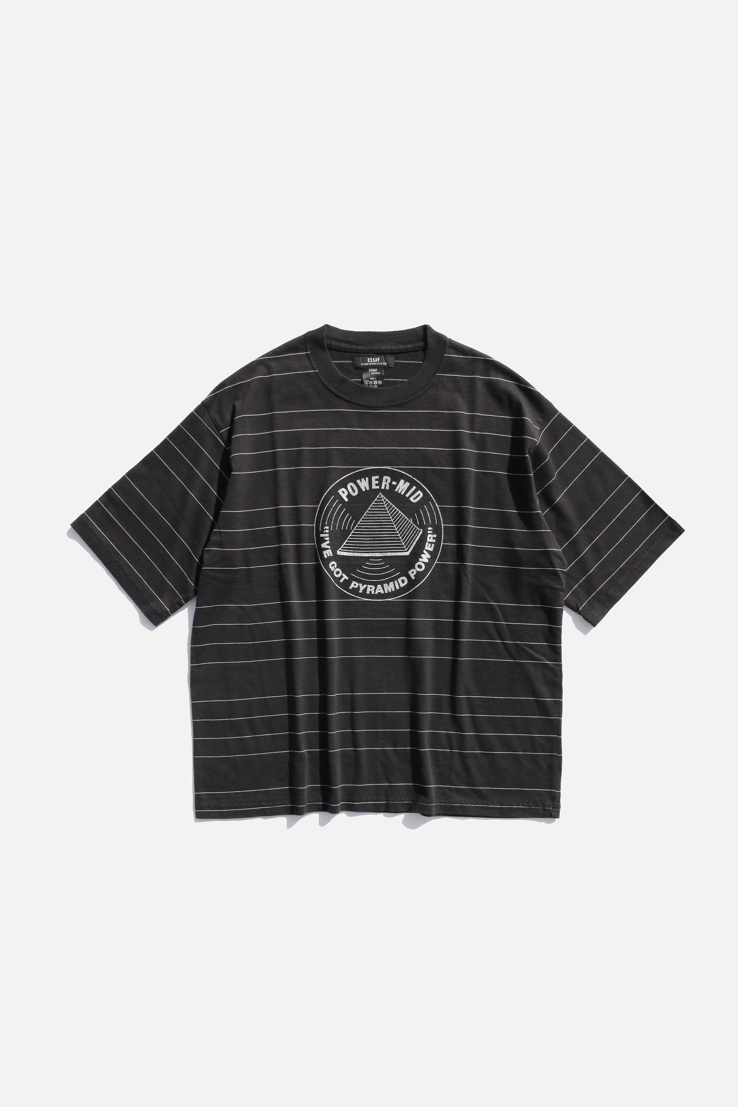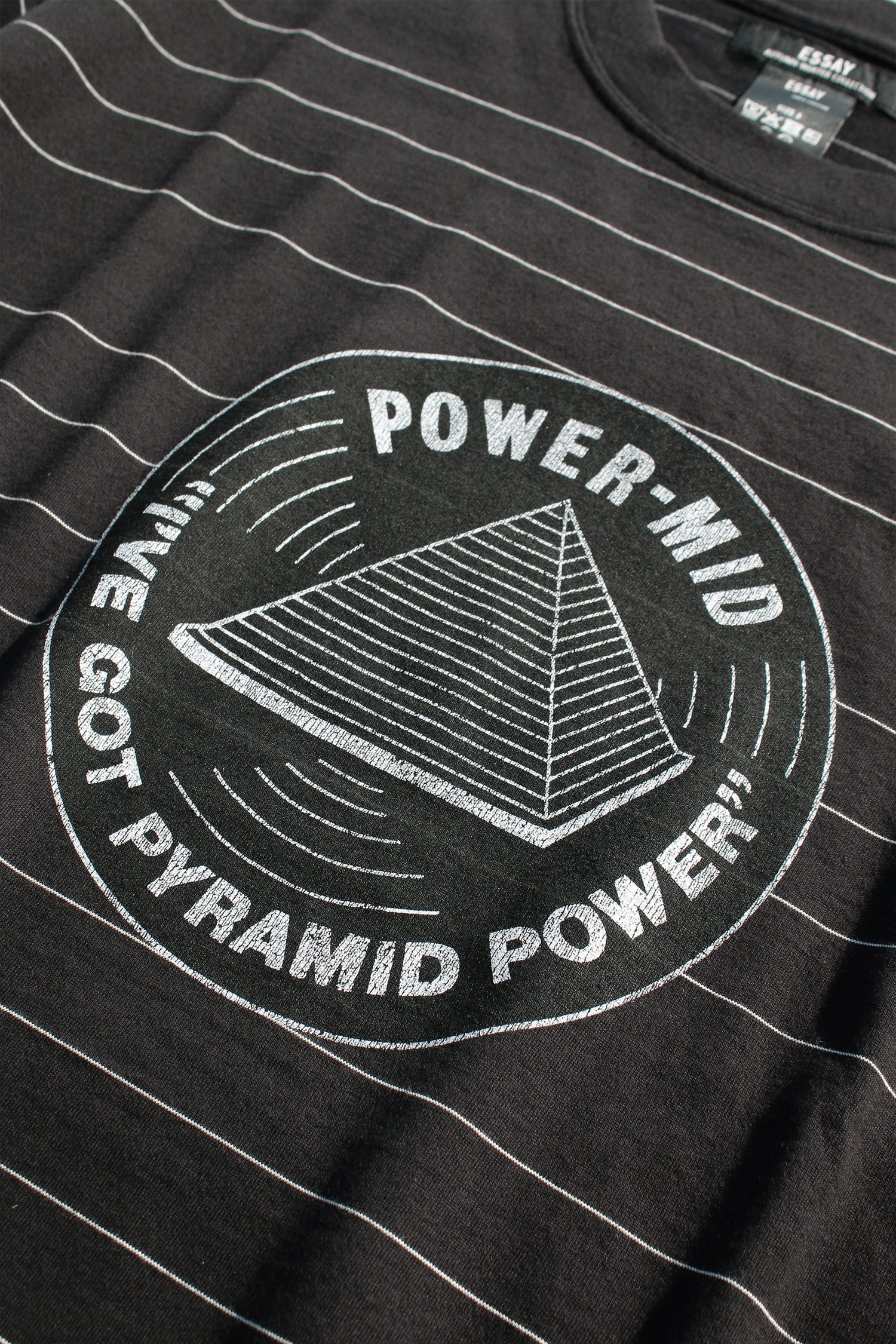 ESSAYの新型オリジナルピンボーダー Tシャツ。40/2 オーガニックコットン天竺 / オーガニックリングスパン糸を双糸使用した天竺素材。オーガニック綿と双糸であるとこで表情に肌触りが良く、洗濯後の経年変化も滑らかな質感が残る。PYRAMID: VINTAGE Tシャツで見つけたピラミッドモチーフのグラフィックを着想にデザイン。パワーミッドというネーミング、ピラミッドから出るパルス、などポップな印象が特徴的なグッドデザイン。