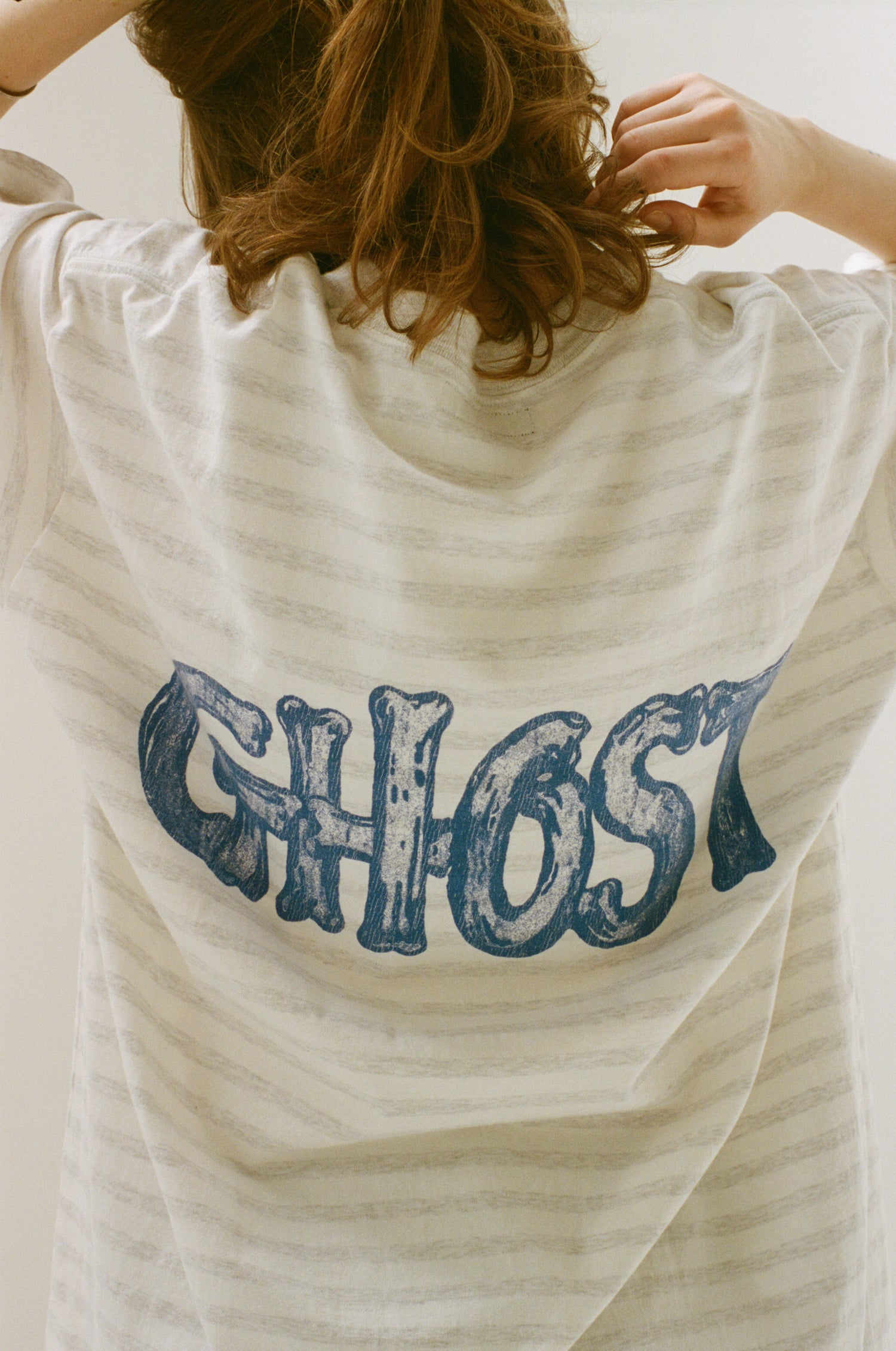A printed t-shirt in an original 5.6oz shadow border jersey. The bone-sketched MAD GHOST is from an encounter with street art in Europe. Each piece unique, no printing the same.