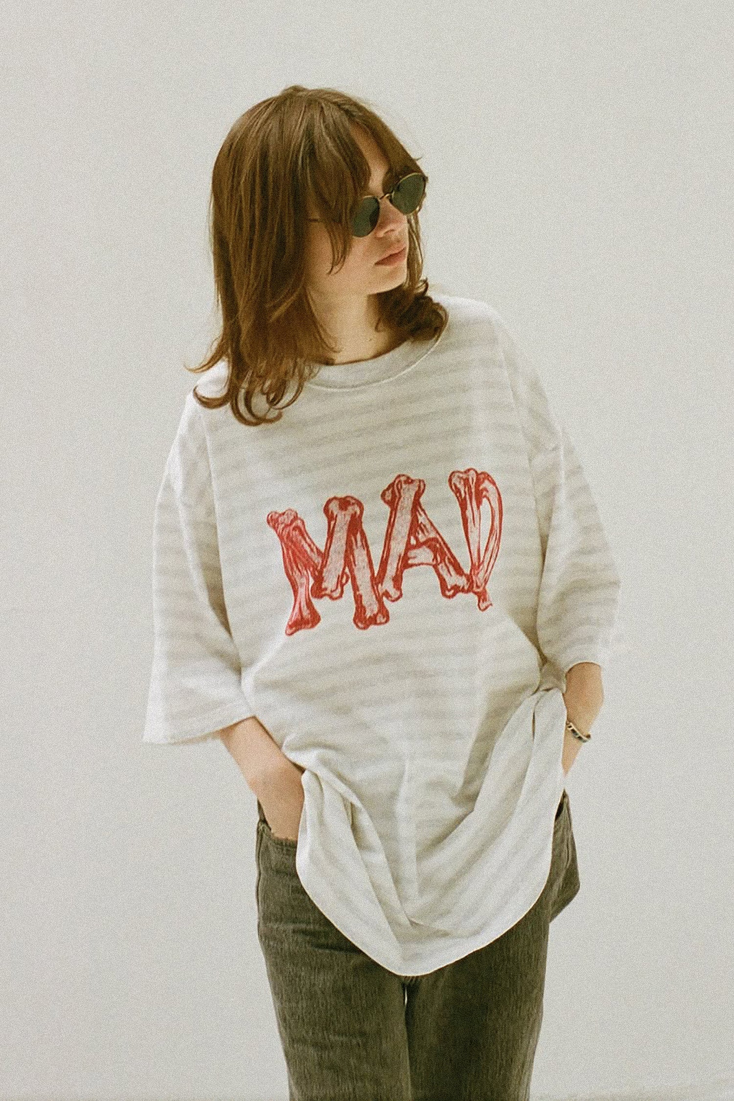 (MAD GHOST) ヨーロッパを訪れた際に見つけたストリートアートを着想にデザインされたMAD GHOST。 ボーン(骨)で描かれたグラフィックに、夏特有の怪奇話のようなMAD GHOST(狂った幽霊)という文 言が夏らしく素晴らしいデザイン。