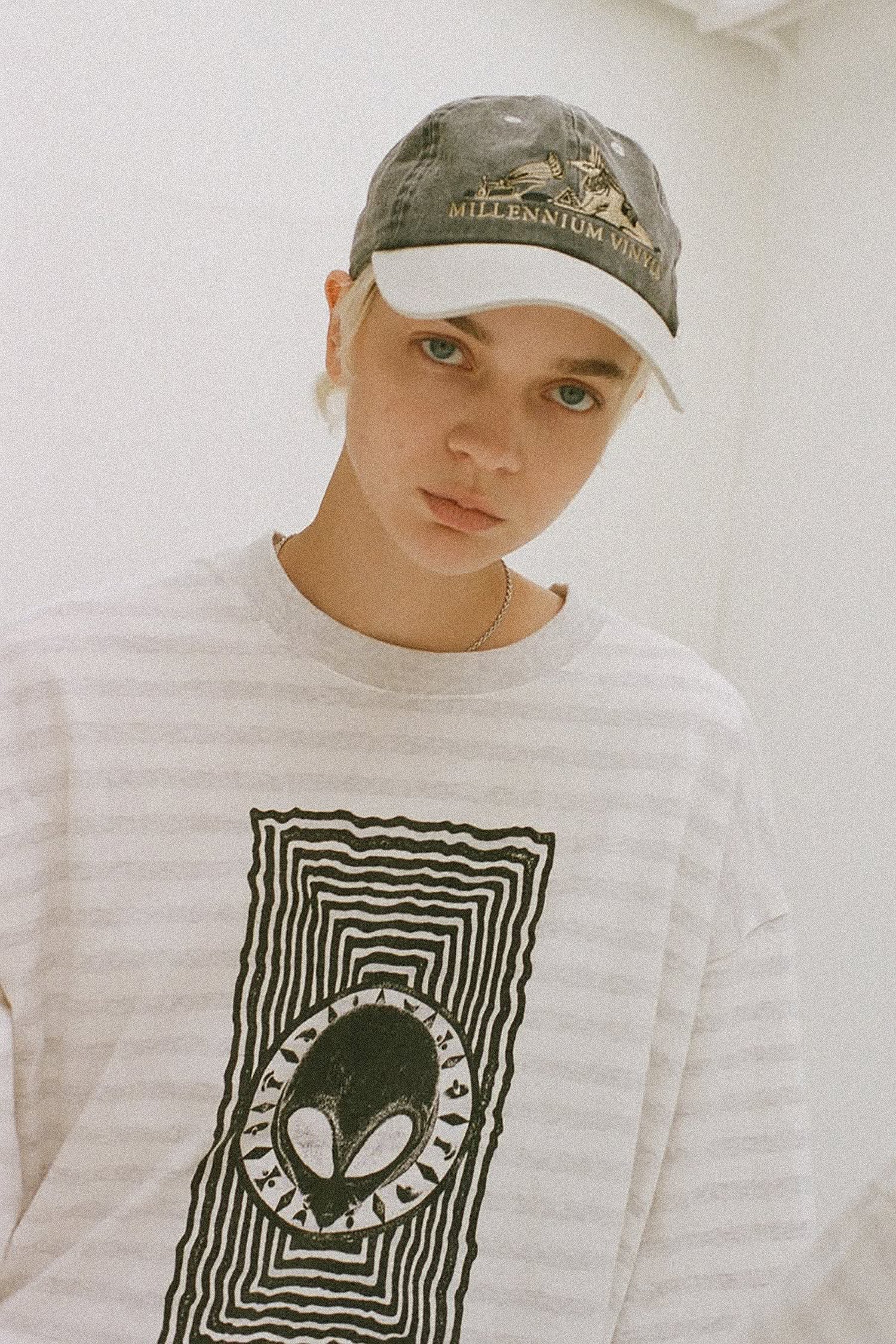 (ROSWELL) 1947年にアメリカ合衆国・ニューメキシコ州ロズウェル付近でUFOが墜落し米軍により回収されたとして噂が広まったロズウェル事件。この地特有のスーヴェニアTシャツとし数多くのエイリア ンTシャツが発表されている。そんなお土産Tシャツへのオマージュとして制作。