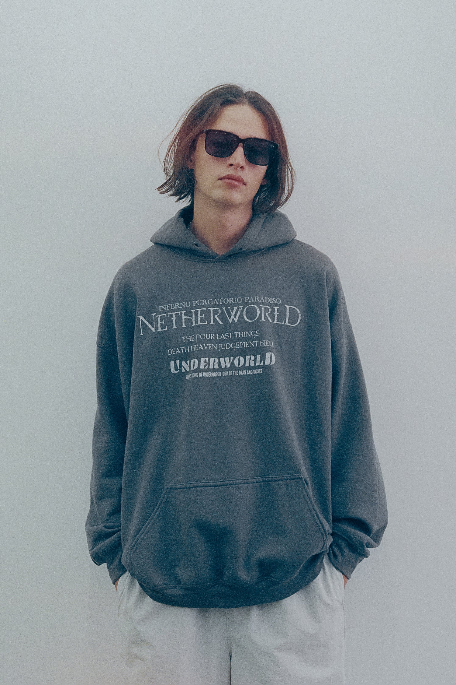 着心地が良い8.0ozヘビーブレンドコットンポリエステル生地を使用し、プリントUSED加工を施したオーバーサイズブラックパーカ。ウォッシュ&タンブラーの加工を施しドライな質感を表現。フロントに施された"INFERNO PURGATORIO PARADISO, NETHERWORLD, THE FOUR LAST THINGS, DEATH HEAVEN JUDGEMENT HELL, UNDERWORLD, HADES KING OF UNDERWORLD GOD OF THE DEAD AND RICHES"プリントが目を引く一着。『神曲』煉獄篇 (イタリアの作家ダンテ・アリギエーリ)からインスパイア。腹部には使い勝手の良いカンガルーポケットを配置。シルクスクリーンプリントの風合いは個体によって若干の変化があります。