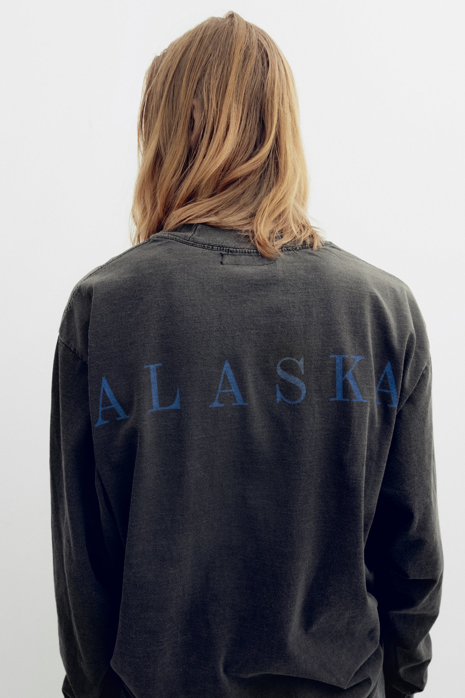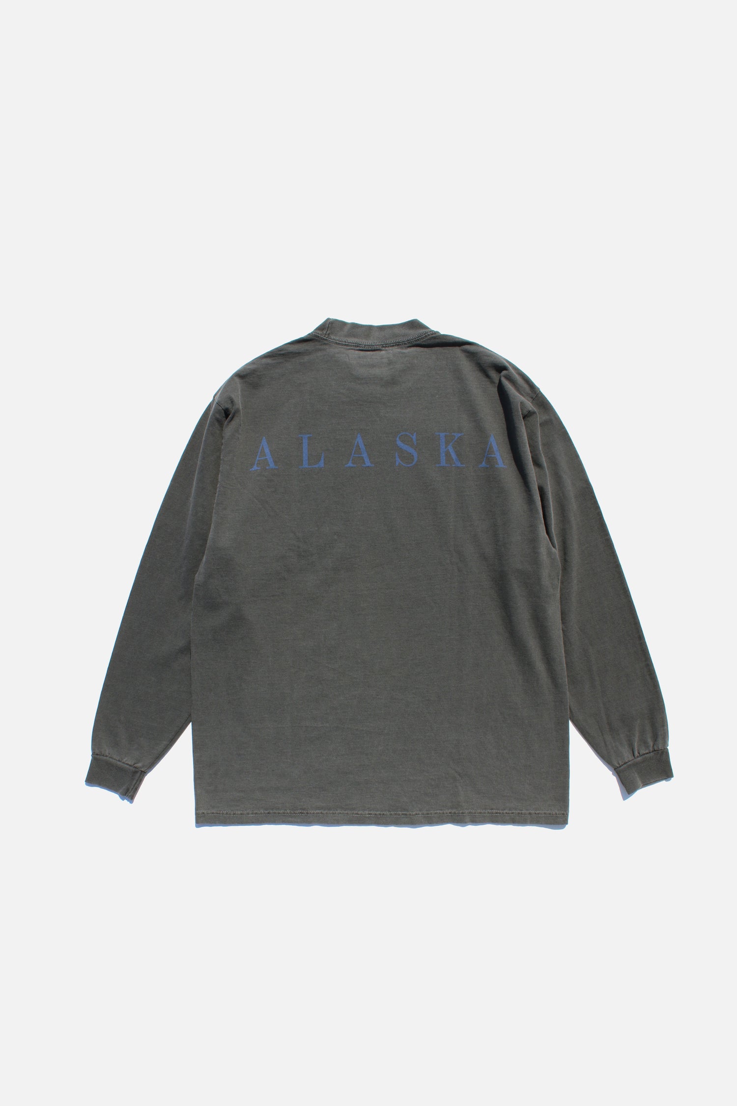 Dropped shoulder long sleeve t-shirt made using heavyweight pigment cotton. Inspired by the film Into the Wild (2007) and Jon Krakauer’s book (1996), both telling of a young man’s journey into Alaska. An Alaskan wolf’s howl on the front, Alaska on the back. Each piece unique, no printing the same.