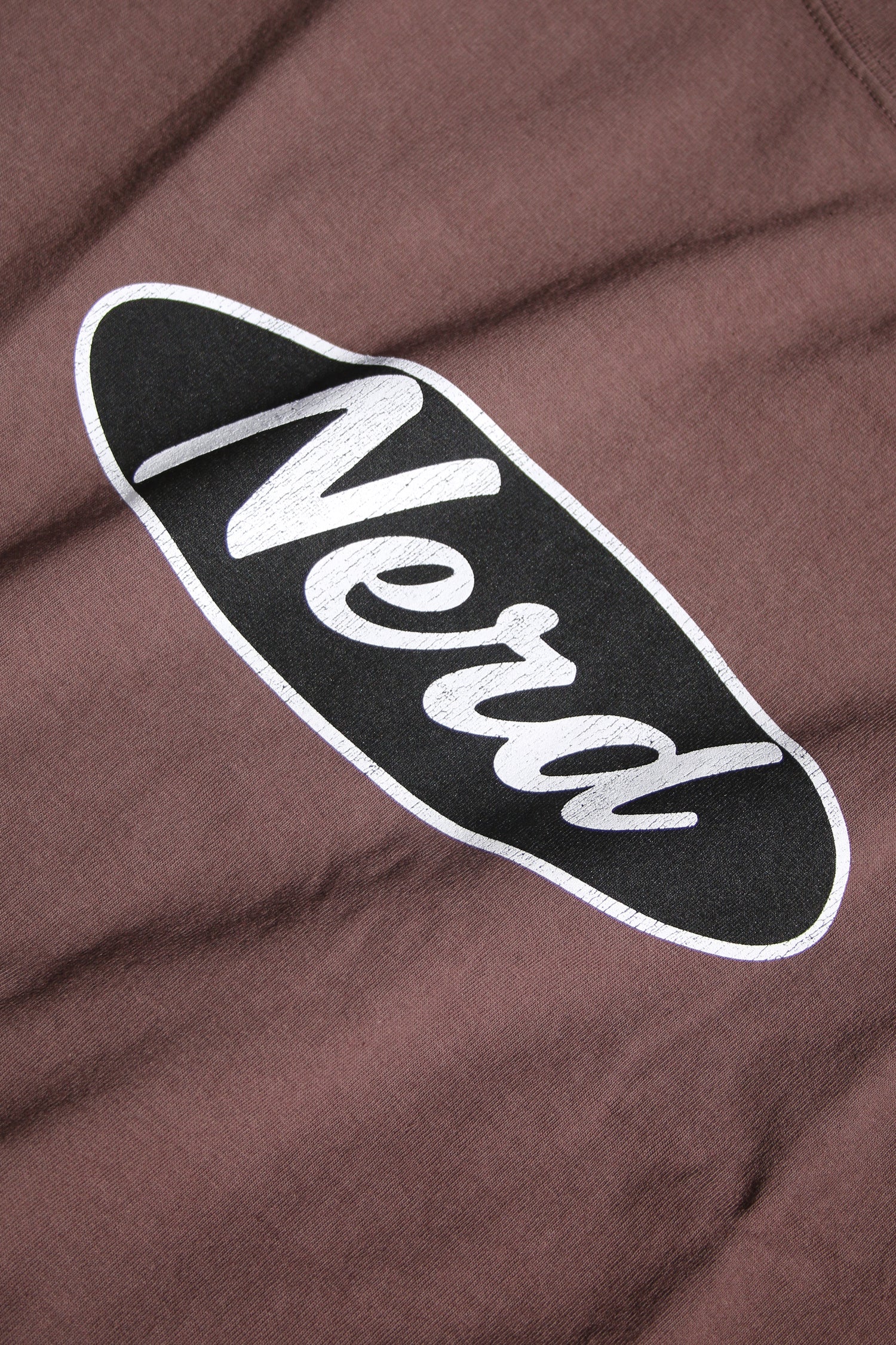 Oversized brown t-shirt has alphabet graphic NERD, inspired by Ford (American automobile manufacturer). Made using heavyweight pigment cotton. Unisex. NERD means 'Otaku' which describes people with consuming interests.