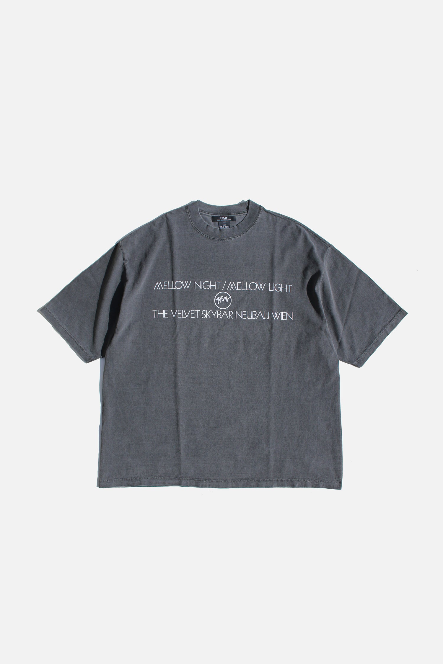 ESSAYの新型オーバーサイズピグメントドロップショルダーTシャツ。7.5ozヘビーウェイト天竺 / ピグメント(顔料)染料を使用した製品染めにより洗い重ねる度に退色し雰囲気の増す生地感が特徴。ウォッシュ&タンブラーの加工を施しドライな質感を表現。ヴィンテージスーベニアTシャツを元にグラフィックデザイン, オーストリアはウィーンに存在したバーの名前が記されている。 グラフィックはTHE VELVET UNDERGROUND(バンド)の"WHITE LIGHT / WHITE HEAT"(アルバム)がソース元となる。スクリーンプリントの風合いは個体によって若干の変化があります。