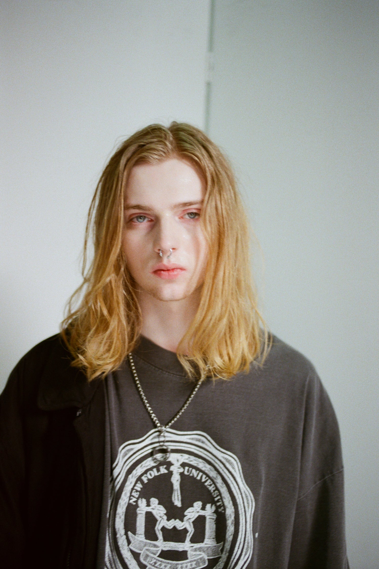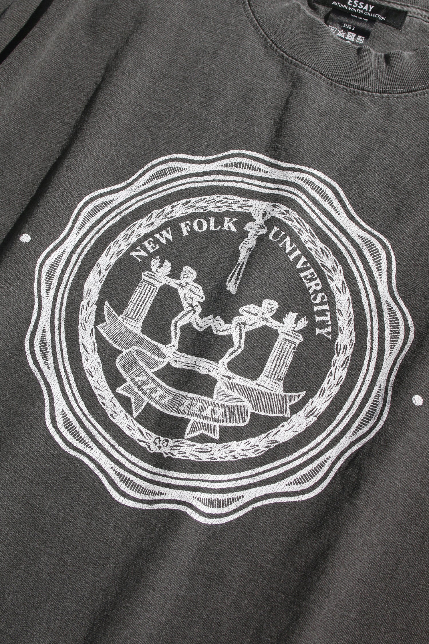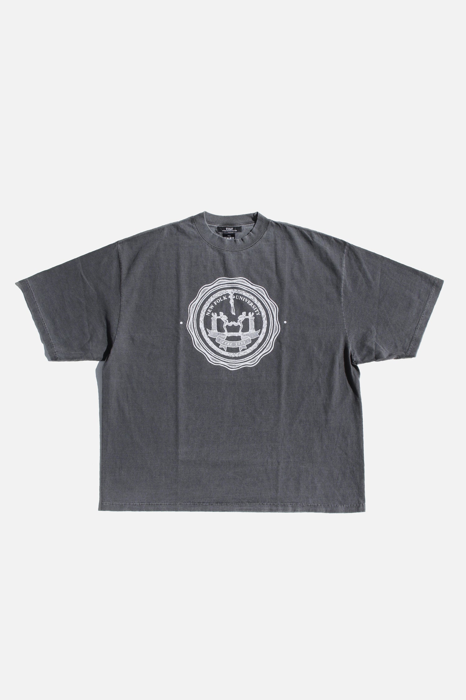 Oversized dropped shoulder t-shirt has graphic New Folk University, inspired by the seal of New York University. Made using heavyweight pigment cotton. Unisex.