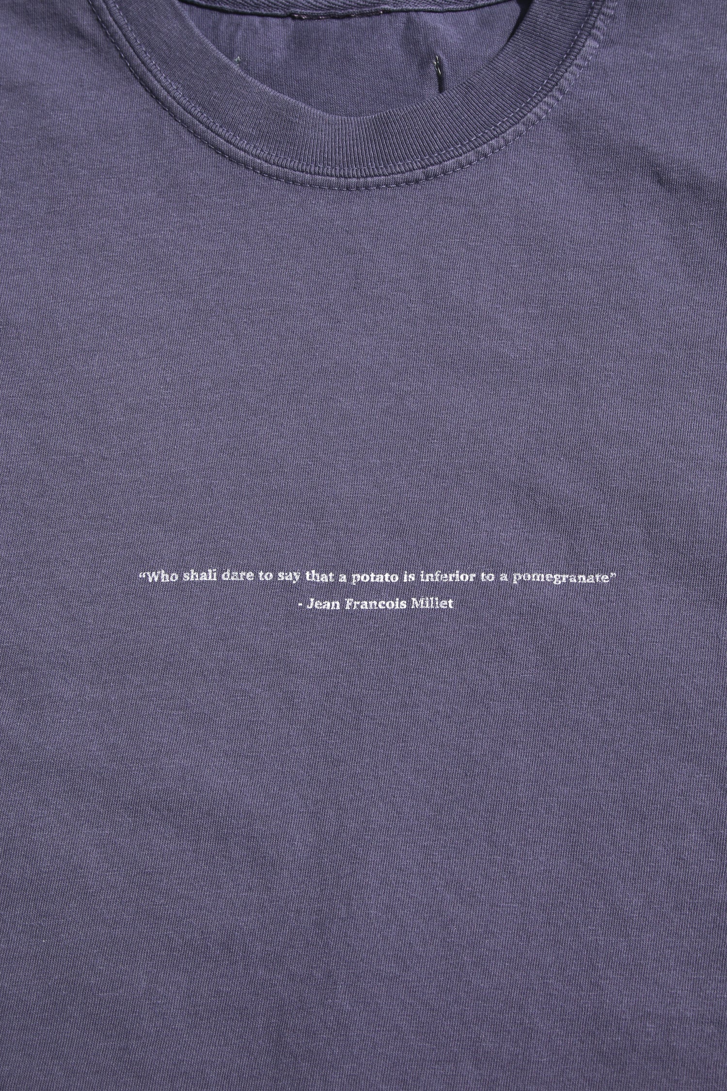 ESSAYの定番オーバーサイズピグメントノースーブTシャツ。肌触りがとてもよくピグメント天竺を使用しております。ピグメント(顔料)による製品染めにより 洗い重ねる度に退色し雰囲気の増す生地感が特徴。フロントに、文字プリントが施されています。仏画家ジャン・フランソワ・ミレーの言葉をプリント。「ジャガイモの方がザクロより劣っているなど、誰が断定できようか」を意味する。ハイサマーシーズン時、シャツのインナーアイテムとして提案。