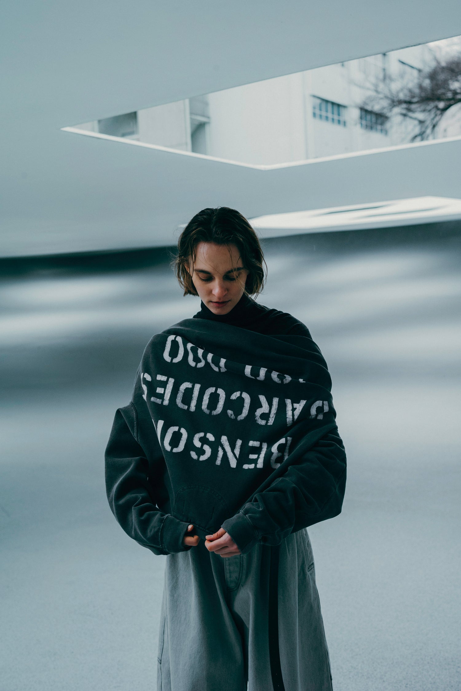 Oversized pigment sweatshirt in dry-fit pigment fabric loopback with seasonal graphic printings inspired by ‘opening up field of dark beats and walking upon a new world’ from vintage T-shirts.