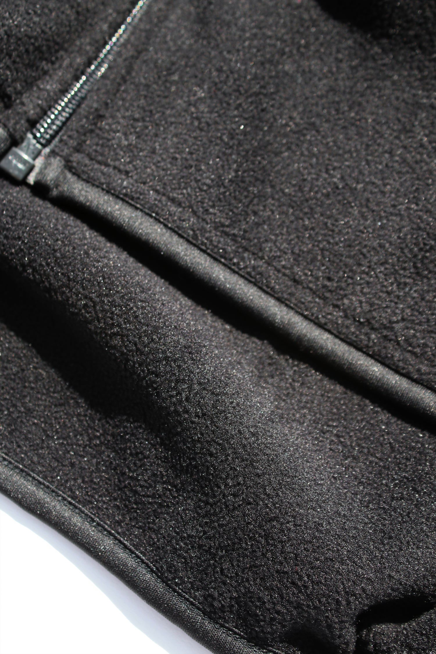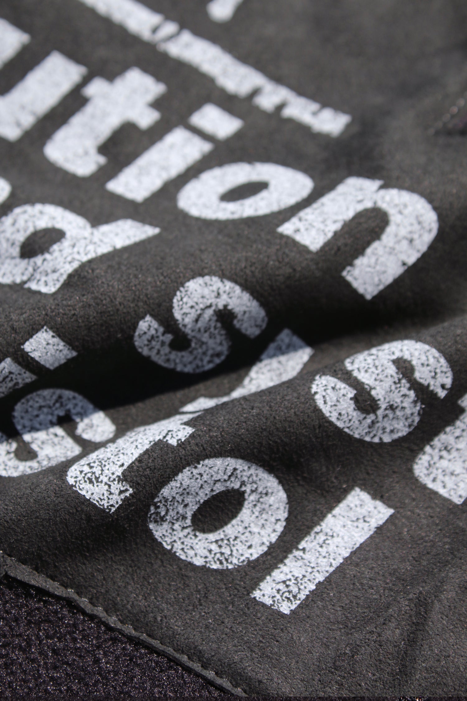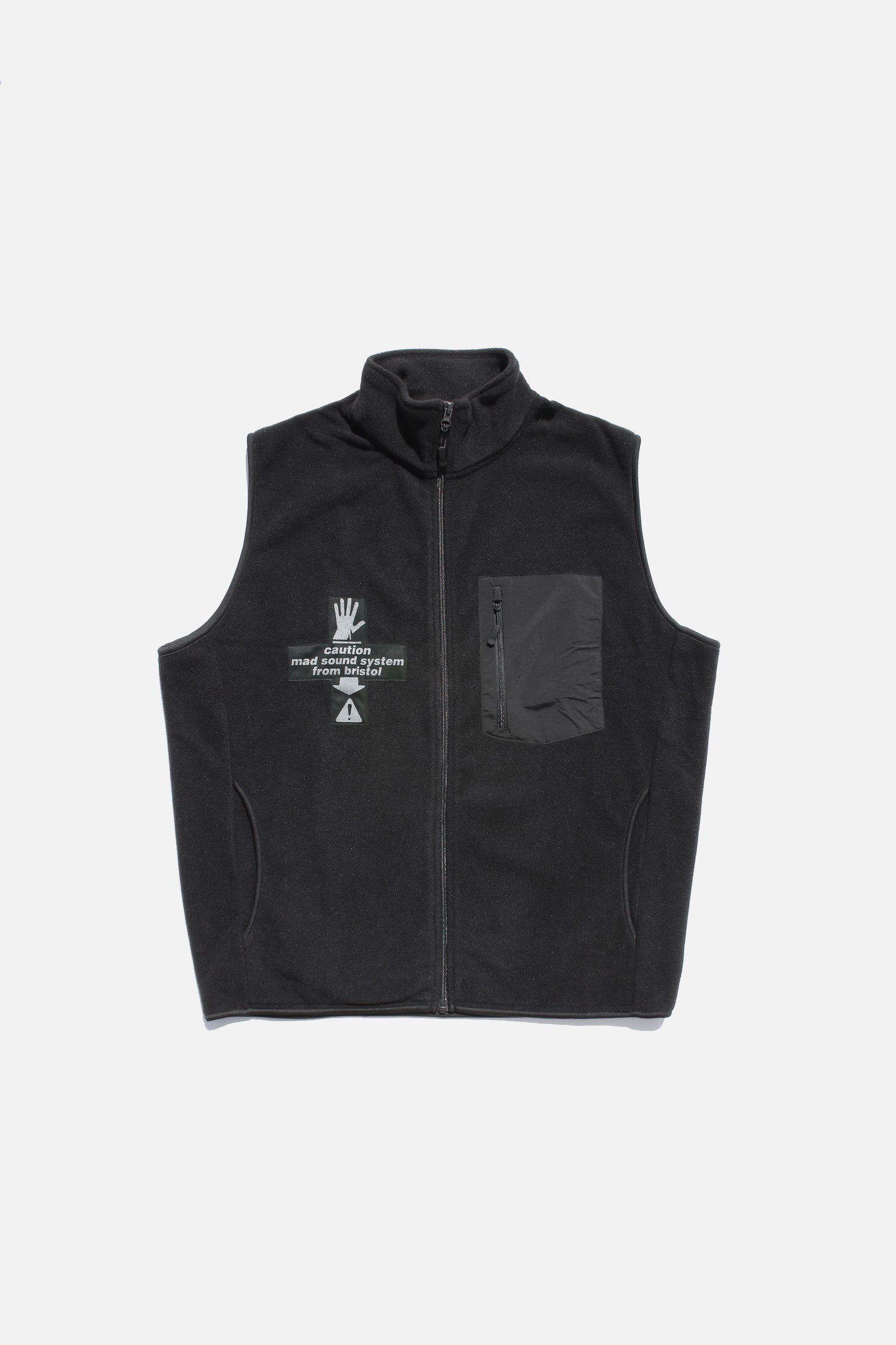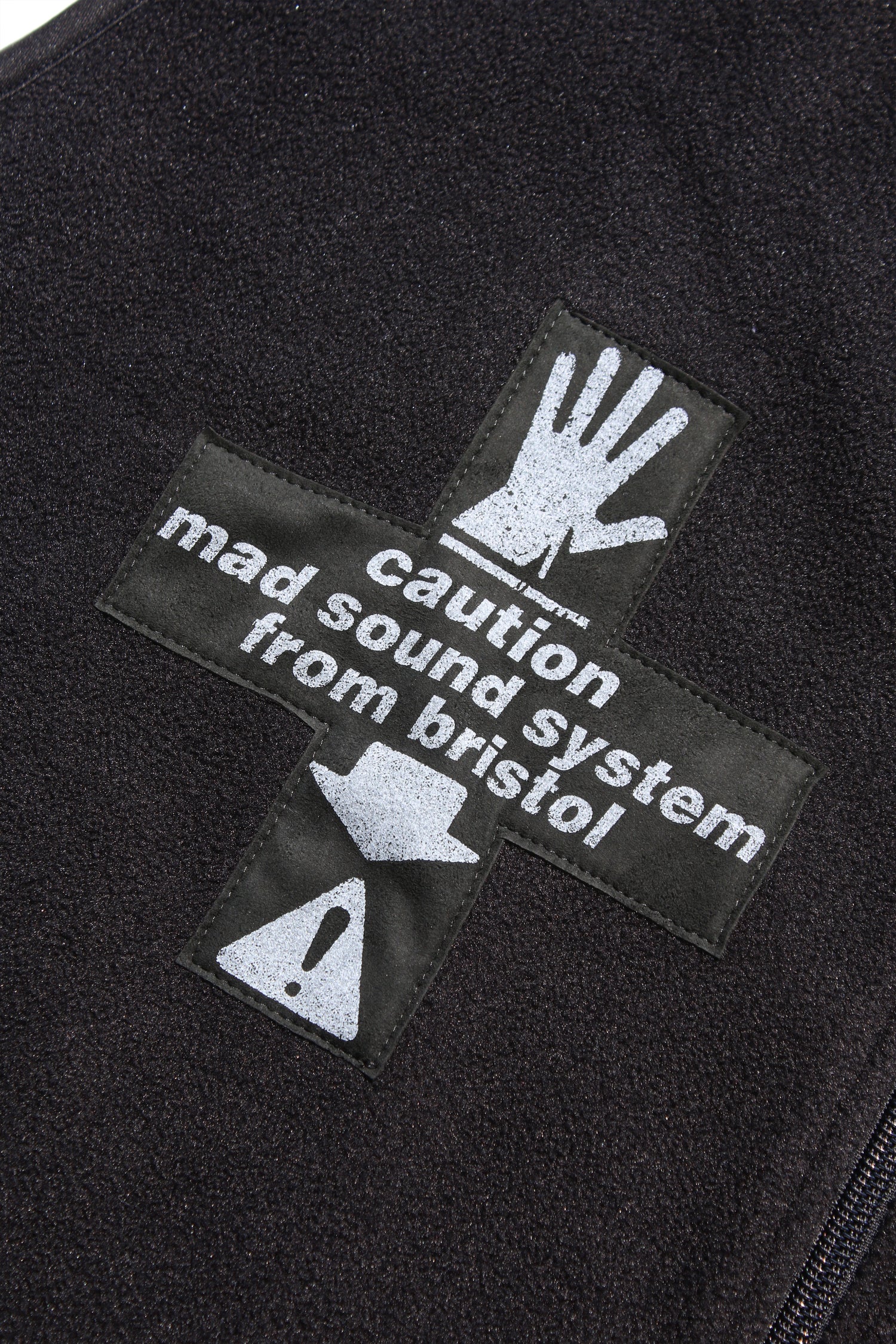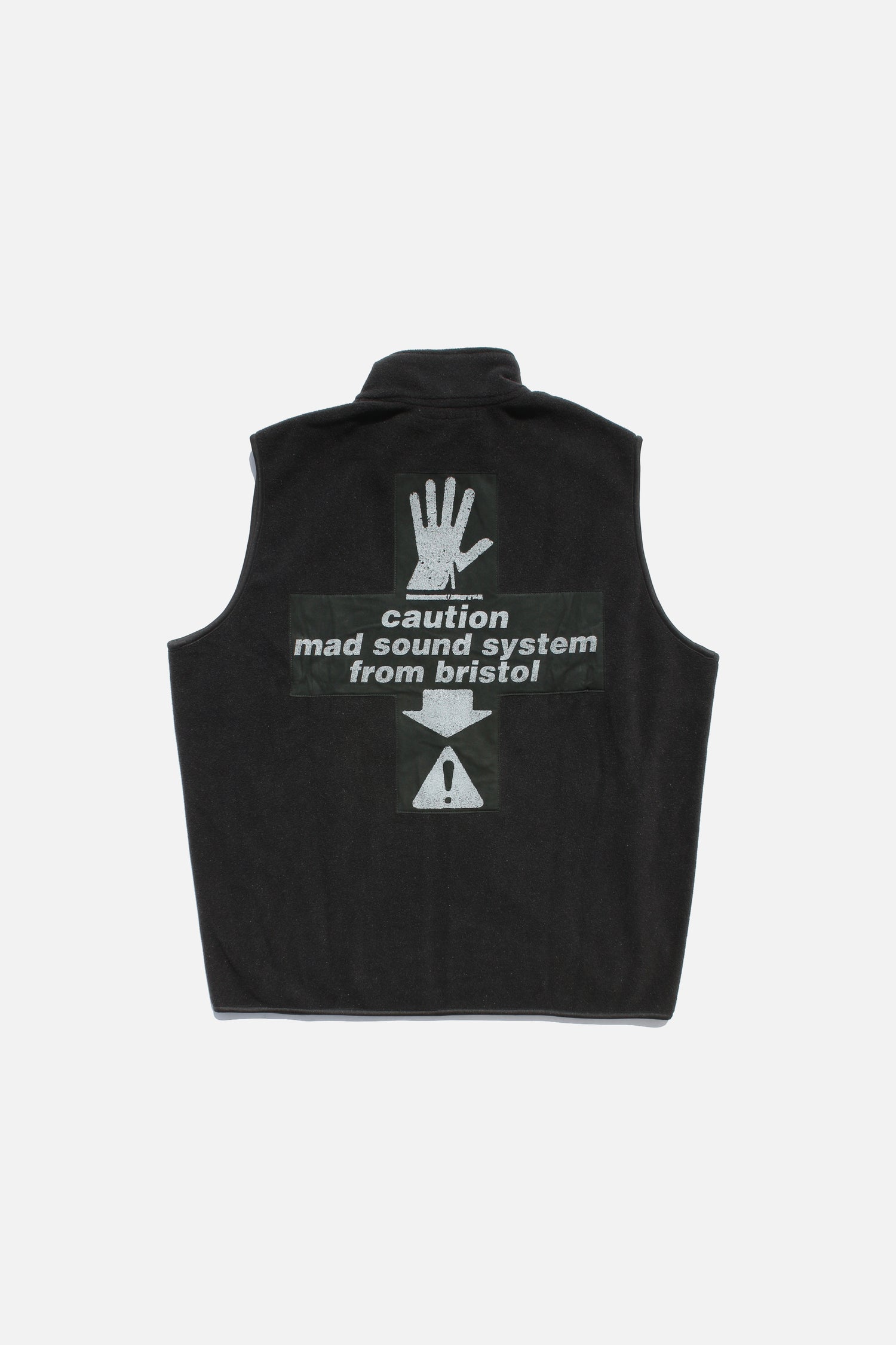 ポリエステルマイクロフリース生地を使用した柔かな風合いが特徴のレイブベスト。セミオーバーサイズ。90年代イギリスはブリストルの音楽シーンを着想にグラフィックデザイン。当時のストリートアートシーン(アテンションモチーフを使用したデザインなど)が色濃く反映されている。 左胸、両サイドにポケットを配置し、高い収納力を確保。
