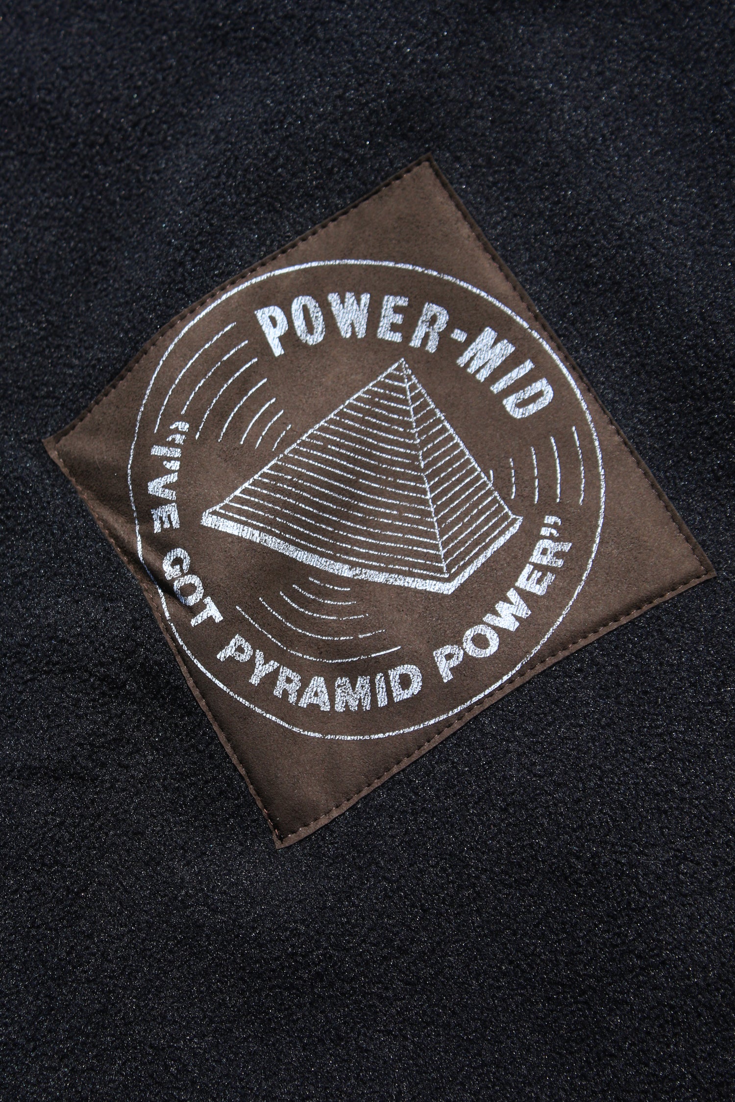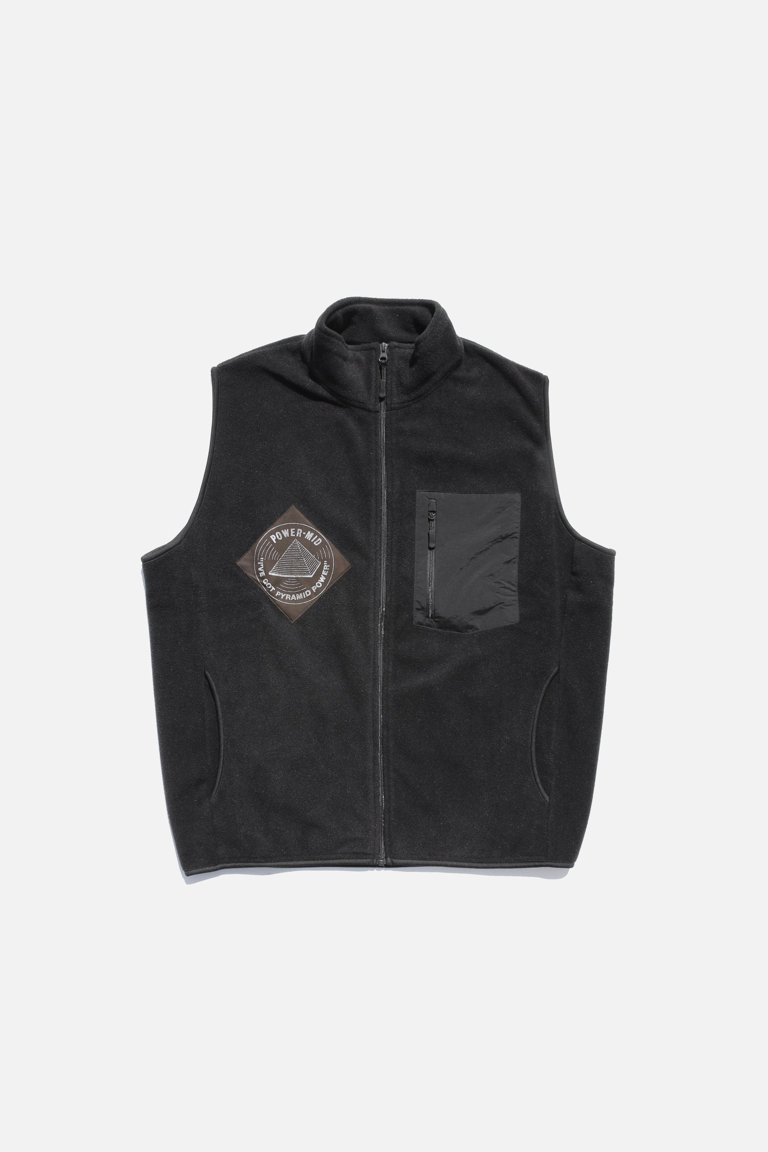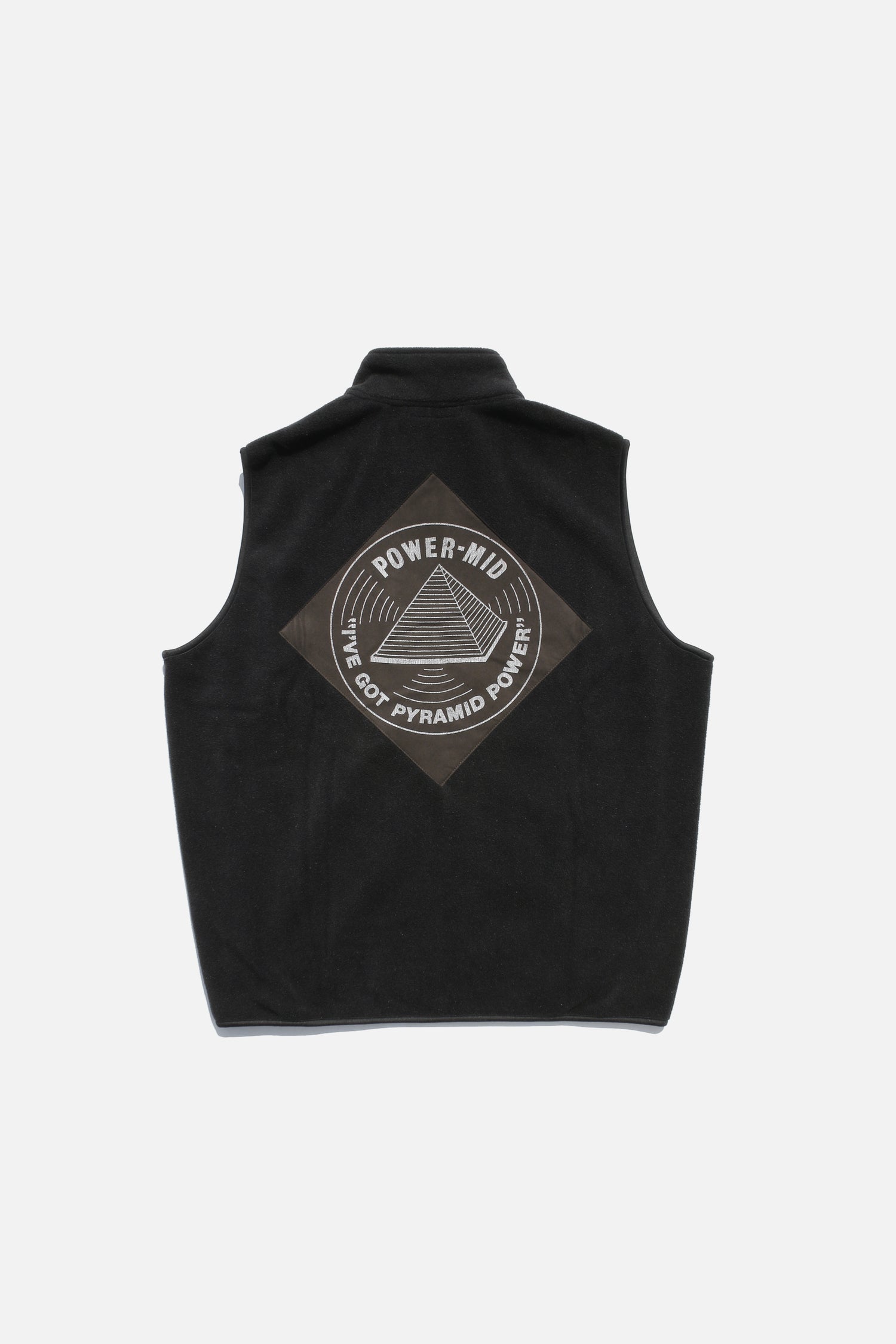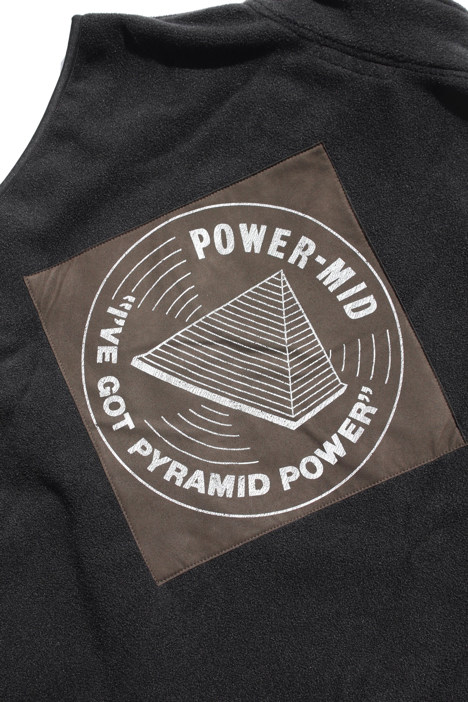 ポリエステルマイクロフリース生地を使用した柔かな風合いが特徴のレイブベスト。セミオーバーサイズ。VINTAGE Tシャツで見つけたピラミッドモチーフのグラフィックを着想にデザイン。パワーミッドというネーミング、ピラミッドから出るパルス、などポップな印象が特徴的なグッドデザイン。左胸、両サイドにポケットを配置し、高い収納力を確保。