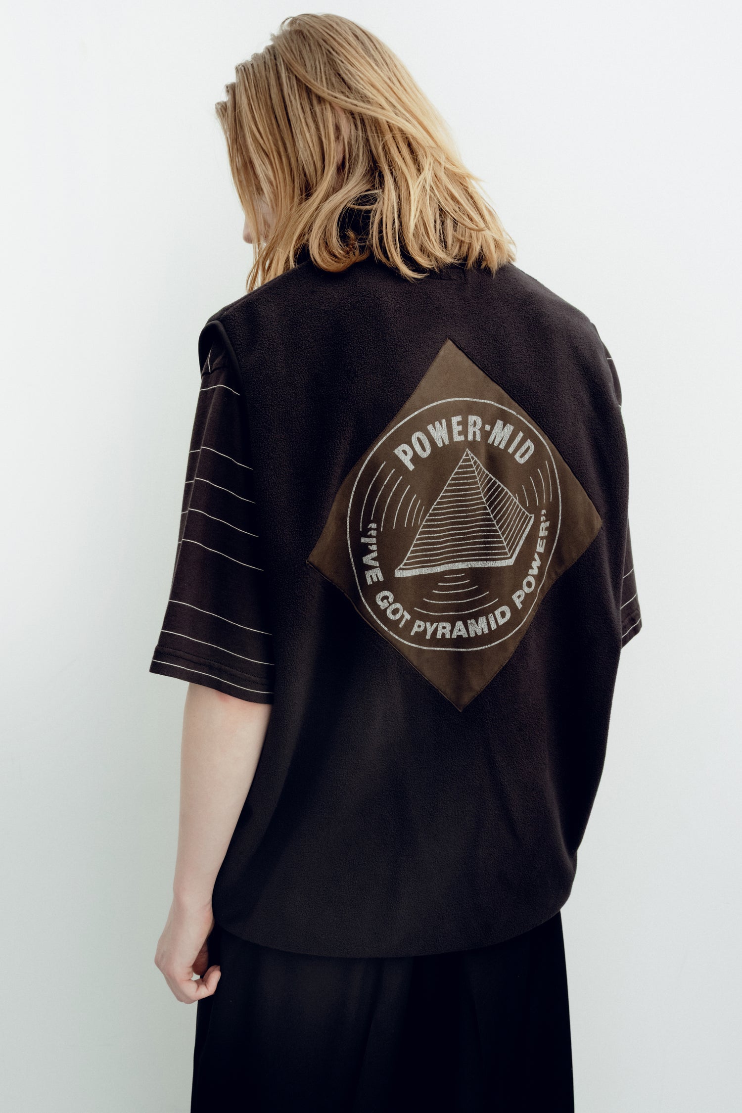 Relaxed-fit vest, with zip fastening, chest and side pockets. Crafted by using lightweight polyester micro fleece. Influenced by a pyramid graphic found on vintage T-shirts, where "Pyramid Power" and radiating lines suggest a mysterious force.
