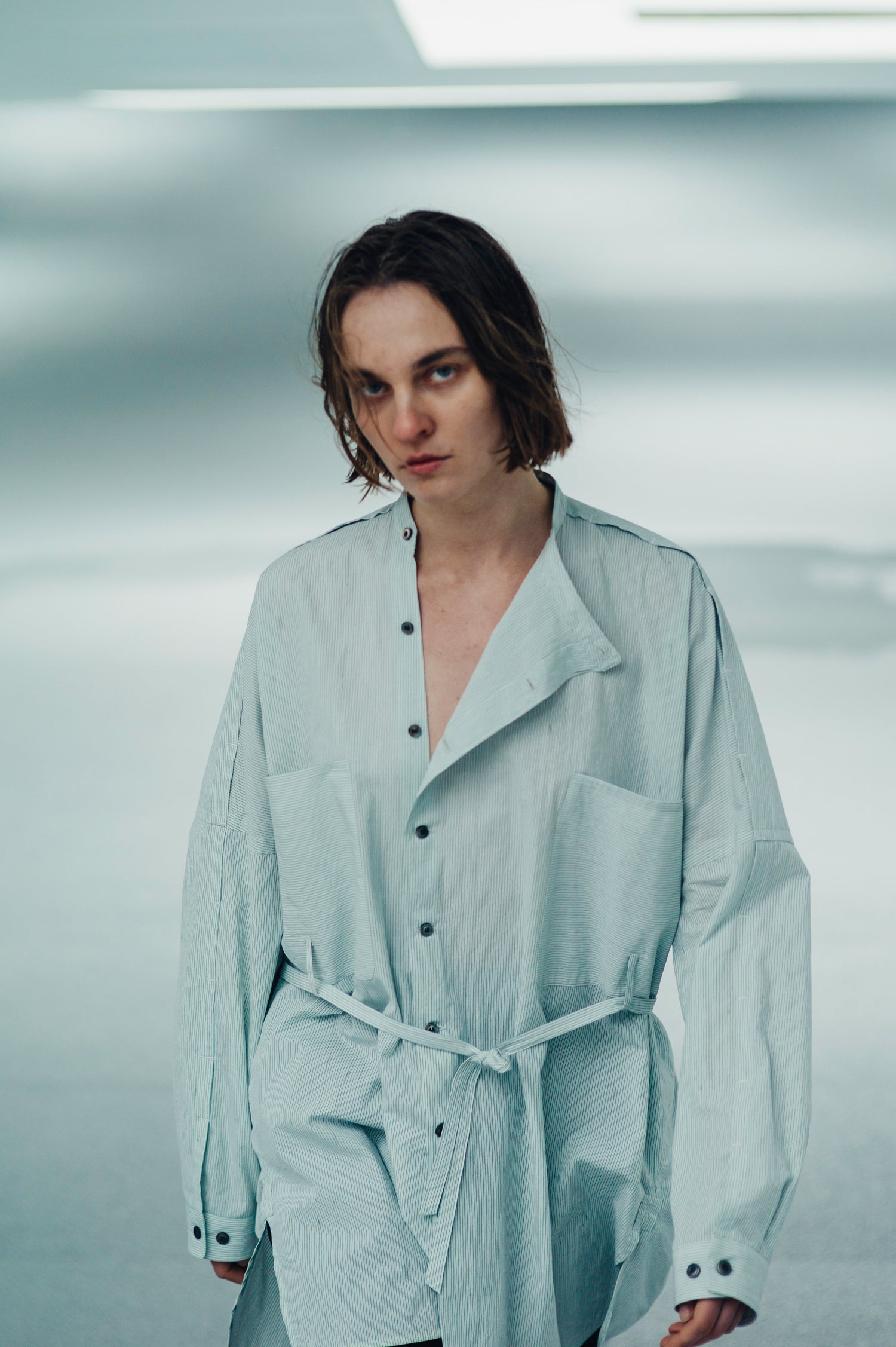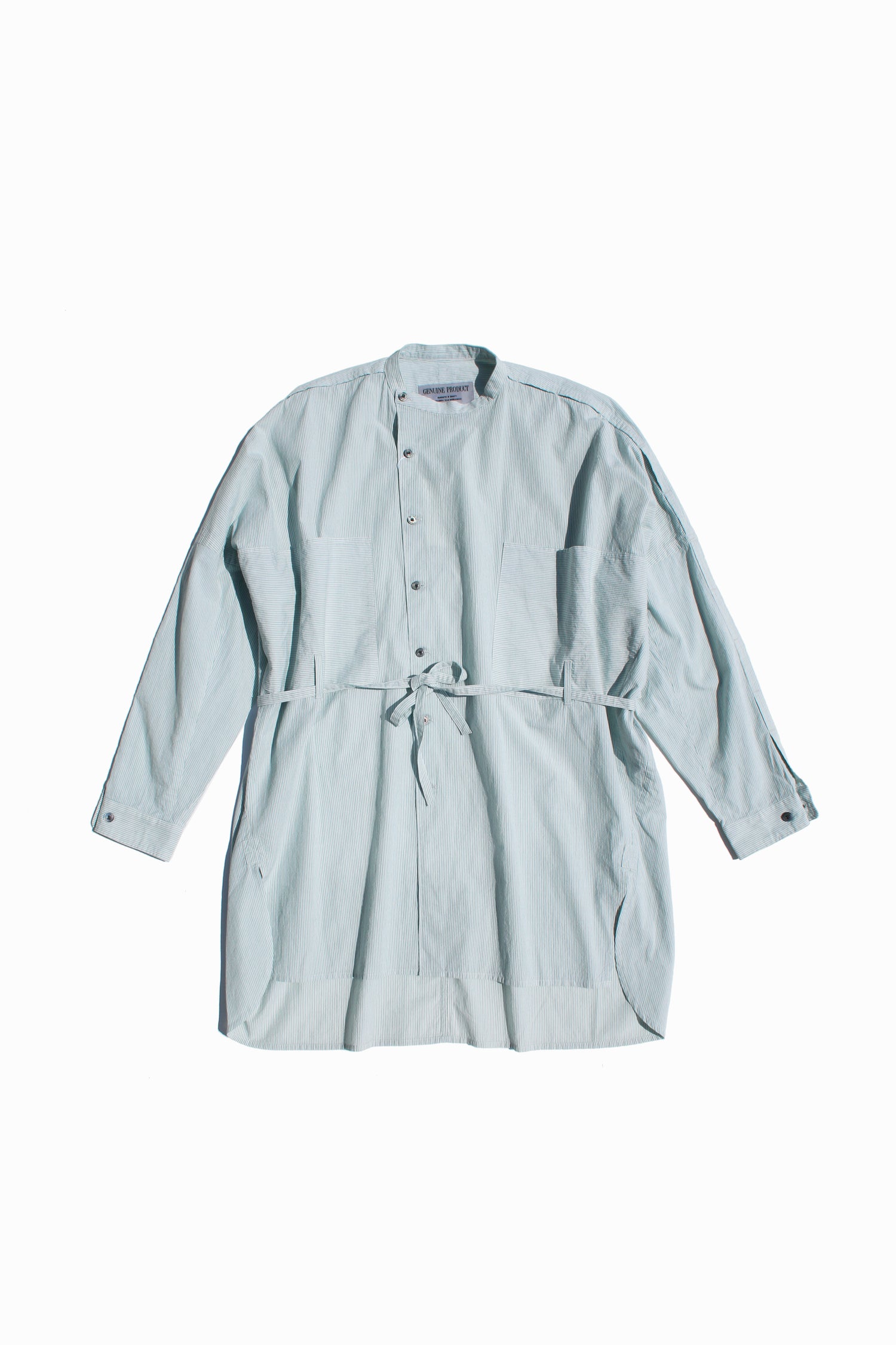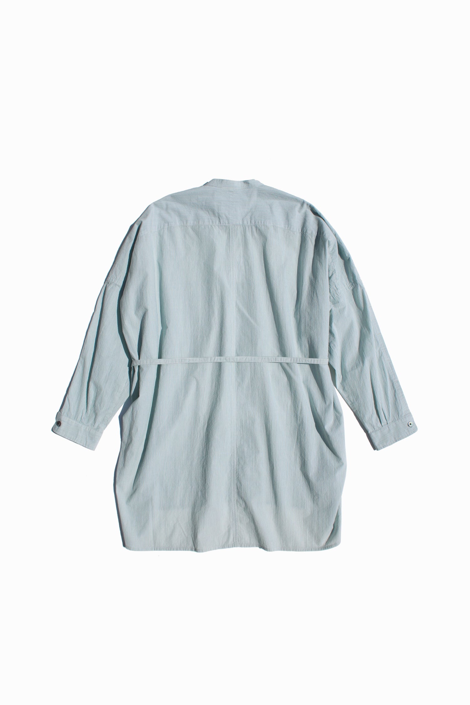 Relaxed officer shirt in a dry cotton voile striped fabric with vintage textured surface. It is cut with slanted front fastening and shoulder openings, inspired by British military officer shirt and workwears. Detailed with vertical light-green stripes, stepped hem construction and oversized-fit but still structured with resequenced belt and chest pockets.