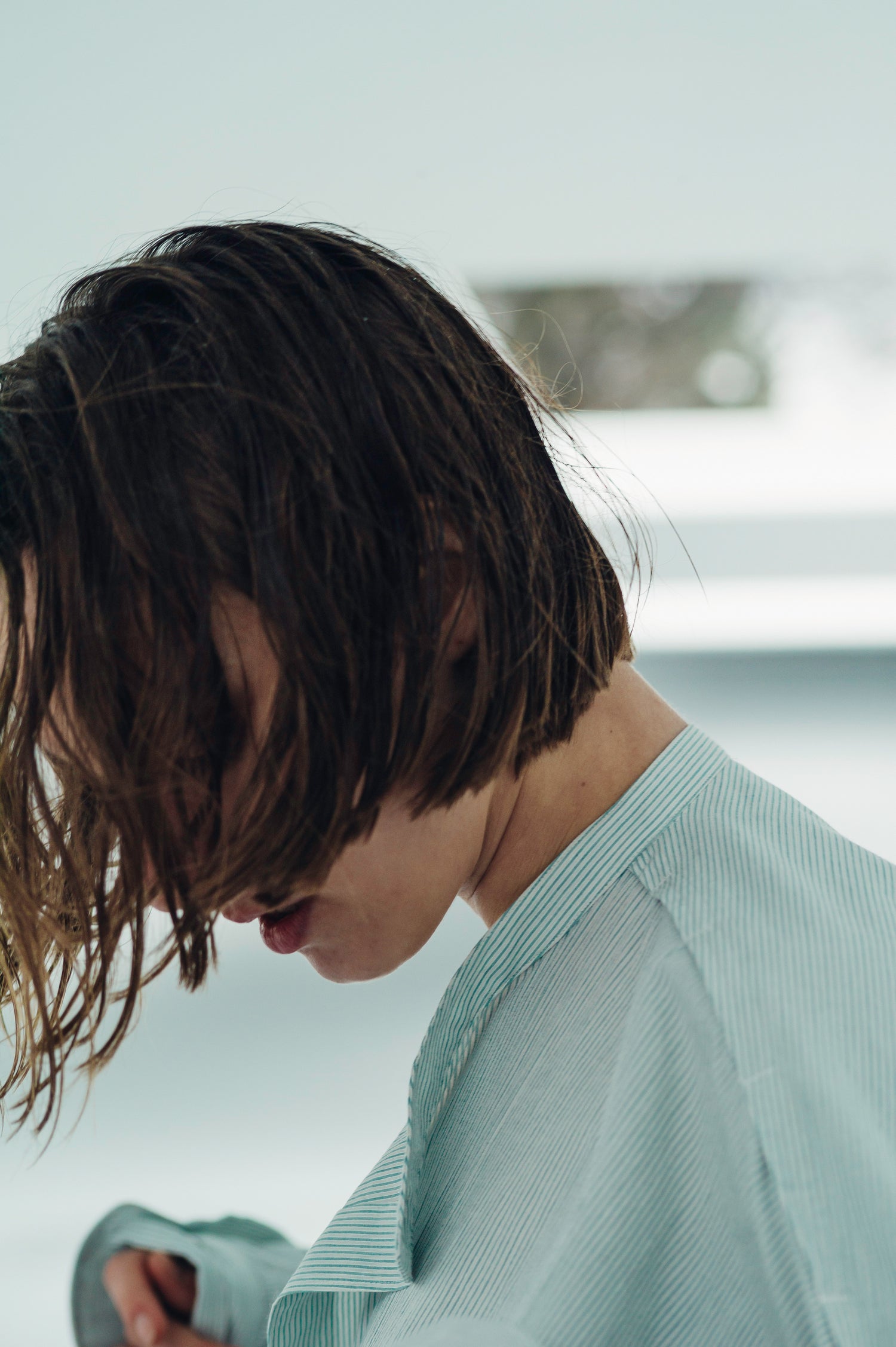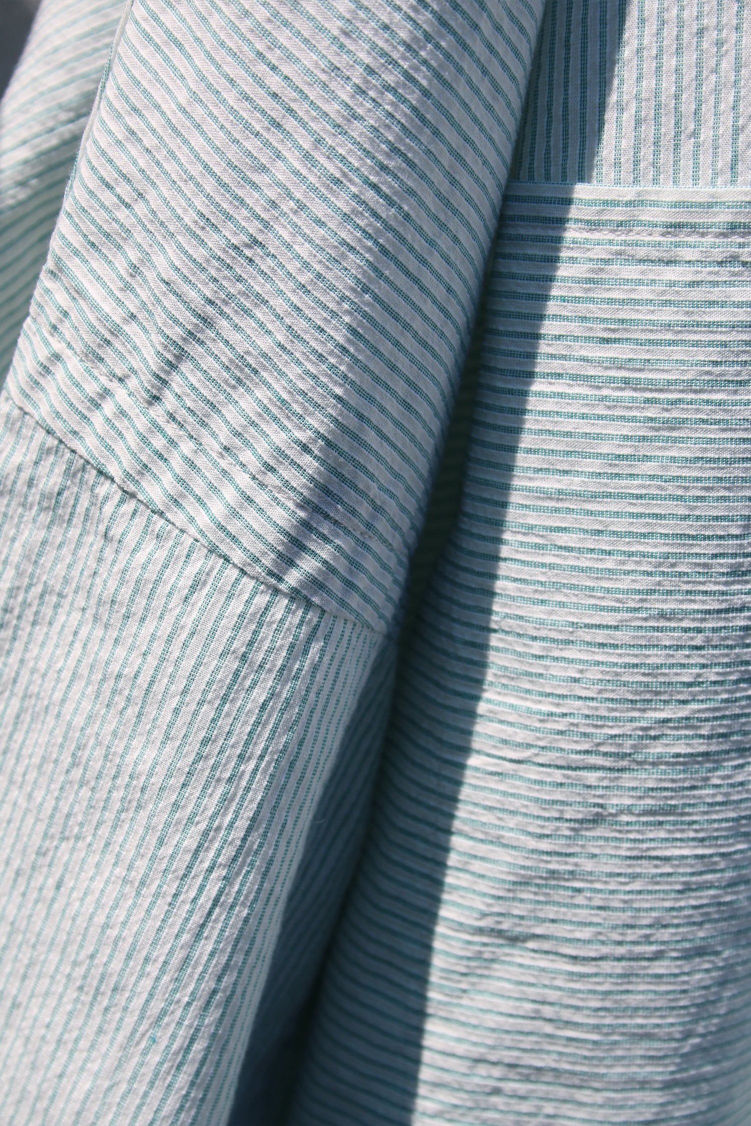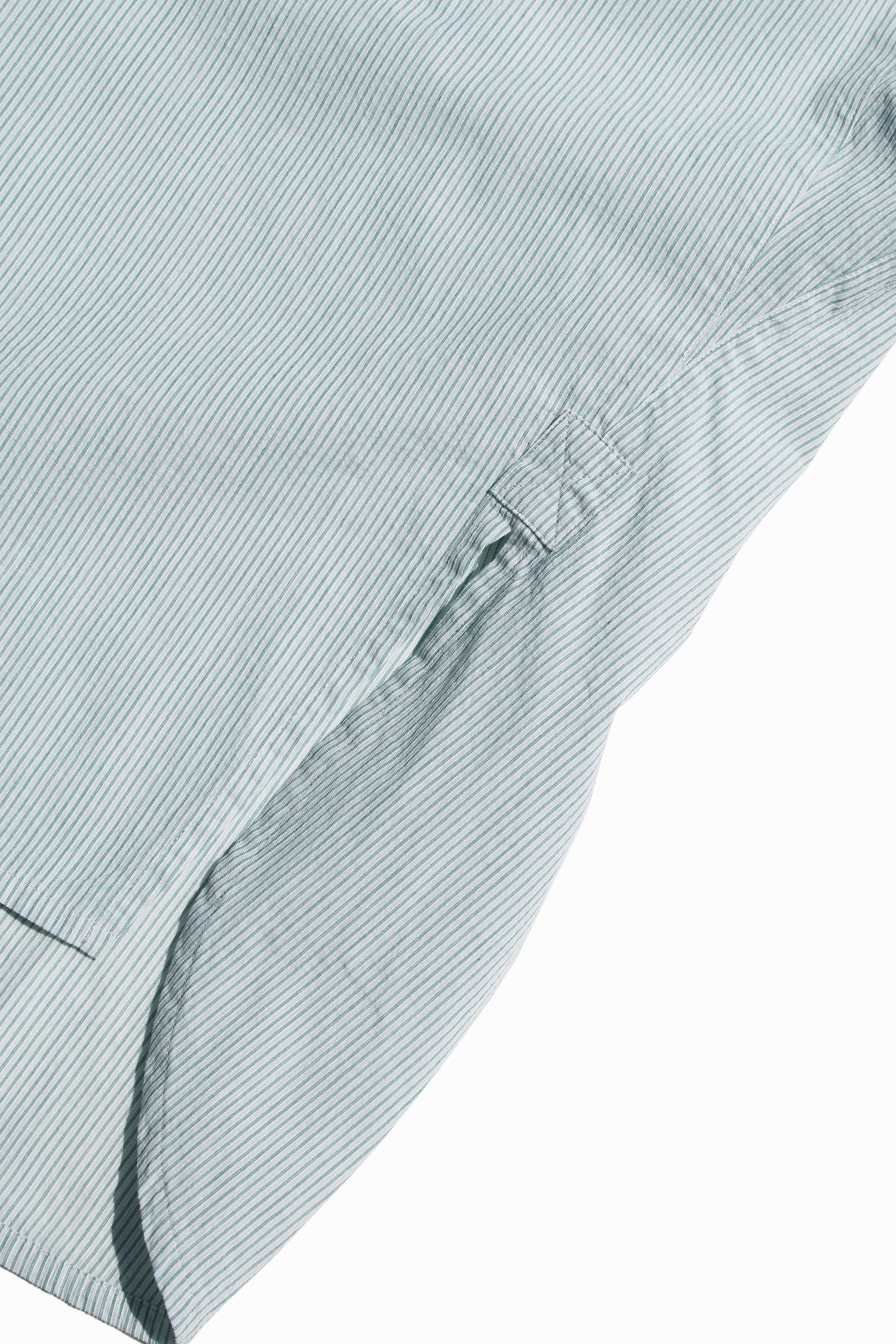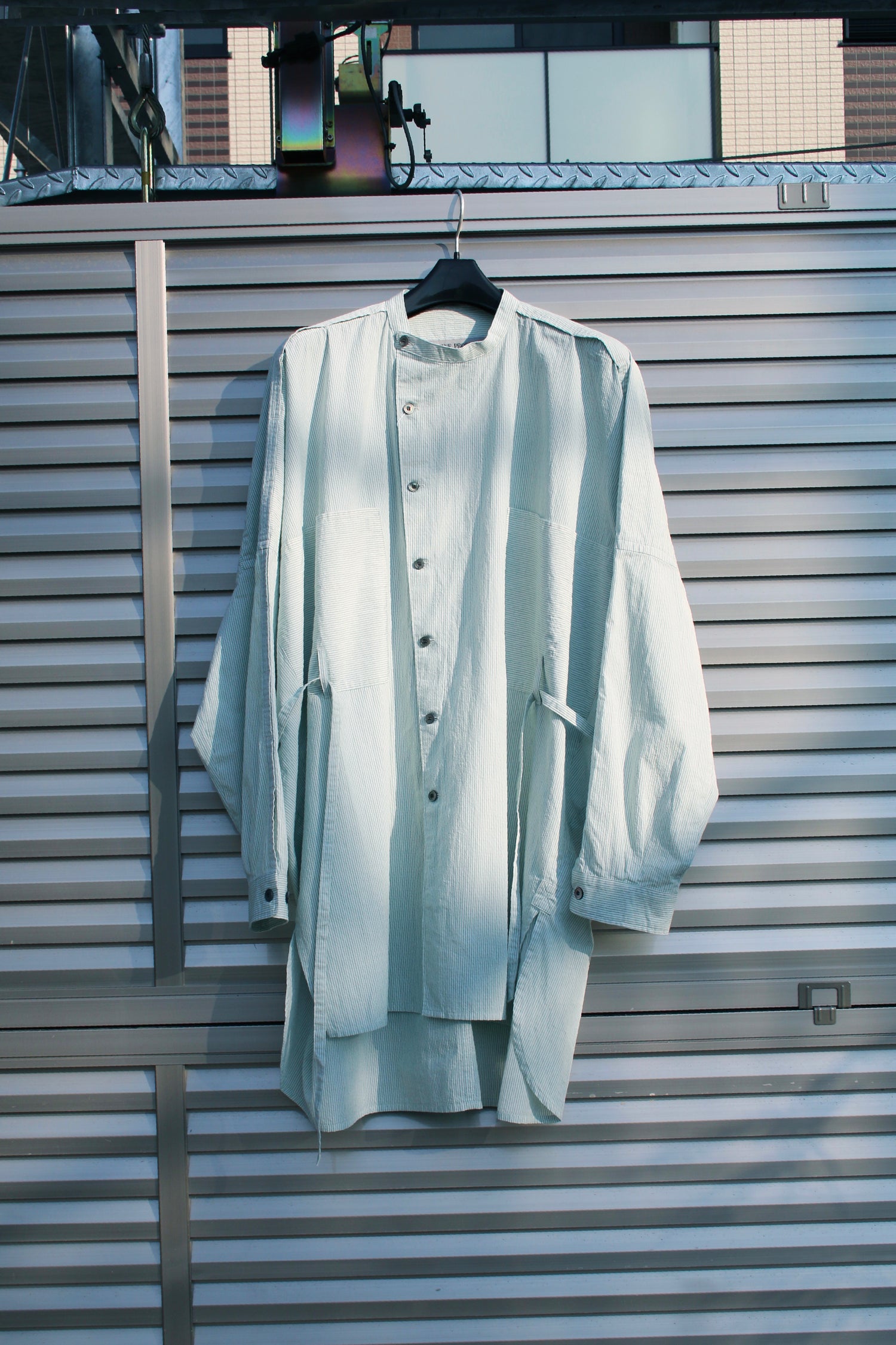 Relaxed officer shirt in a dry cotton voile striped fabric with vintage textured surface. It is cut with slanted front fastening and shoulder openings, inspired by British military officer shirt and workwears. Detailed with vertical light-green stripes, stepped hem construction and oversized-fit but still structured with resequenced belt and chest pockets.