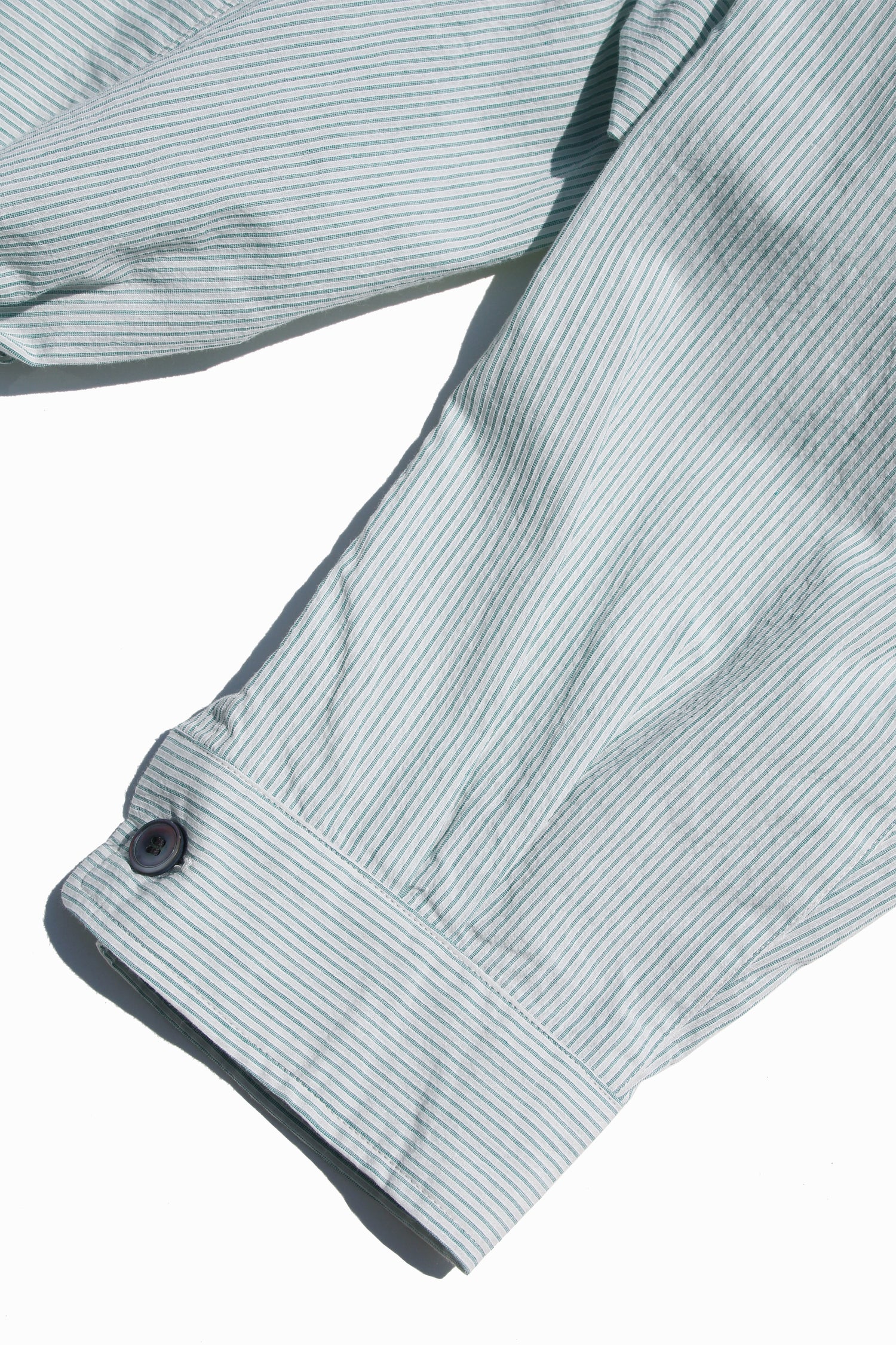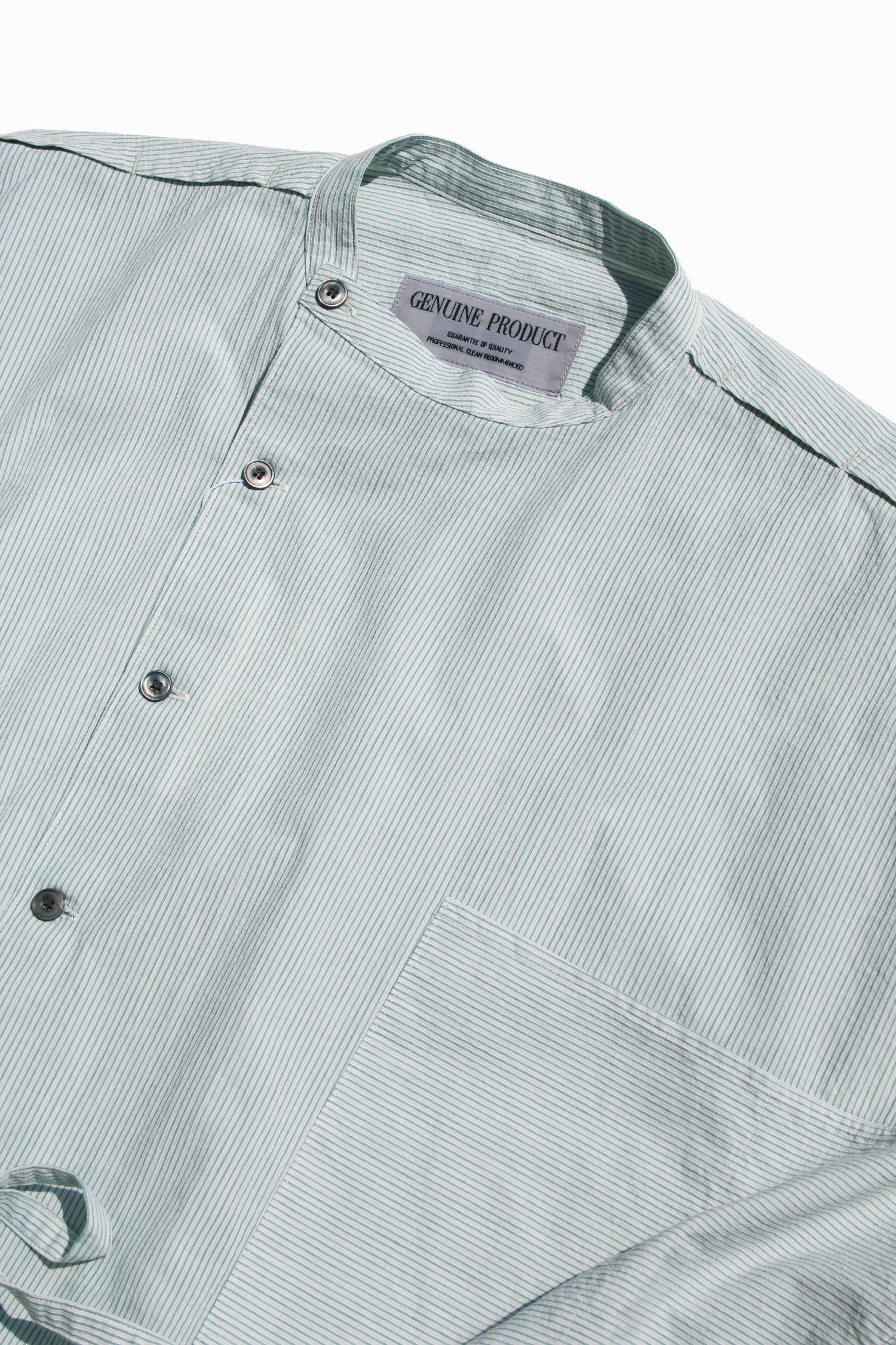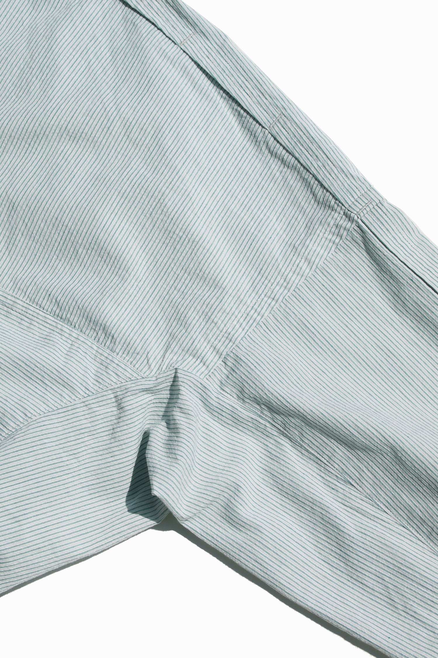 コットンボイルを使用したESSAY︎︎の新型スラントオフィサーシャツ。特殊な織りと加工によるヴィンテージライクな表情感、そして清潔さ、品のあるグリーンストライプが新鮮な素材。 ウォッシュ&タンブラーの加工を施しドライな質感を表現。細番手・細運針を採用したドレスシャツに近い縫製が印象的な一本です。イギリス軍のオフィサーシャツをインスポレーションに、 ESSAY定番品であるドレープシャツとスラントシャツを調和させた1着。通気性を意識した特徴的なショルダーデザインや斜めに開くフロント仕様により他に類をみない上品なシャツへと仕上がっている。 オーバーサイズシルエットで、ユニセックスで着用頂けます。