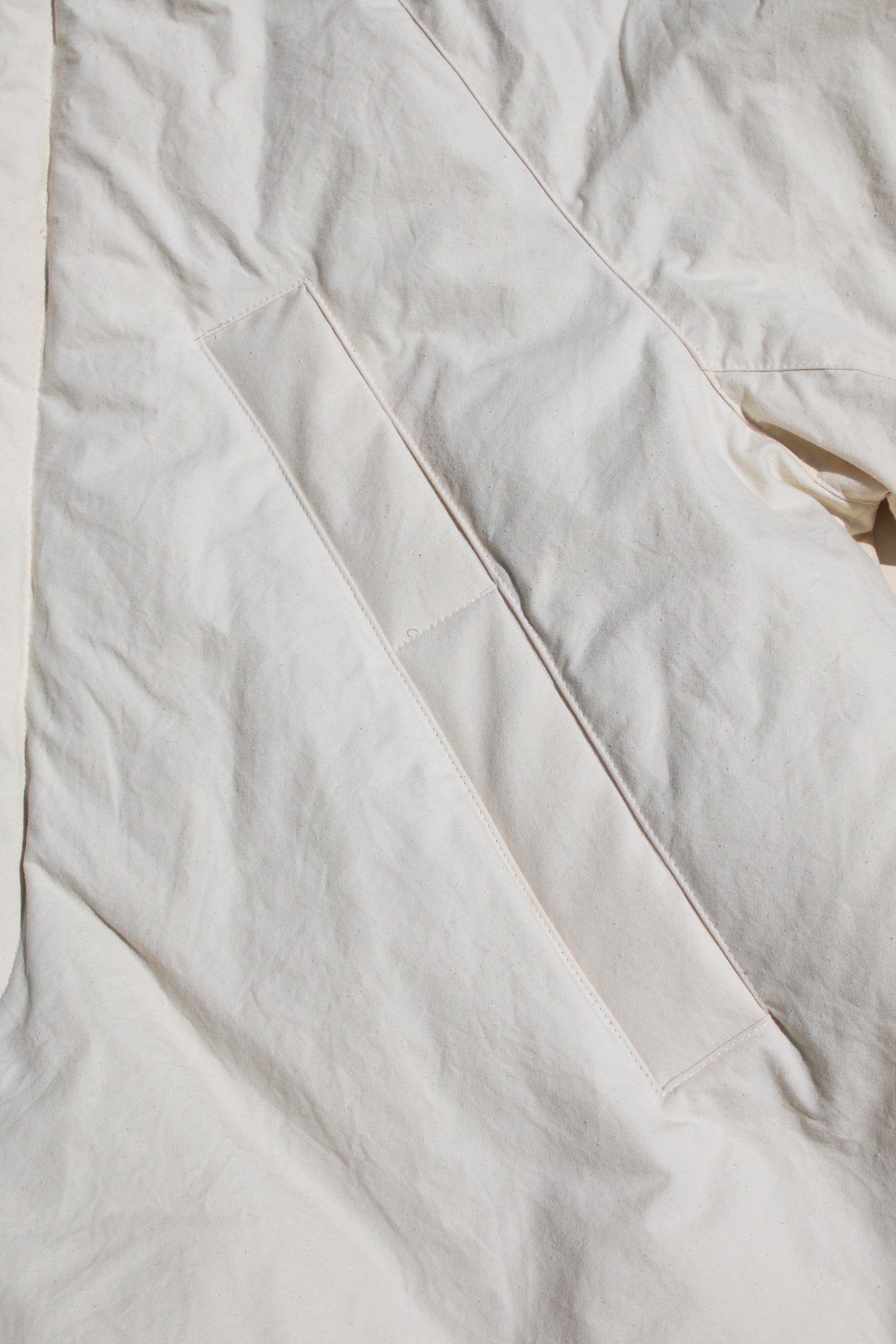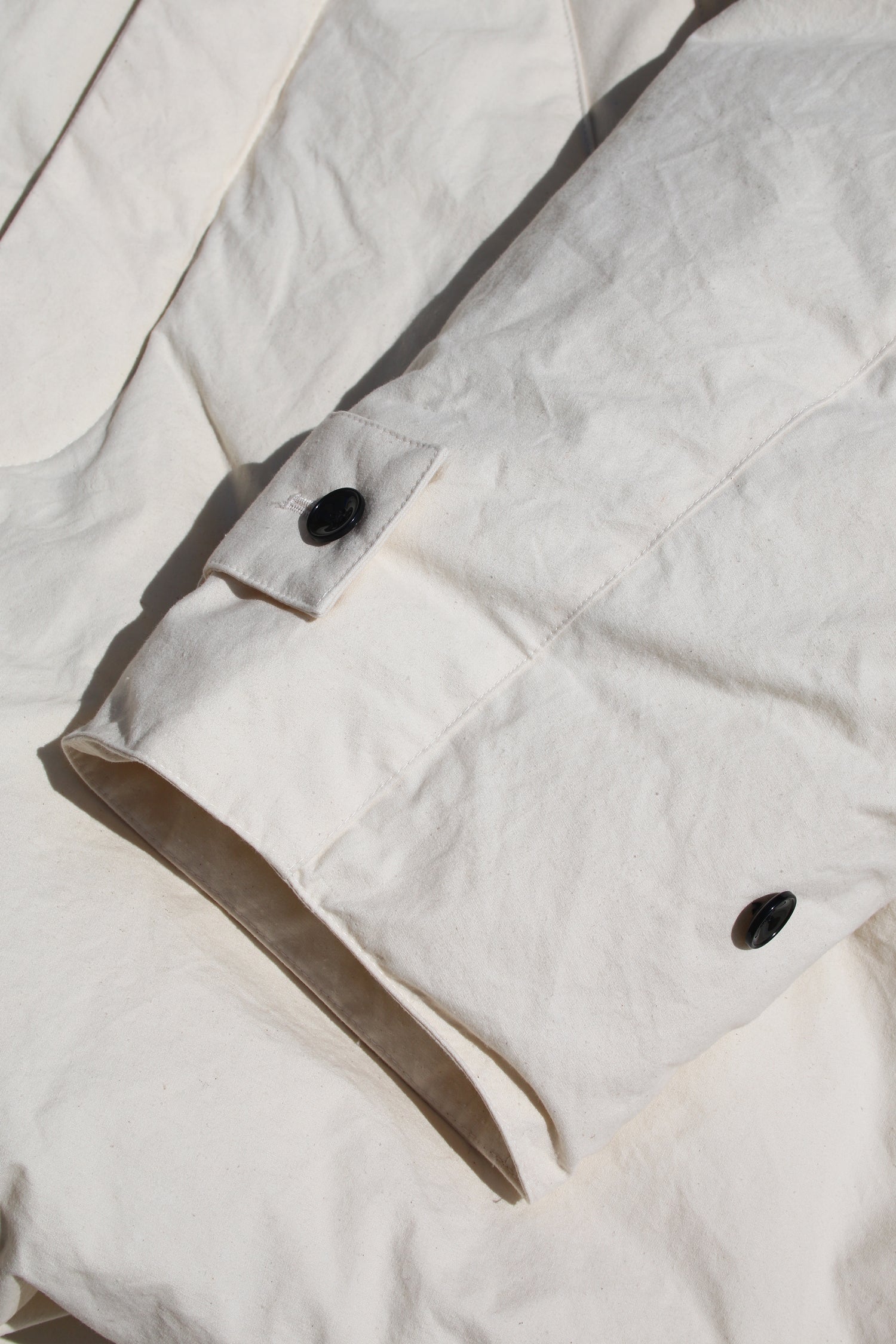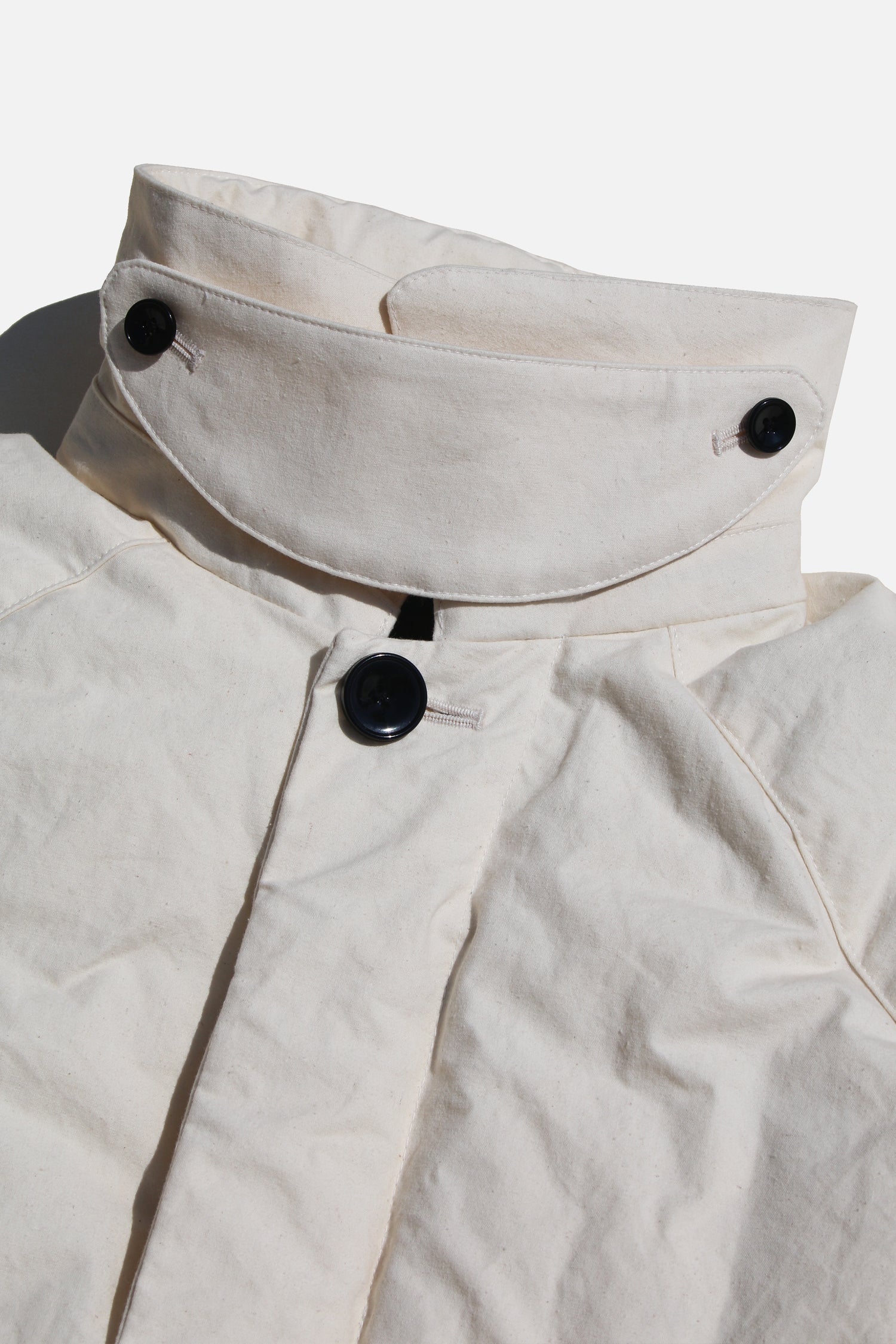 シワ感のあるコットン素材を用いた国産の高品質ダウンオーバーコート。KINARIとNAVYの2色展開。暖かさと軽い着心地と迫力のあるシルエットが特徴です。大阪の泉州にて、20番綿糸を機械式織機で高密度に織られた生地。染めはコールドバッチ染色機で染めており、天然繊維の持つ豊かな表情・風合を表現するため、機械的な張力・圧力を極力加えないよう加工。最後はワッシャー仕上げを施しています。ワッシャーによるシワができている可能性がありますが、生地の特徴としてお楽しみください。中綿にはフィルパワー700~750以上の国産ダウンを使用しているので、軽くて暖かく、雨雪にも安心感がございます。タブのボタンで開襟・立襟の調整が可能。袖口にはアジャスターストラップが施され、風の侵入を防ぎます。大きめのフロントハンドポケットが特徴。背面にはセンターベントが入ります。