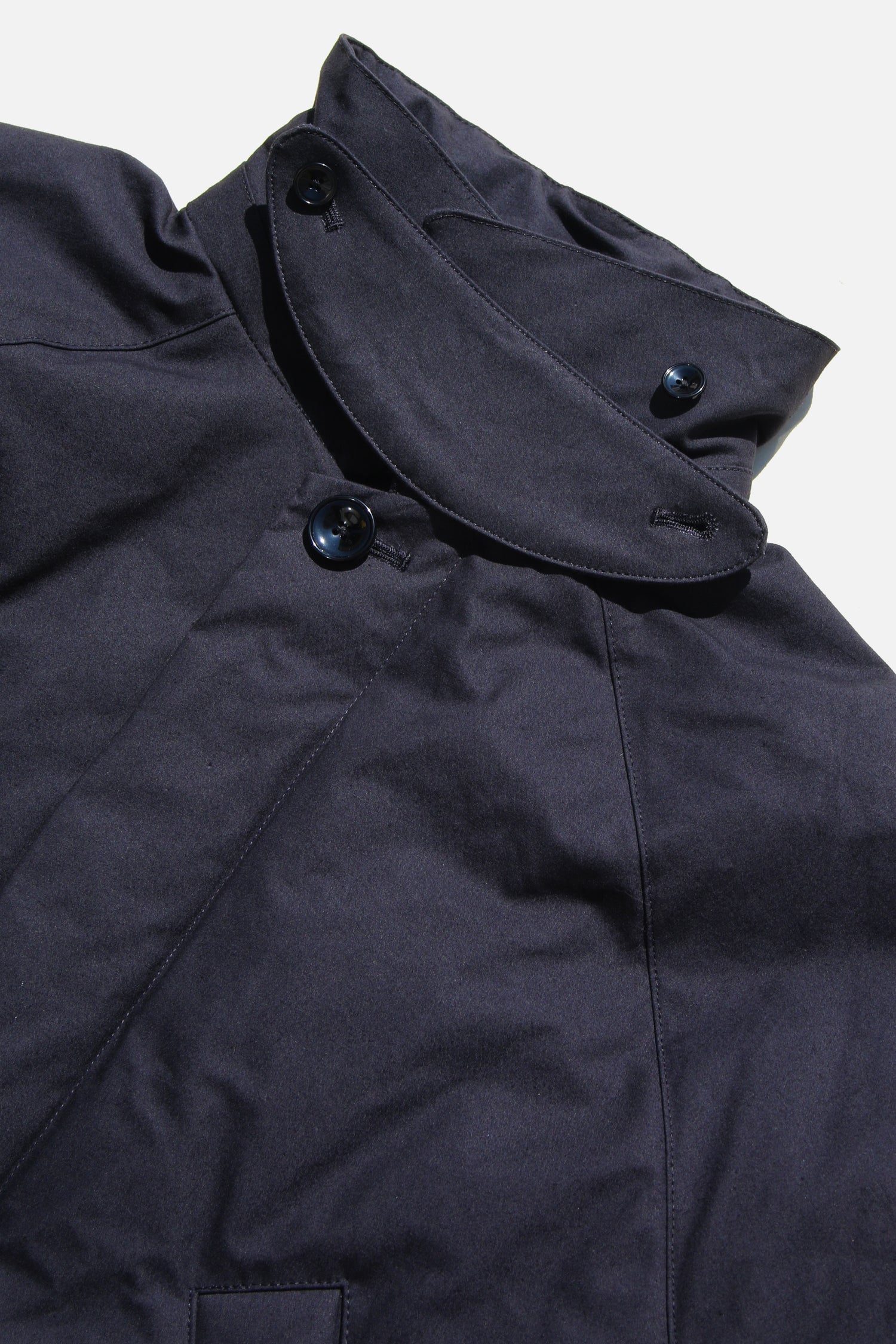 シワ感のあるコットン素材を用いた国産の高品質ダウンオーバーコート。KINARIとNAVYの2色展開。暖かさと軽い着心地と迫力のあるシルエットが特徴です。大阪の泉州にて、20番綿糸を機械式織機で高密度に織られた生地。染めはコールドバッチ染色機で染めており、天然繊維の持つ豊かな表情・風合を表現するため、機械的な張力・圧力を極力加えないよう加工。最後はワッシャー仕上げを施しています。ワッシャーによるシワができている可能性がありますが、生地の特徴としてお楽しみください。中綿にはフィルパワー700~750以上の国産ダウンを使用しているので、軽くて暖かく、雨雪にも安心感がございます。タブのボタンで開襟・立襟の調整が可能。袖口にはアジャスターストラップが施され、風の侵入を防ぎます。大きめのフロントハンドポケットが特徴。背面にはセンターベントが入ります。