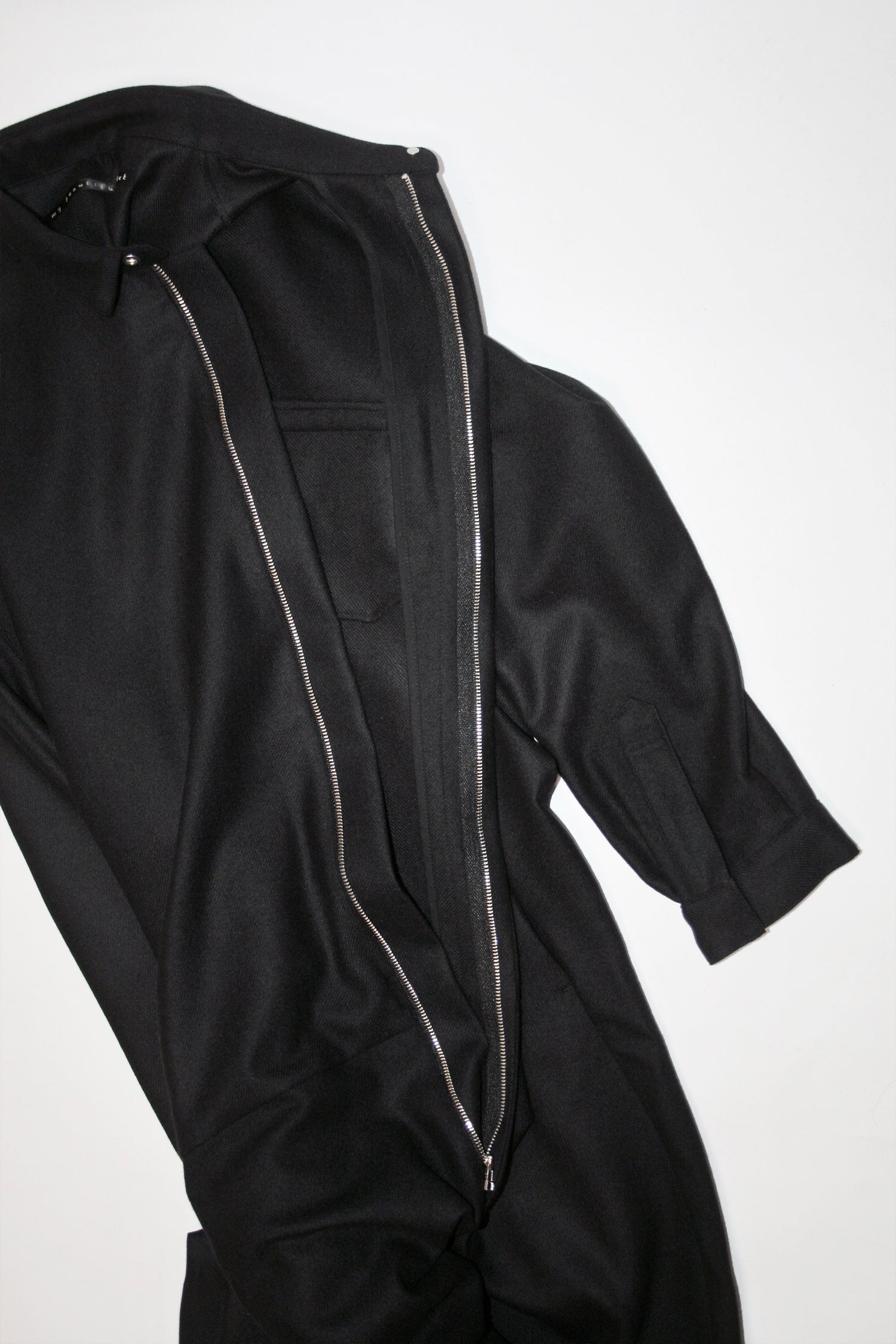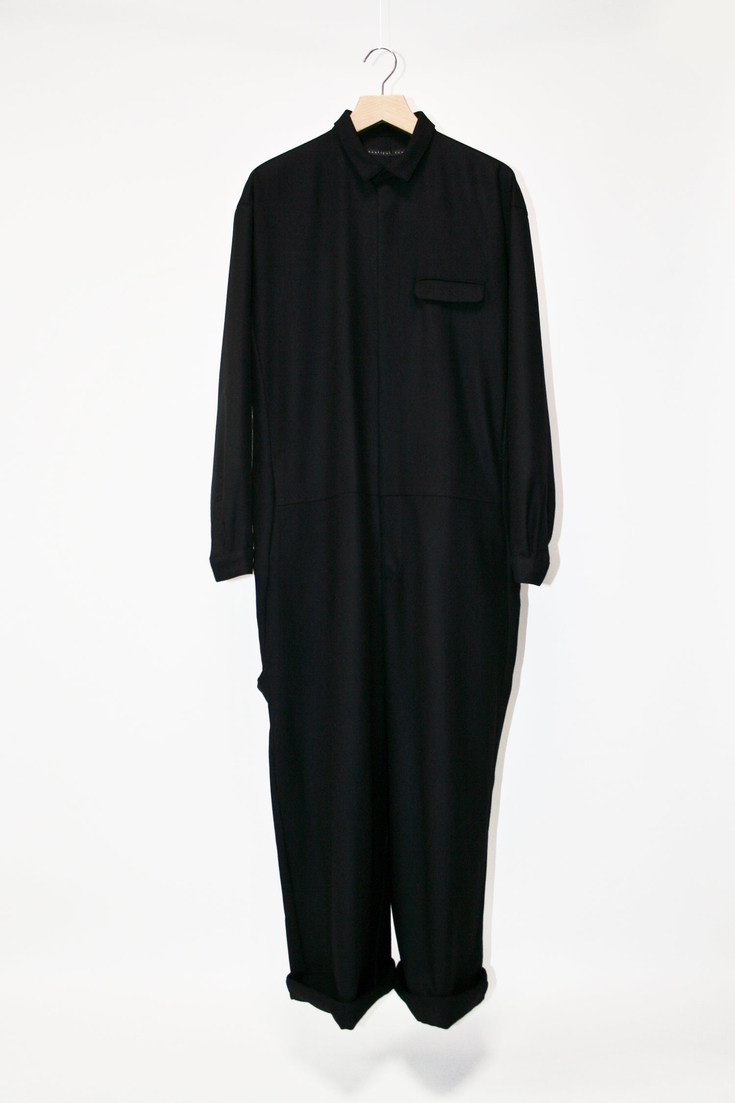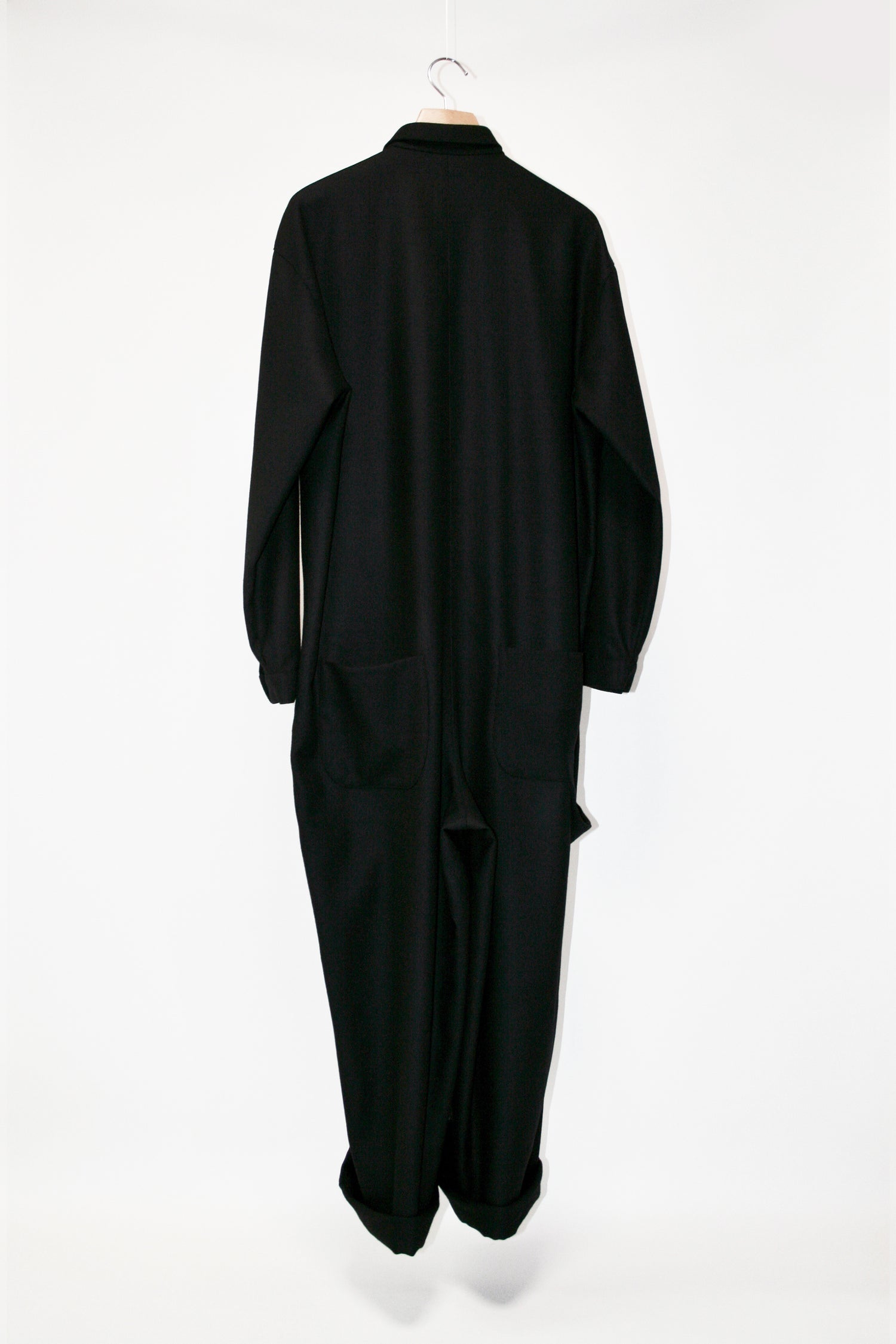 永久定番のジャンプスーツ。従来のフラノの素材にはない縮絨工程を経て、ソフトなフラノに仕上げた生地。