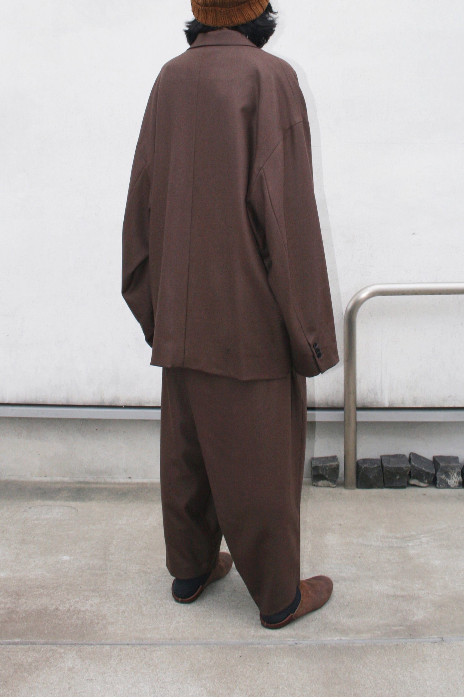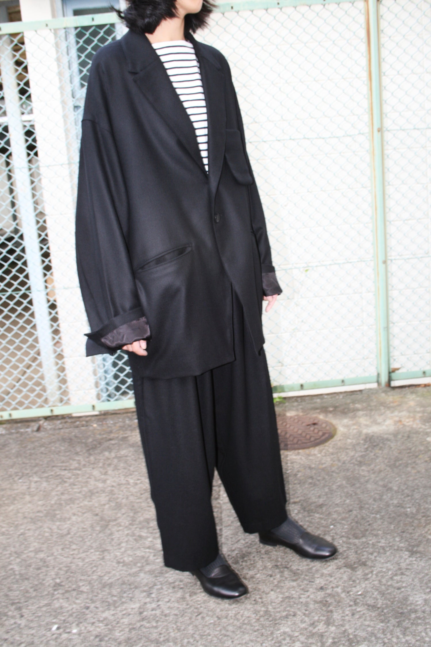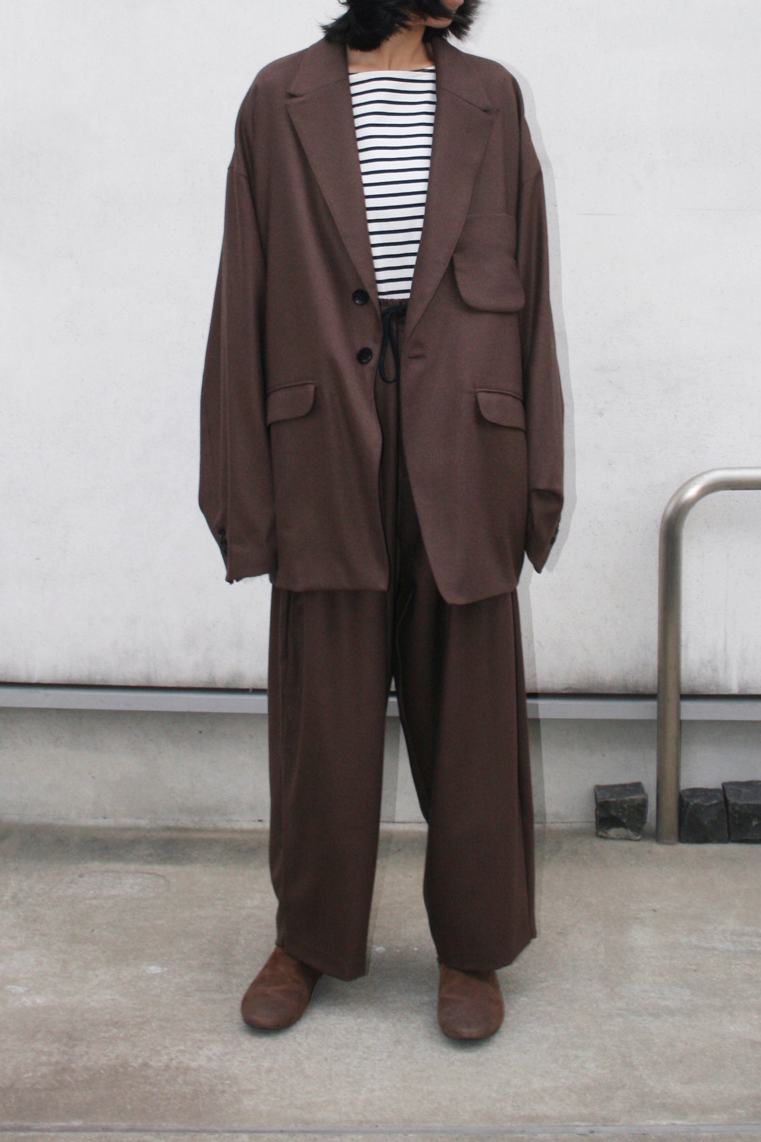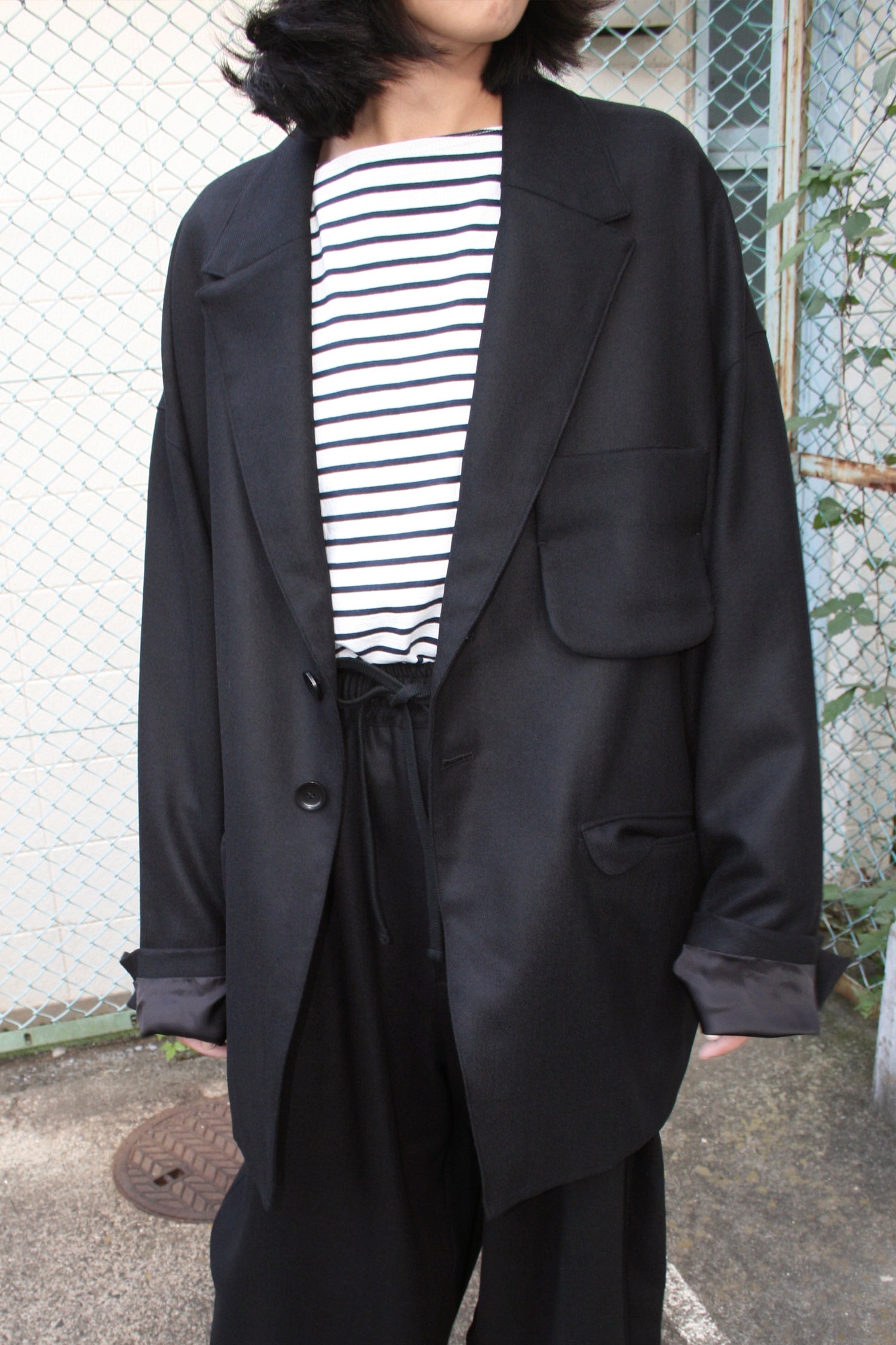 2釦ワイドドロップショルダーテーラードJK。立体的につけられた胸ポケットがアクセントになった一着。従来のフラノの素材にはない縮絨工程を経て、ソフトなフラノに仕上げた生地。身体から綺麗に離れる立体感あるシルエットのジャケット。ゆったりとしたシルエットでオーバーサイズを楽しめます。同素材のワイドイージーパンツとのセットアップもオススメです。