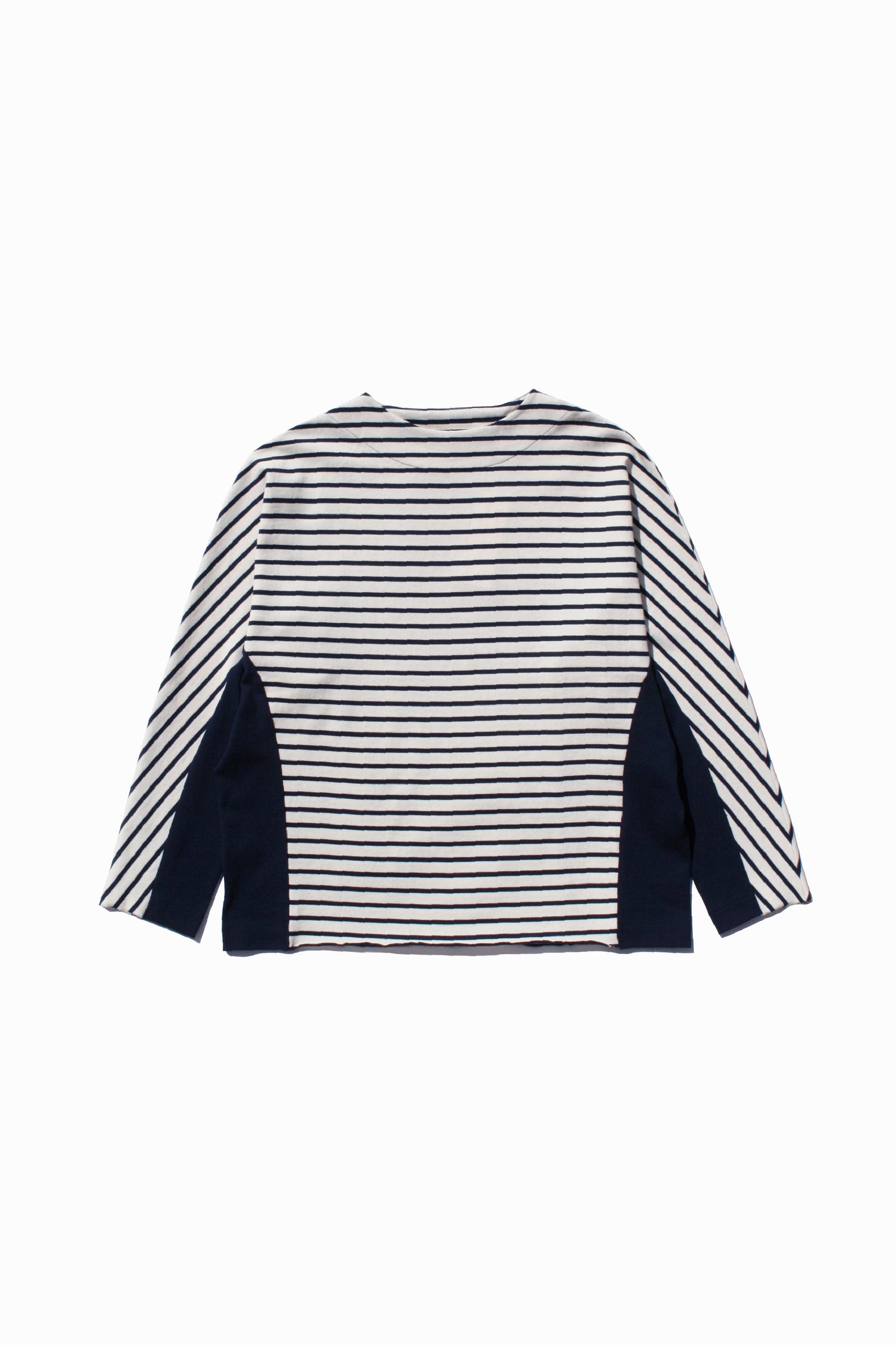 BD天竺生地を使用した切り替えロングTシャツは柔らかい。断ちにこだわり、他にない柄合わせとなりました。着やすさを考慮した設計です。部分的にカットオフした事により一般的に優等生になりがちなボーダーとは違ったらラフさが特徴です。ドルマンタイプのスリーブでゆったりとしたフィット。暖かな季節にアウター的感覚で着られるバスク長袖Tシャツ。ユニセックスでお使いいただけます。