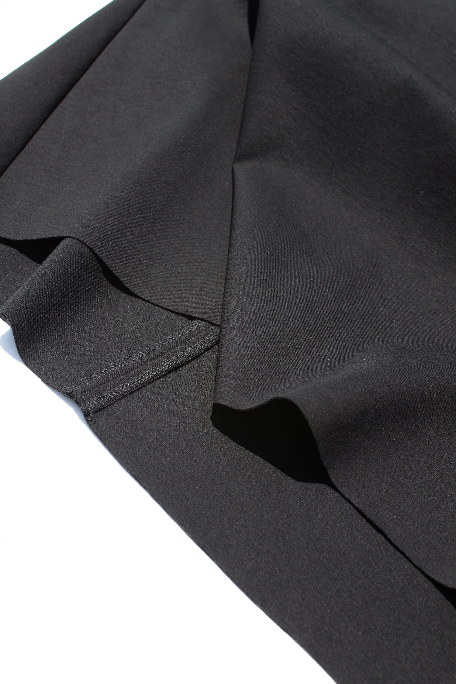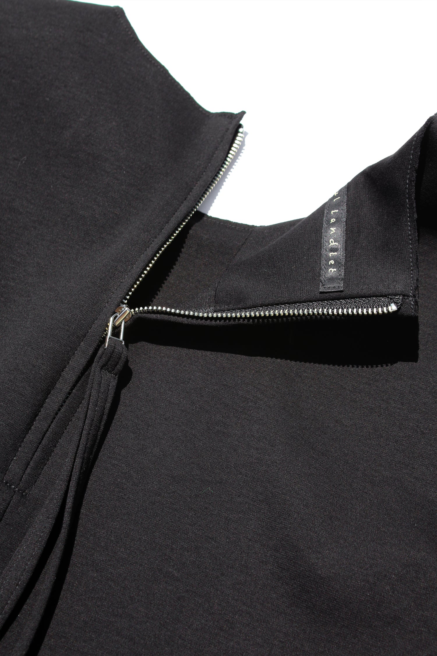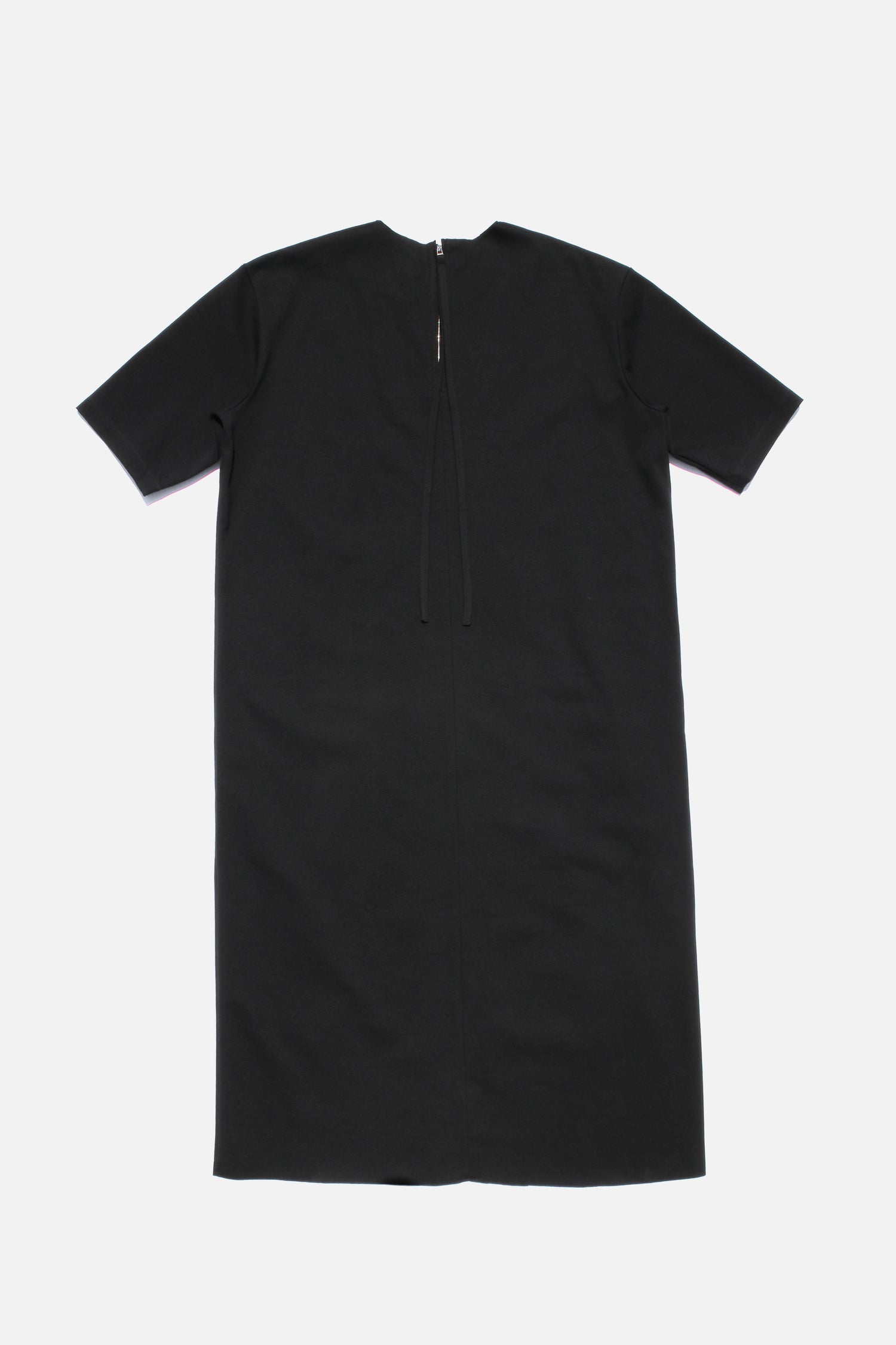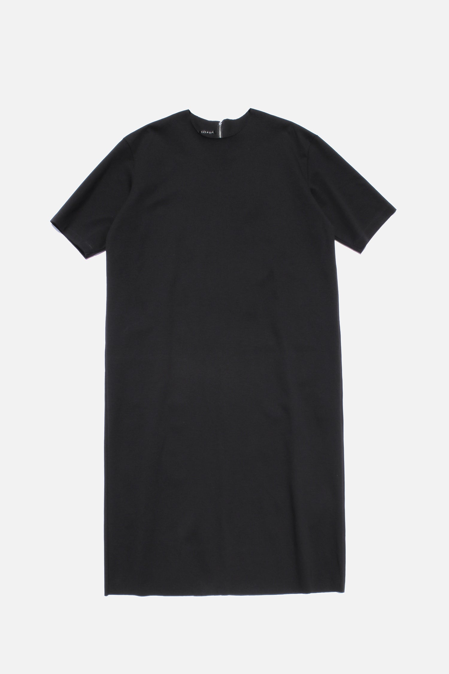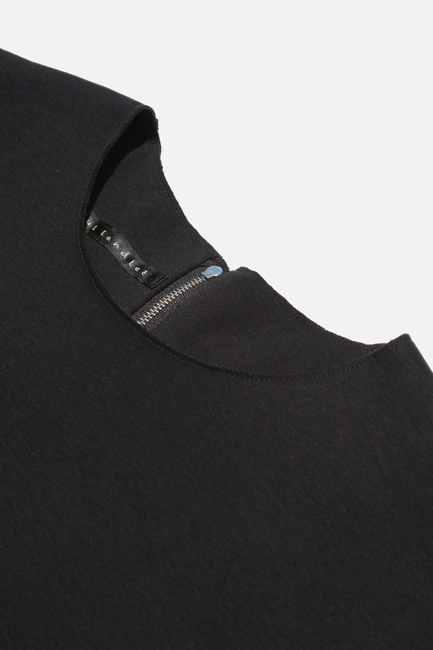 A dark shape, short sleeves one-piece with a practical zipper at the back of the neck. It is composed entirely of a soft and dense cotton-polyester blend. The cut is loose. This one-piece works in all seasons and many moods.