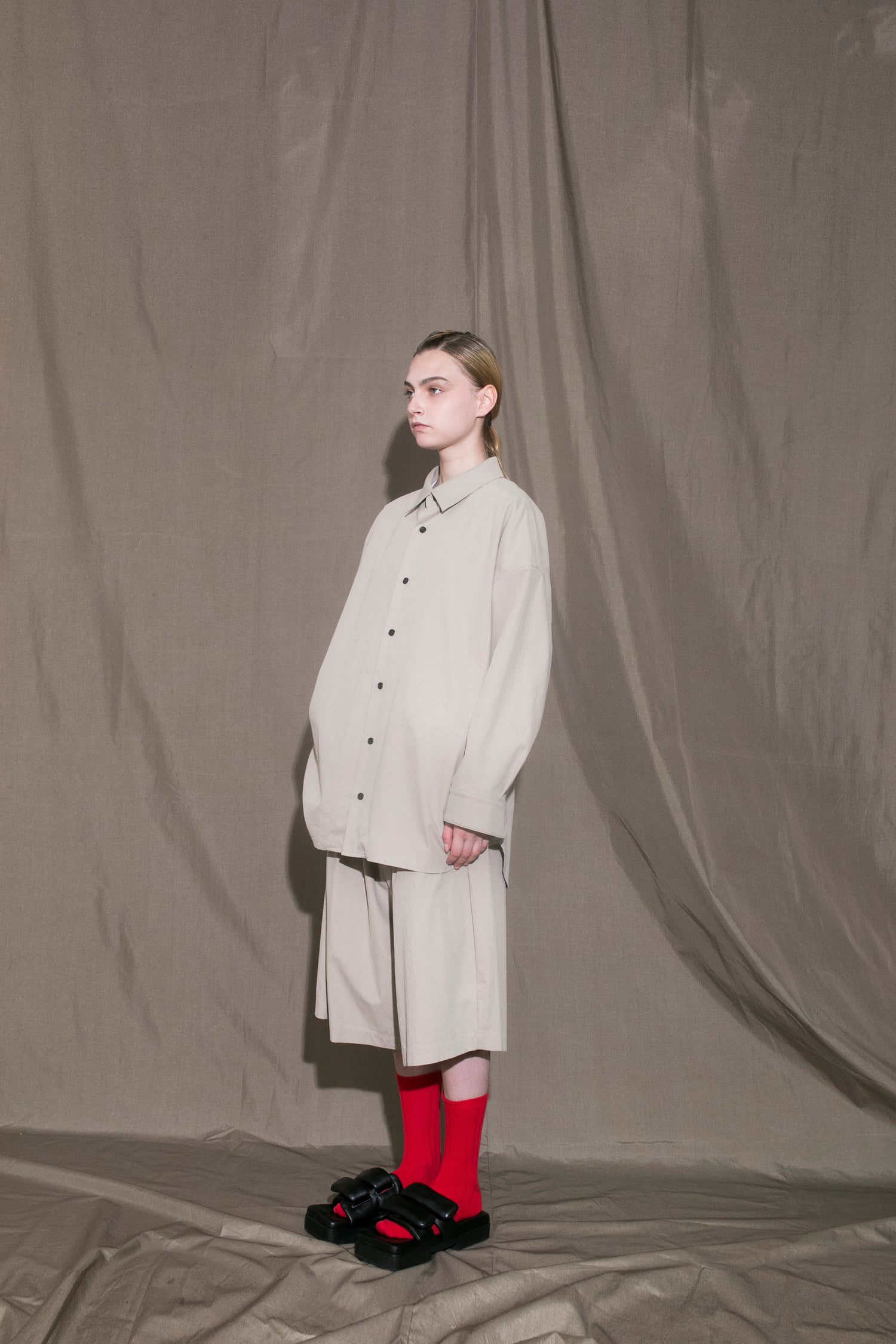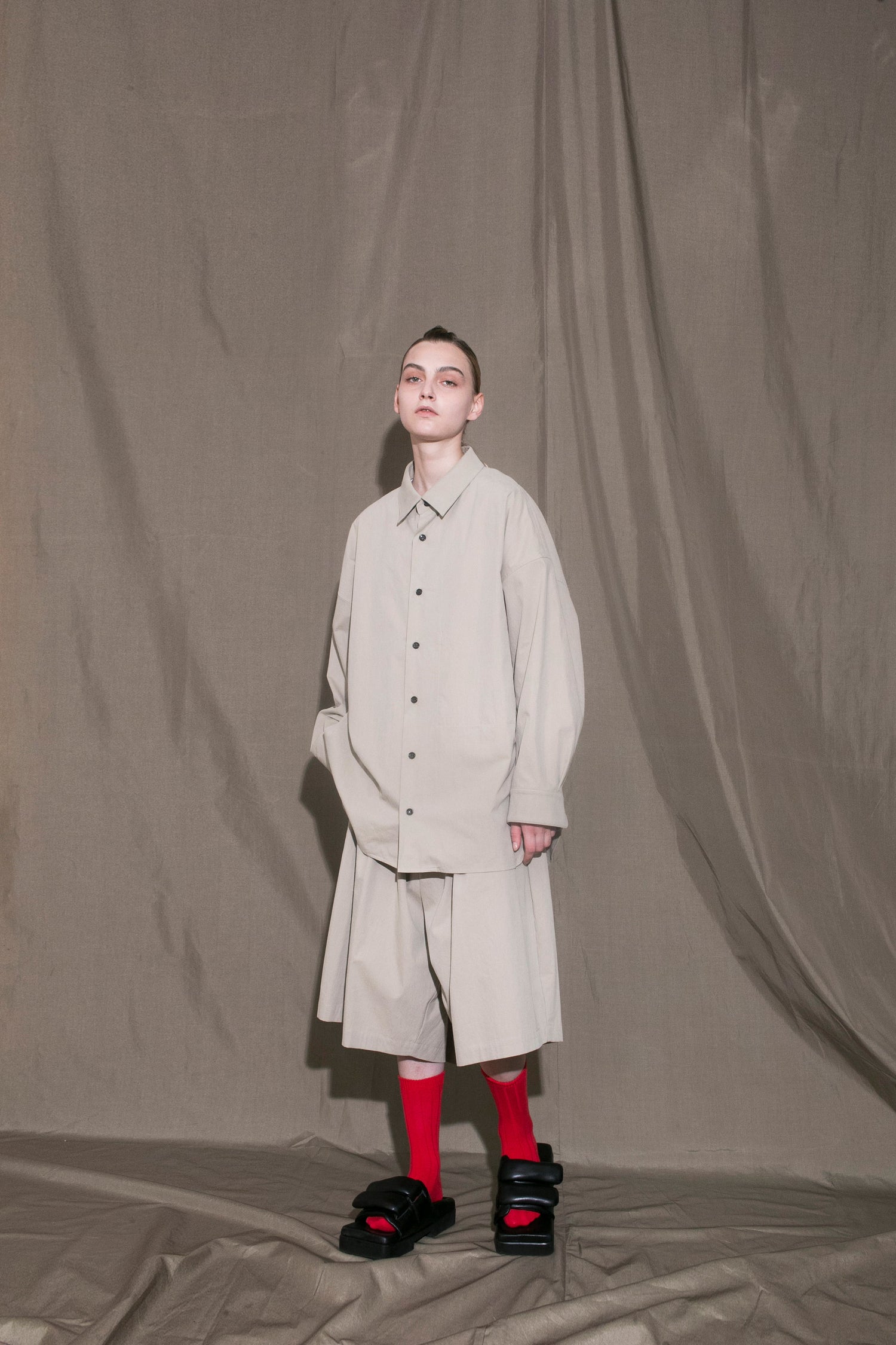It turns out as my beautiful landlet’s new cycle of loose shirt in beige. It’s made from cotton and nylon blend, that is bio-processed to emanate its softened texture. Amid of all the romantic beauty wideness and frankness show up, including the unexpected ‘fake cuffs’. A calm, simple and precise design which can function as its own kind of meaning. Great garments can affect one's life.