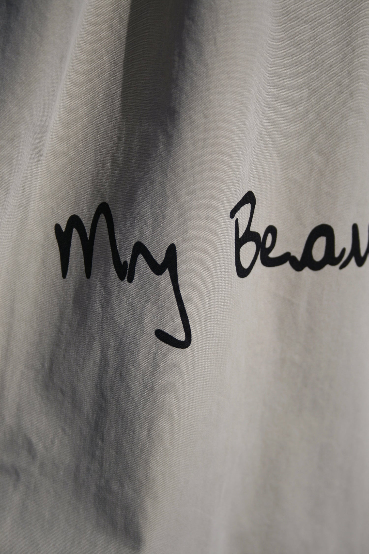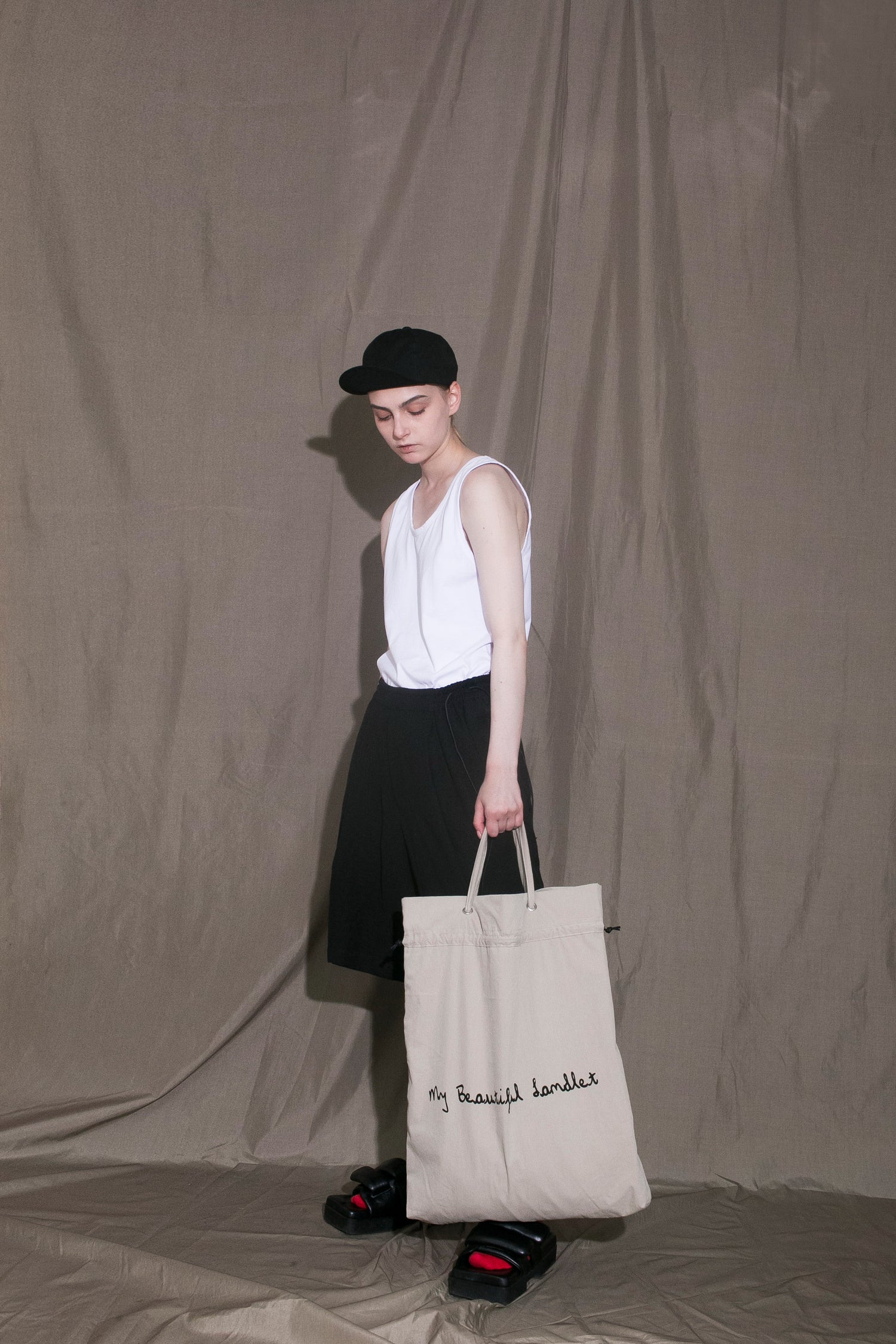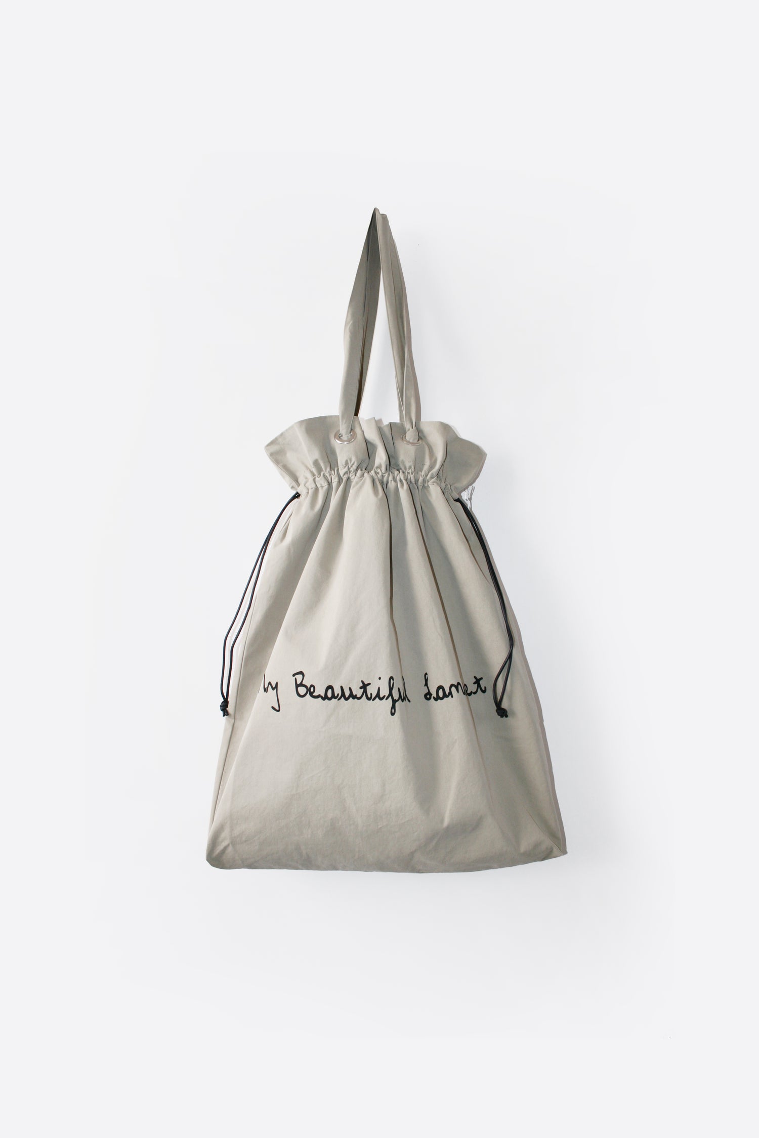 Big tote bag, with a printing logo “my beautiful landlet” and a long double strap, is crafted by bio-processing soft cotton and nylon. You could carry the tote by hand or on the shoulder by adjusting the strap length inside and controlling the mouth with a drawcord. Two colors are available for men and women.