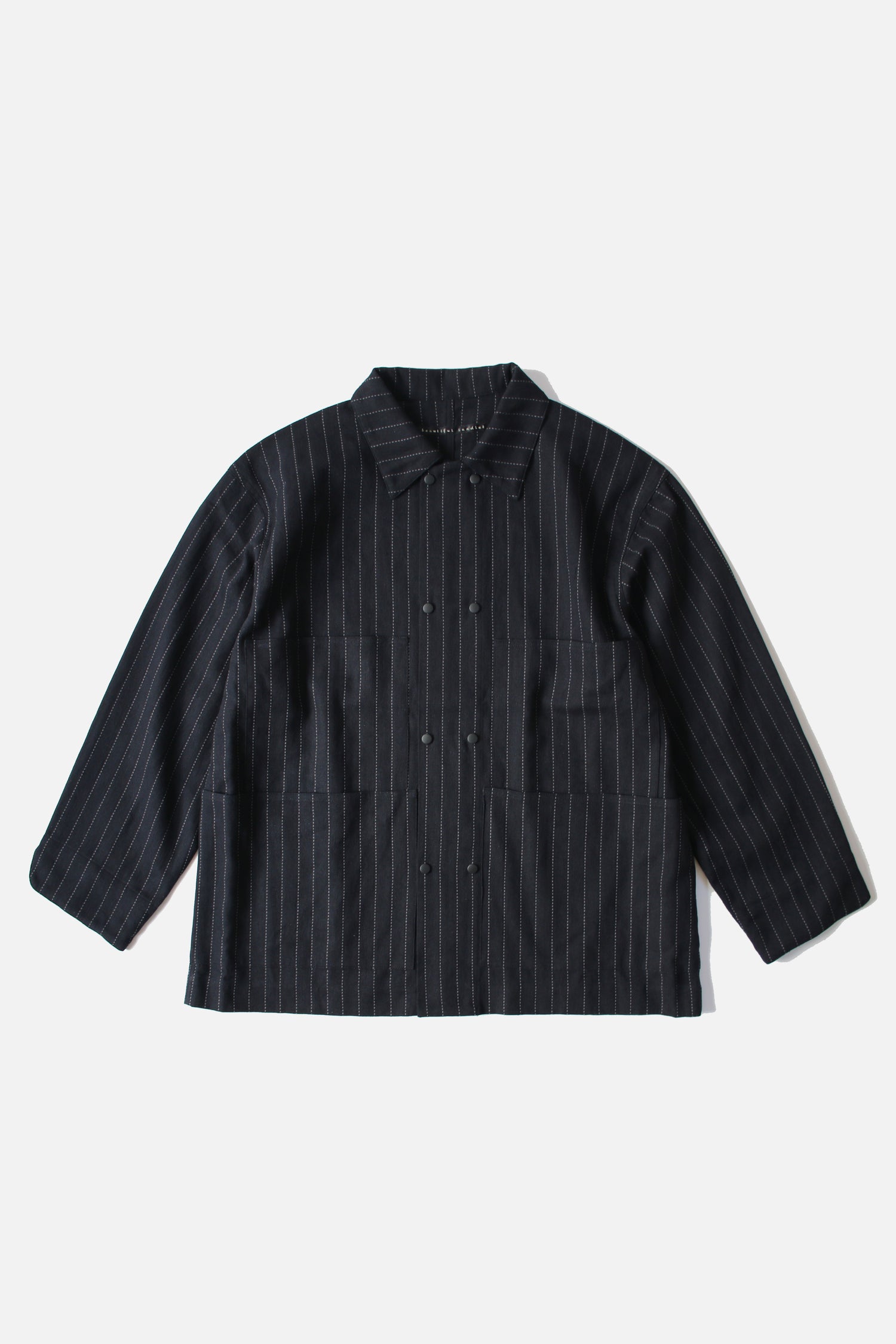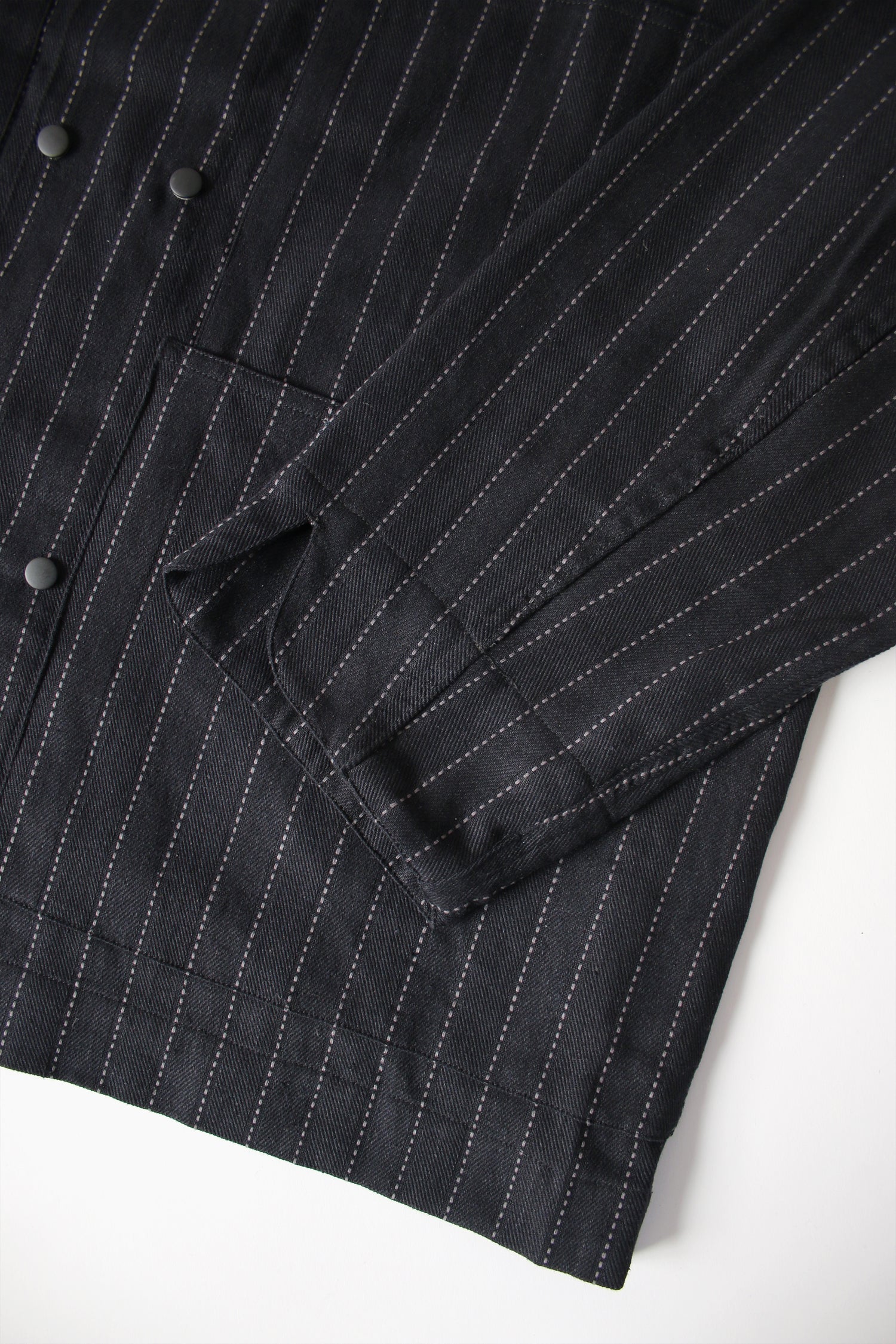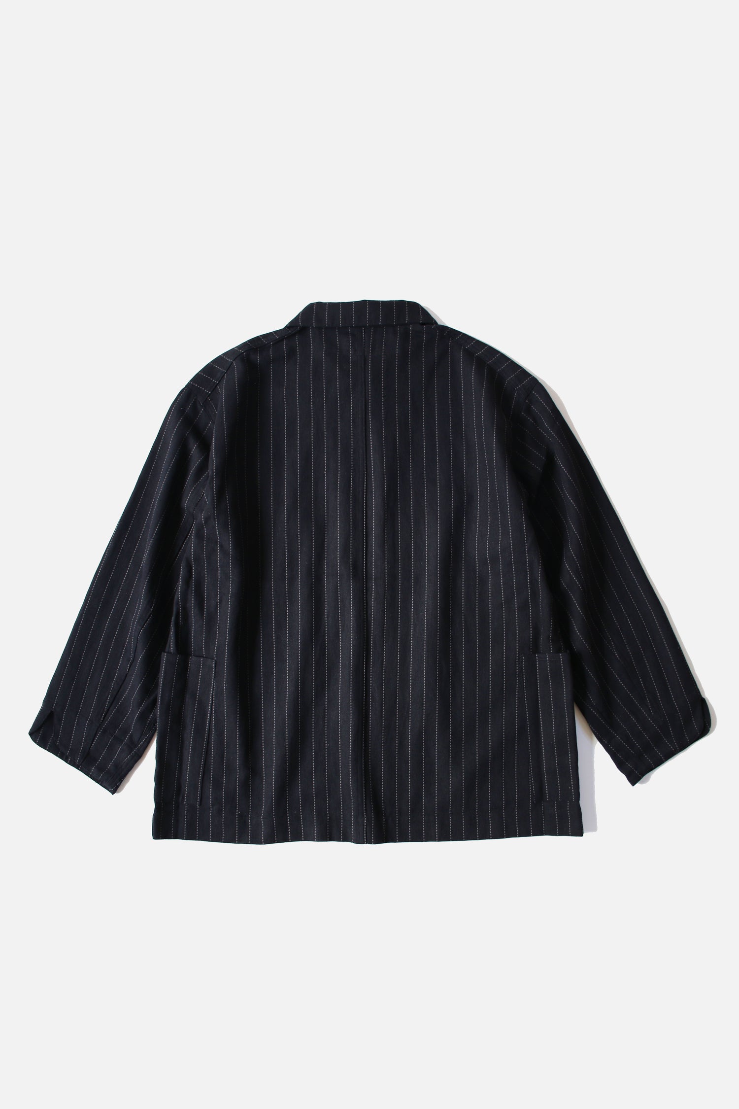 A multi-pockets jacket is characterized by the workwear nature and A-grade striped fabric. Features double row of buttons. Black only.