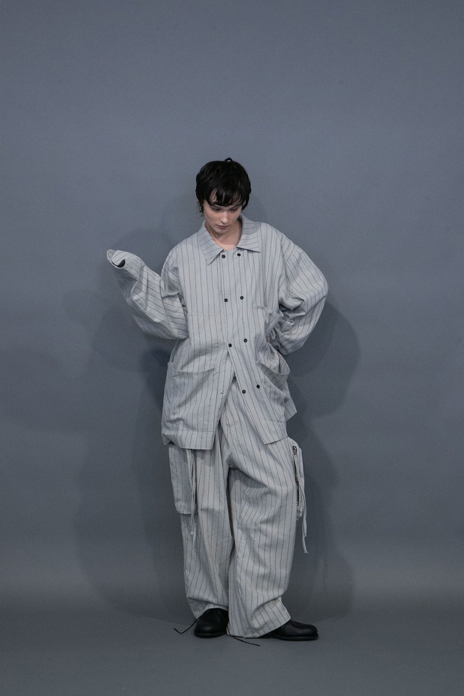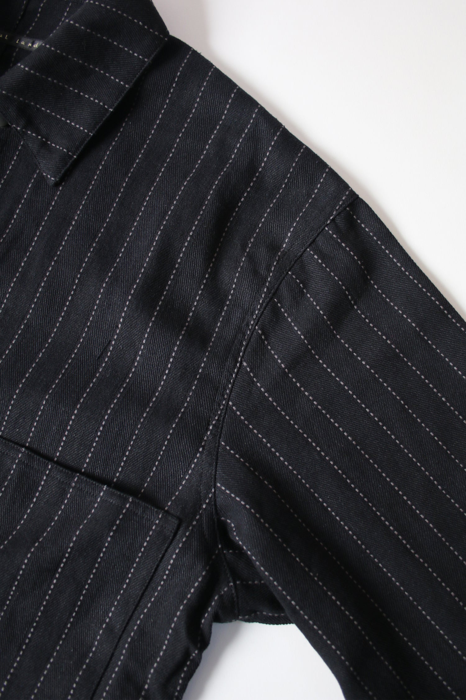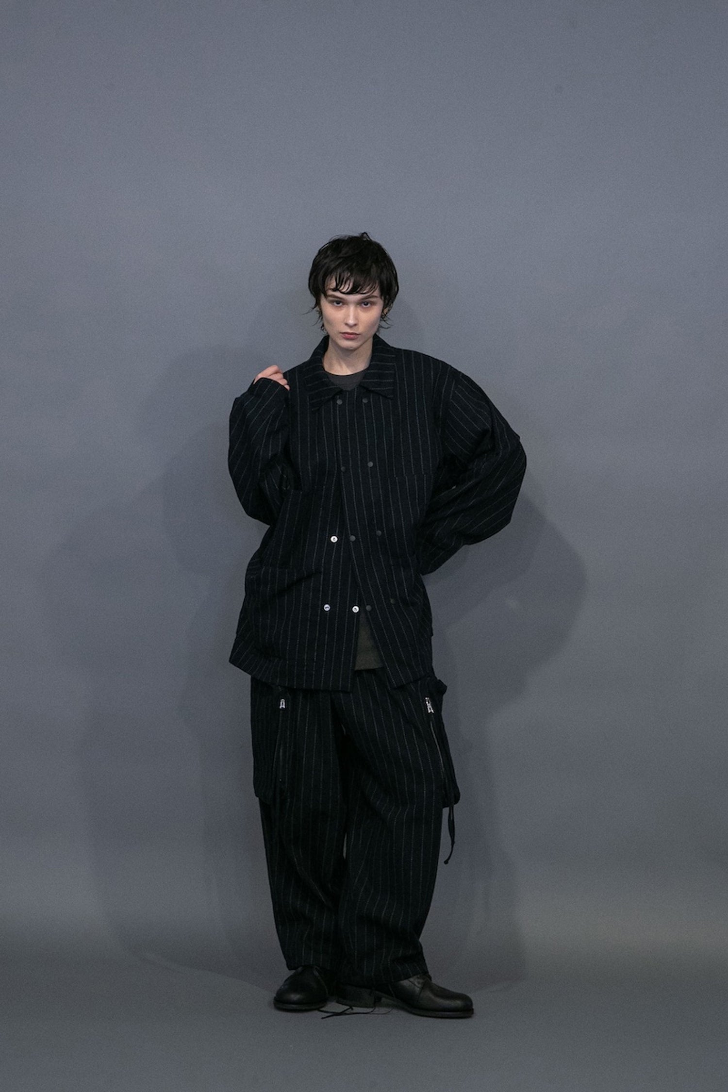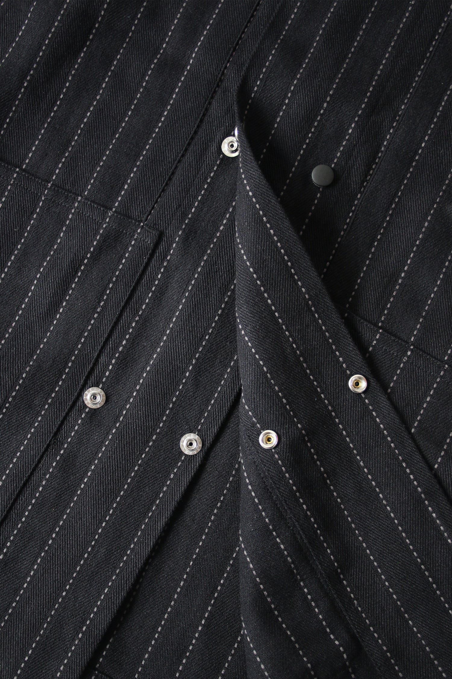 A multi-pockets jacket is characterized by the workwear nature and A-grade striped fabric. Features double row of buttons. Black only.