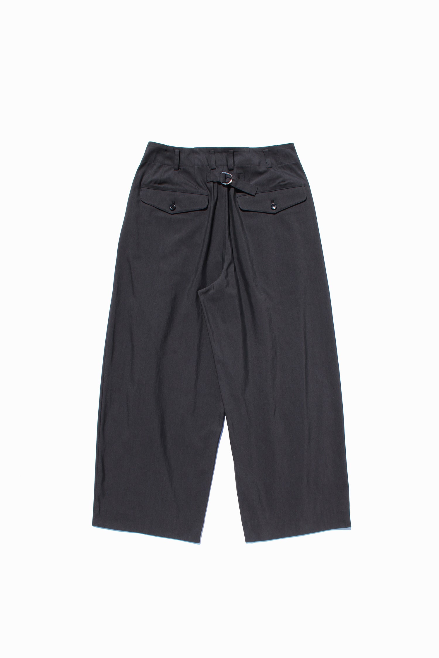 使い勝手抜群、9分丈のワイドパンツ。シャリ感のあるタッチが特徴的なギャバジンに仕上がりました。液流染色による独特なシボ感が特徴な生地ですで、オールシーズン対応な素材となります。フロントタック、バックシンチが特徴。綺麗めにも、カジュアルにも。奥深さと雰囲気のある一着。(※このデニムパンツはホワイトベルトは含まれていません。)
