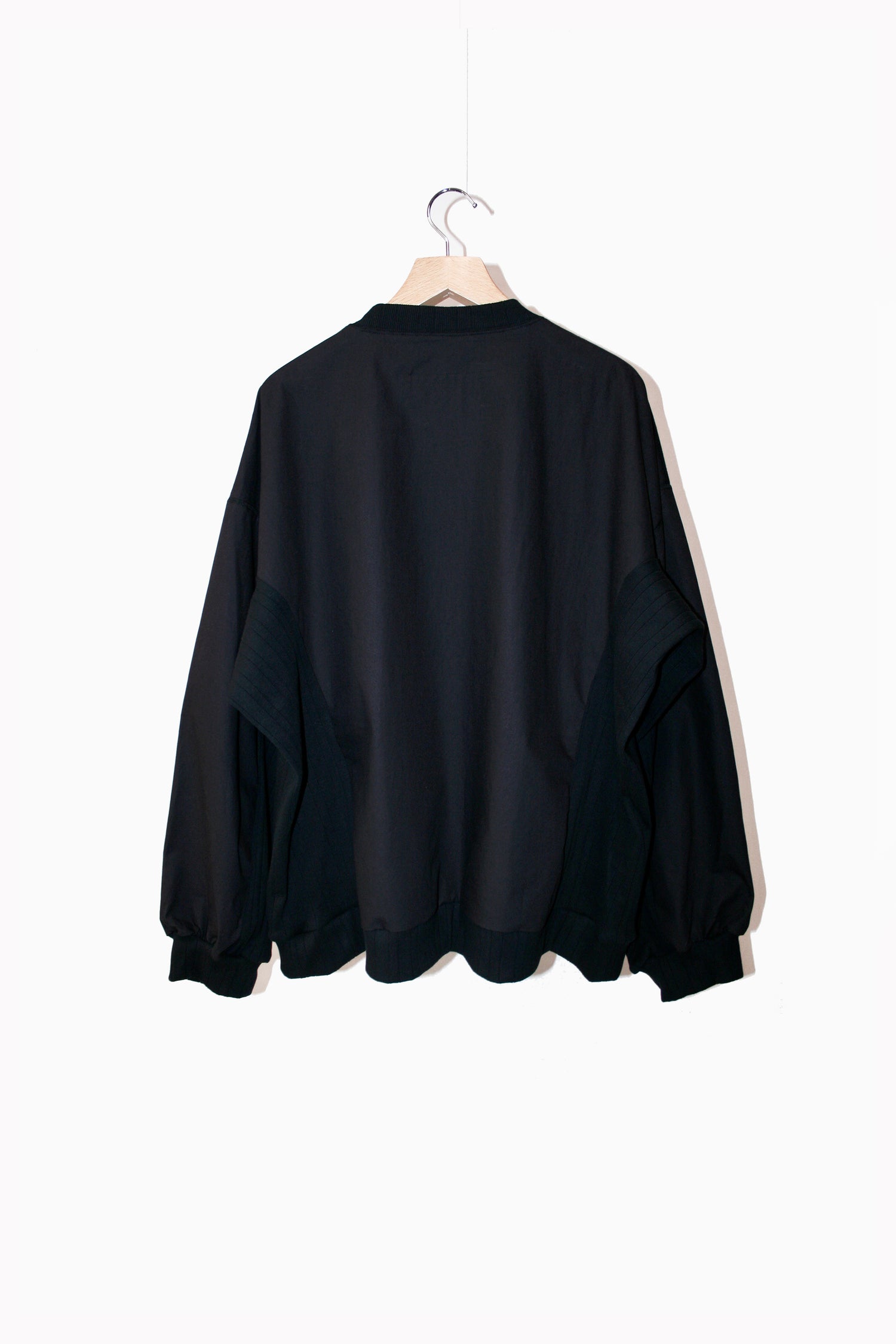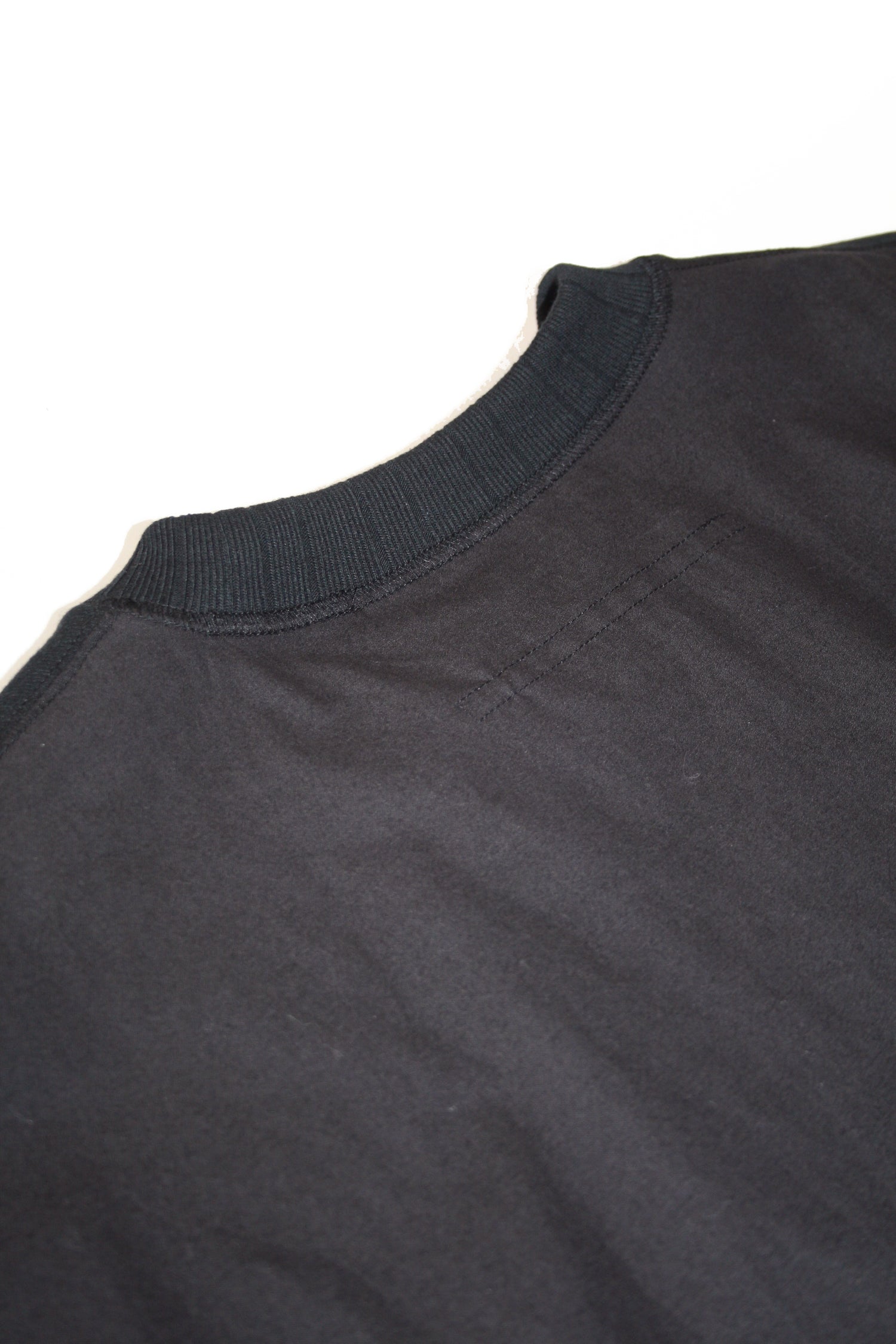 3種類の素地をMIXしたルーズフィットスウェットトップス。フロント:スウェット、バック:バフ、腕内側~サイド:リブ で切り替えしたデザイン。吊り編み機によって編まれ、空気を含んだ独特な膨らみのある吊り裏毛と、耐久性の高い馬布にウォッシュ加工を施した生地を使用。軽い着心地で、裏毛特有の優しい肌触りの1枚。両サイドについたハンドポケットは、実用性も兼ね備えています。(おすすめアイテム):ブラック吊り裏毛馬布パンツ。。