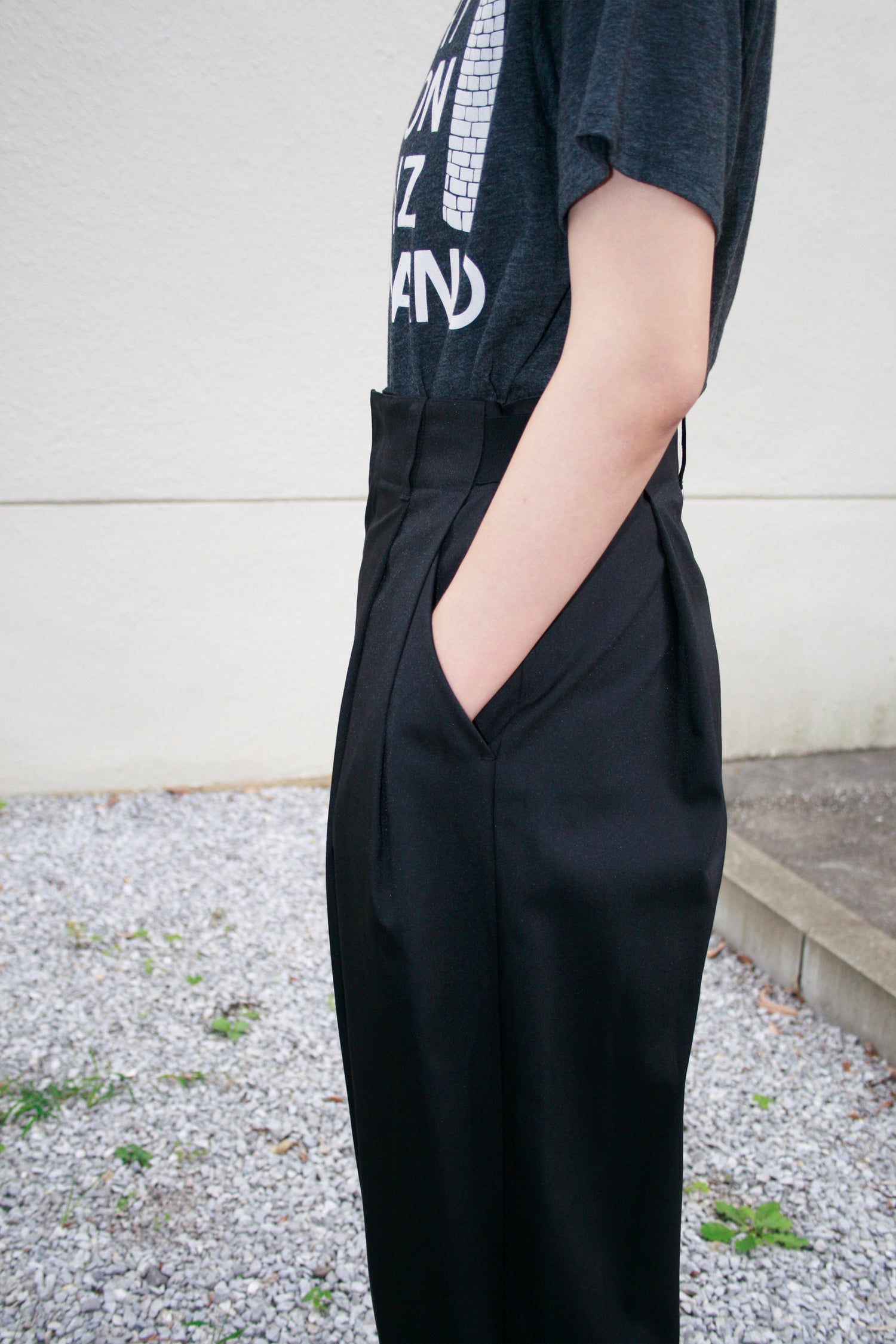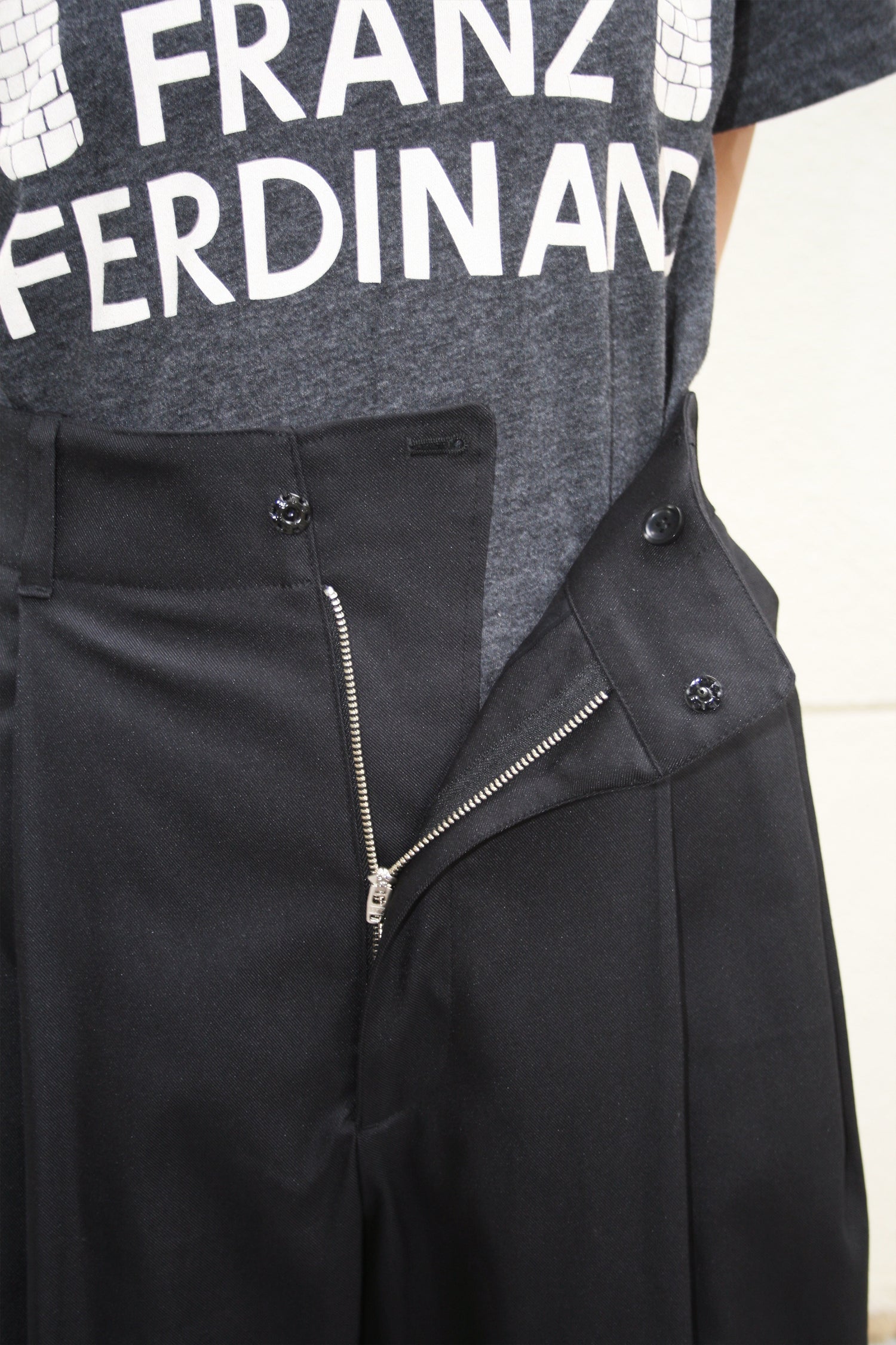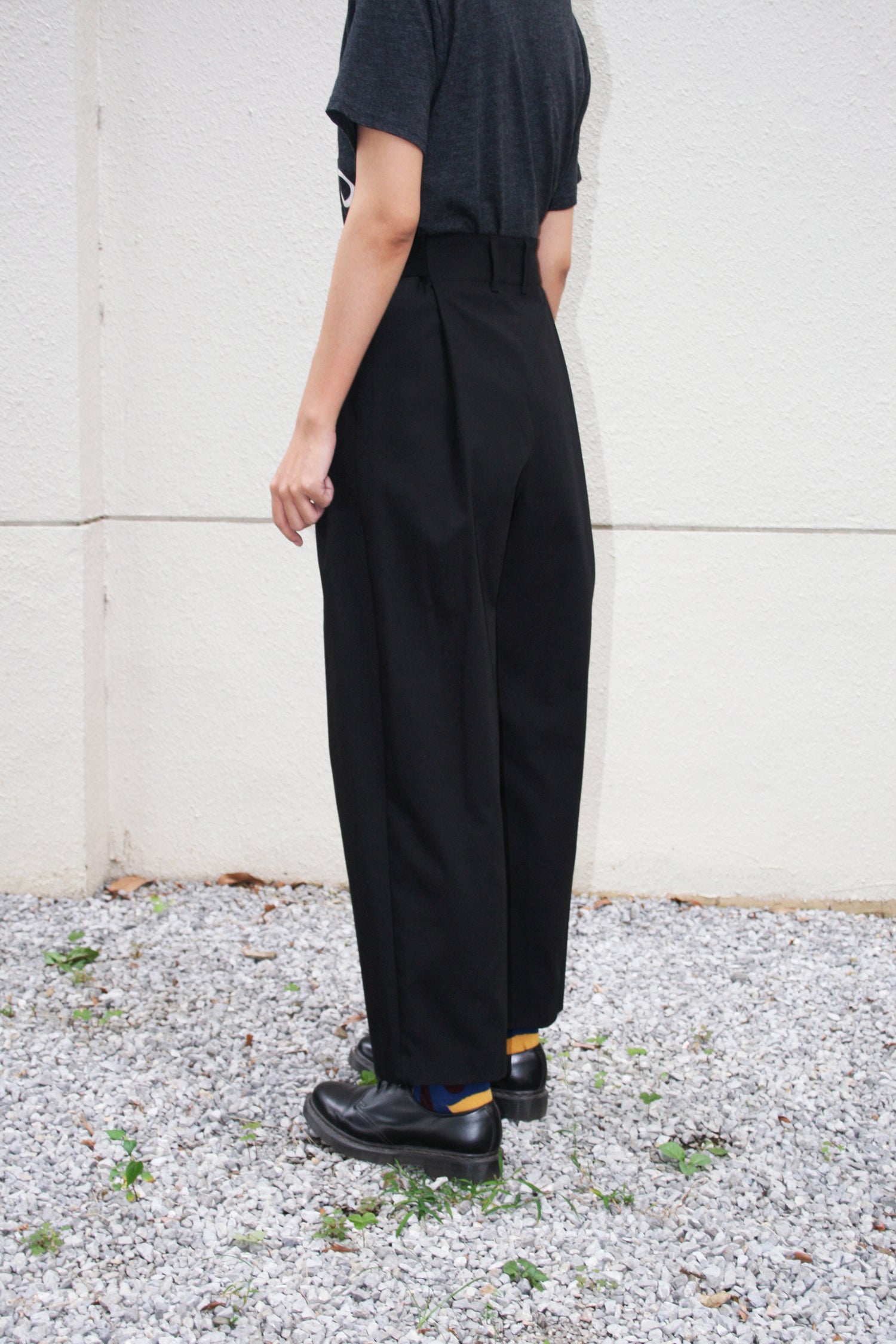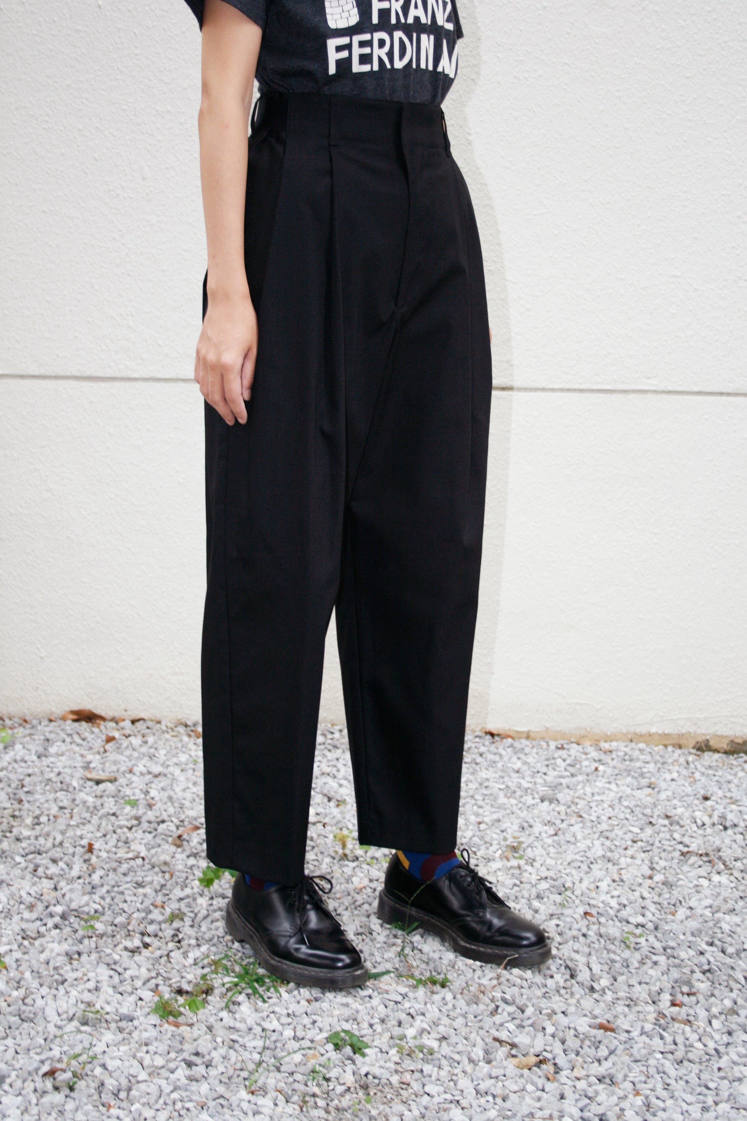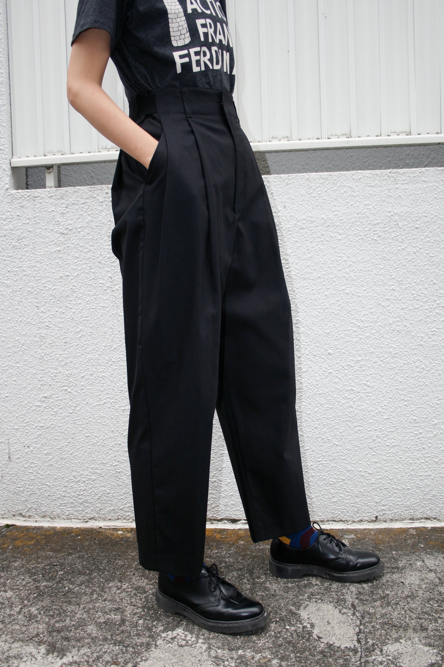 Favourite MBL gabardine 2-tuck pants with clean and beautiful line, more primed for the office and afterhours. This easy, versatile pants has a slightly tapered leg with a loose, relaxed fit. Features include two rubber bands on the waist and duo subtle slanted pockets. You can playfully wear it from Autumn to Spring.